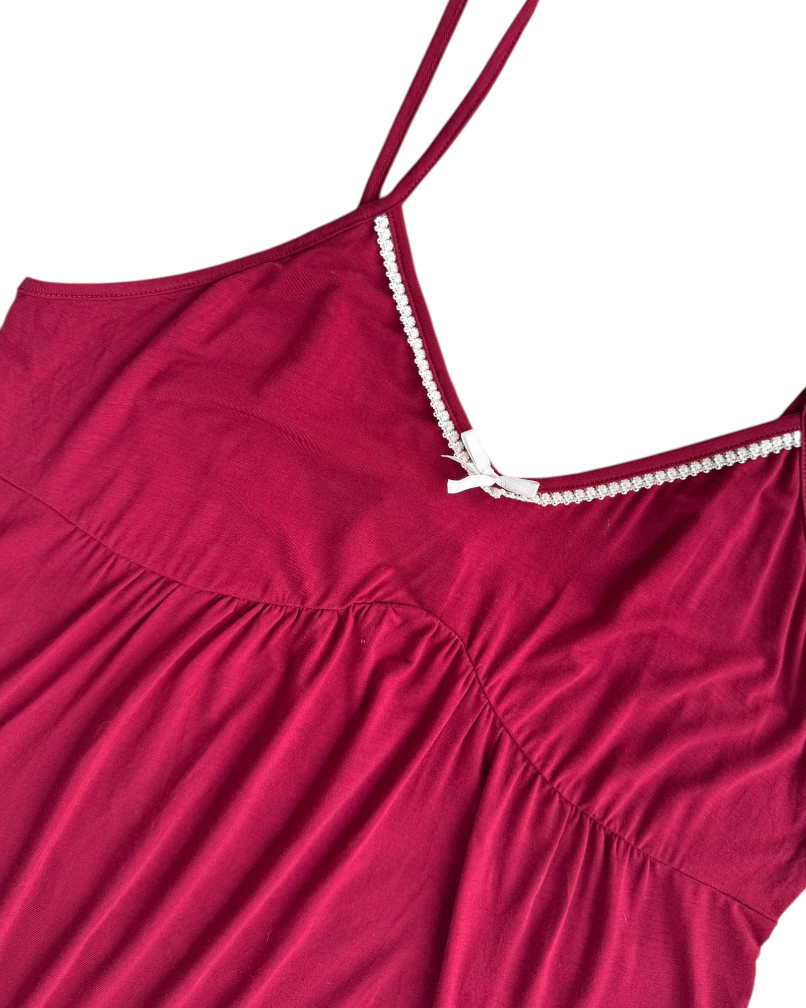 TOP 95% RAYON 5% SPANDEX ROJO CEREZA CON DOBLADILLO DE ENCAJE BLANCO MINI Y MOÑITO EN EL CENTRO DEL PECHO, TIRANTES AJUSTABLES. EN BUEN ESTADO