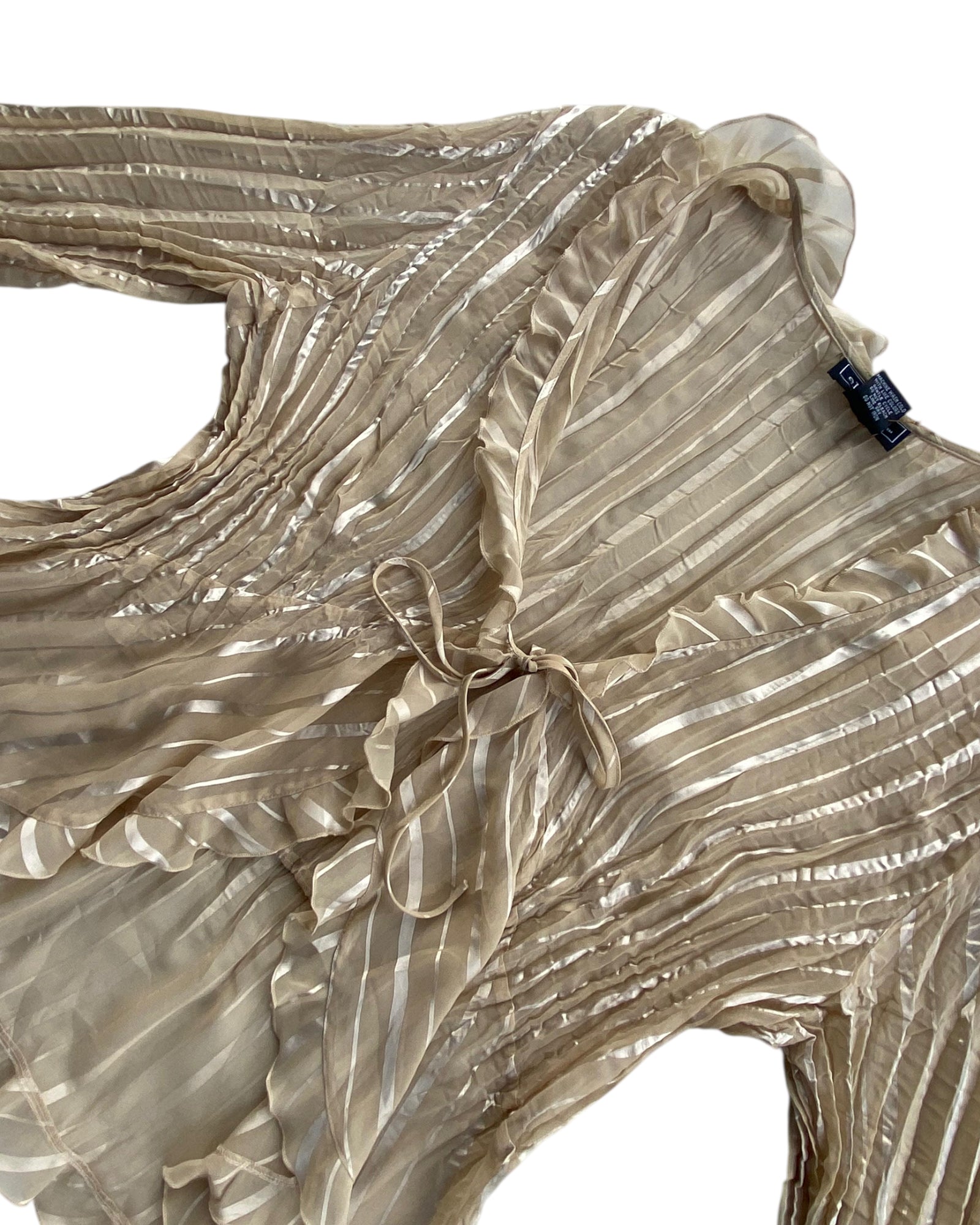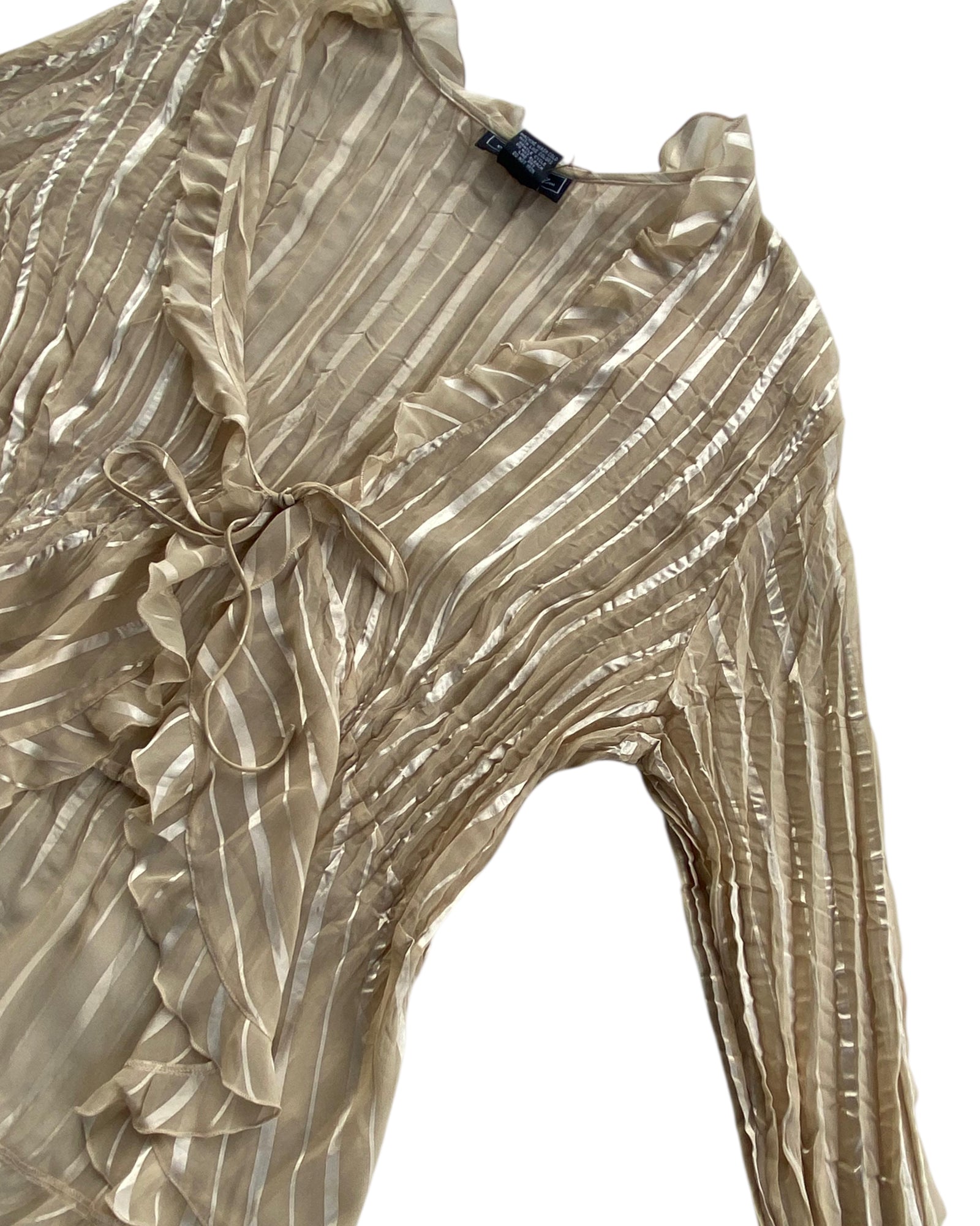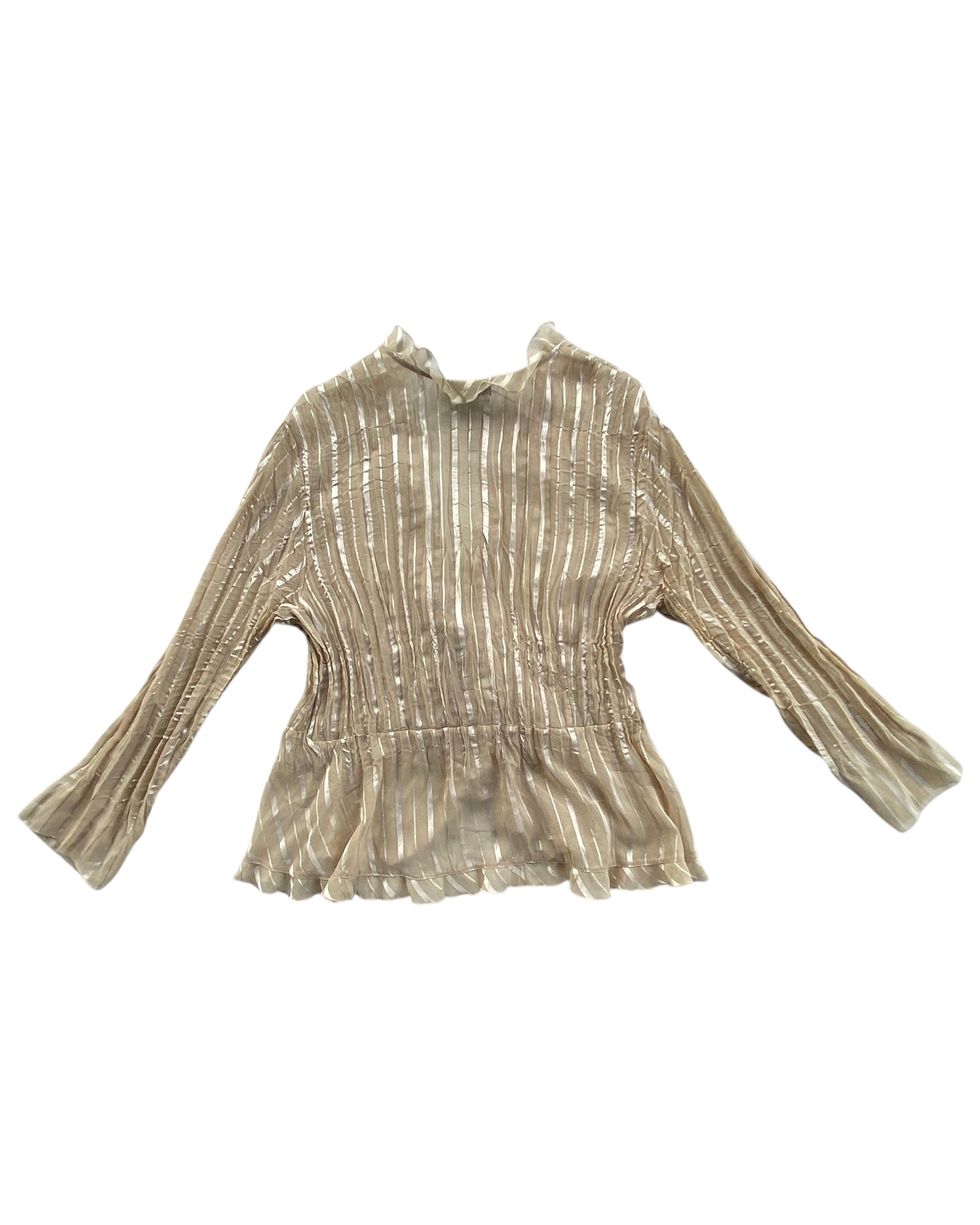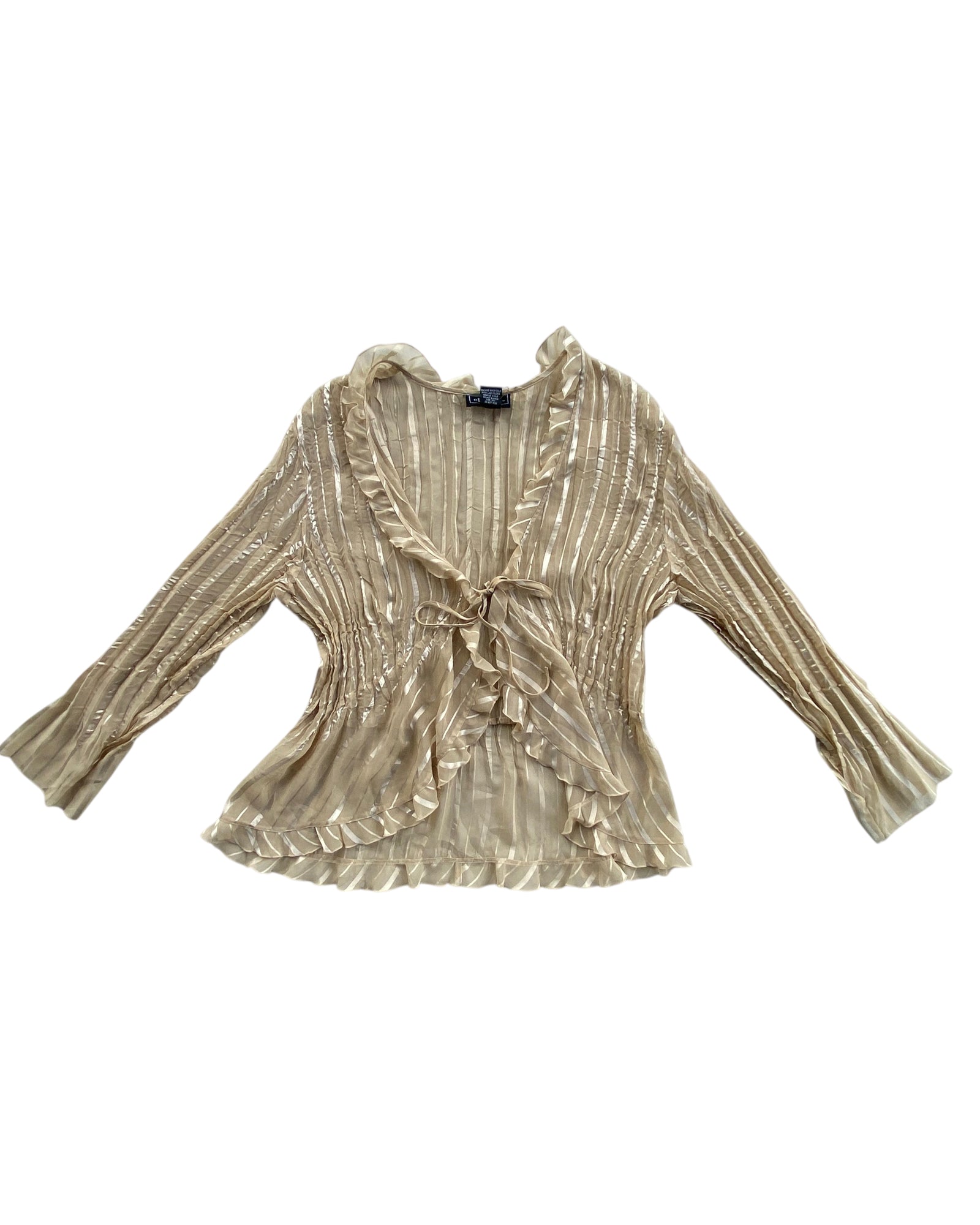 CAMISA MANGA LARGA CON PLISADO VERTICAL EN COLOR DORDADO, SE AMARRA AL FRENTE CON LISTONES Y ES TOTALMENTE TRANSPARENTE. 100% POLYESTER. EN MUY BUEN ESTADO.