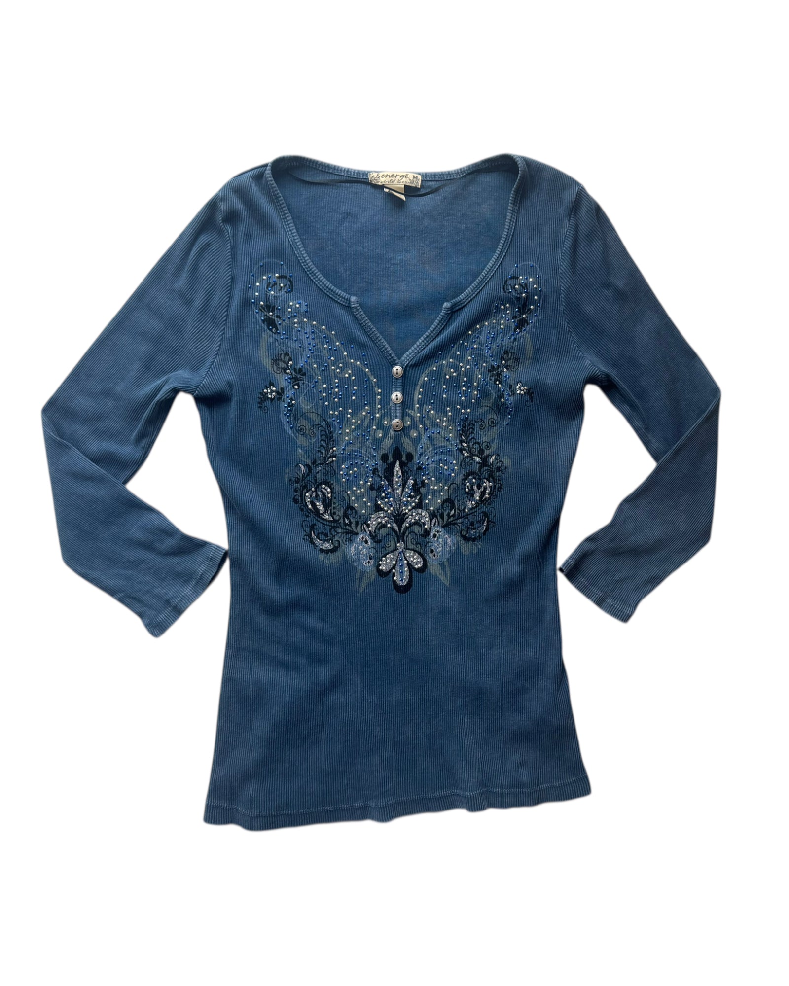 PLAYERA DE MANGA LARGA EN COLOR AZUL BOBALTO CON DESLAVADO A PROPOSITO, TRES BOTONES PEQUEÑOS EN EL MEDIO DEL PECHO PLATEADOS Y PRINT DELANTERO ESTILO Y2K CON BRILLITOS PLATEADOS Y AZULES. 100% ALGODON. NO TIENE DETALLES, EN PERFECTAS CONDICIONES.