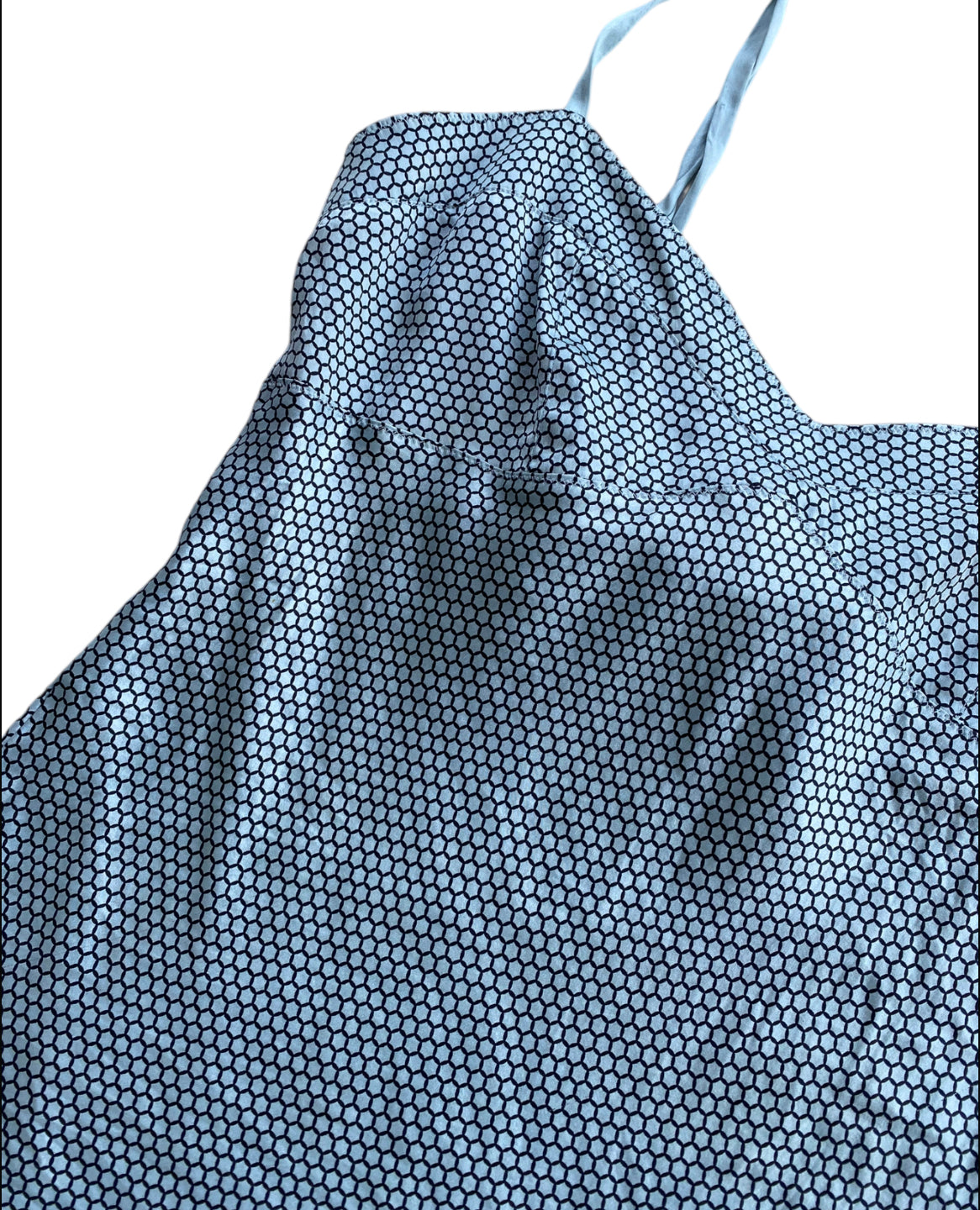 TOP CAMI 92% SEDA 8% SPANDEX AZUL CLARO CON PATRON DE ENJAMBRE EN COLOR NEGRO, TIRANTES AJUSTABLES Y CON PINZAS PARA CREAR UN ESTILO BUSTIER, NO TIENE DETALLES, EN PERFECTO ESTADO.