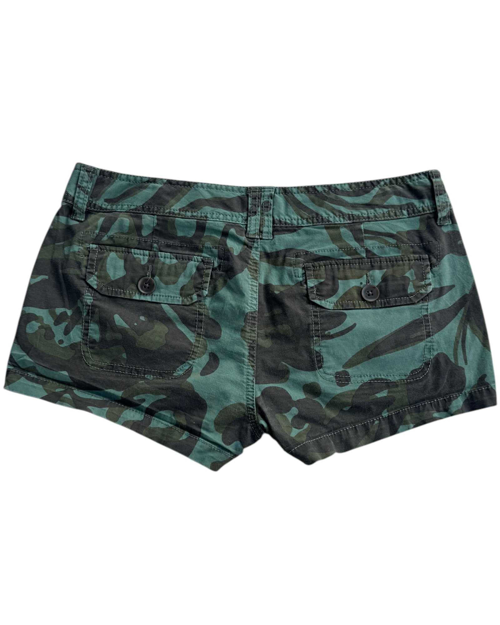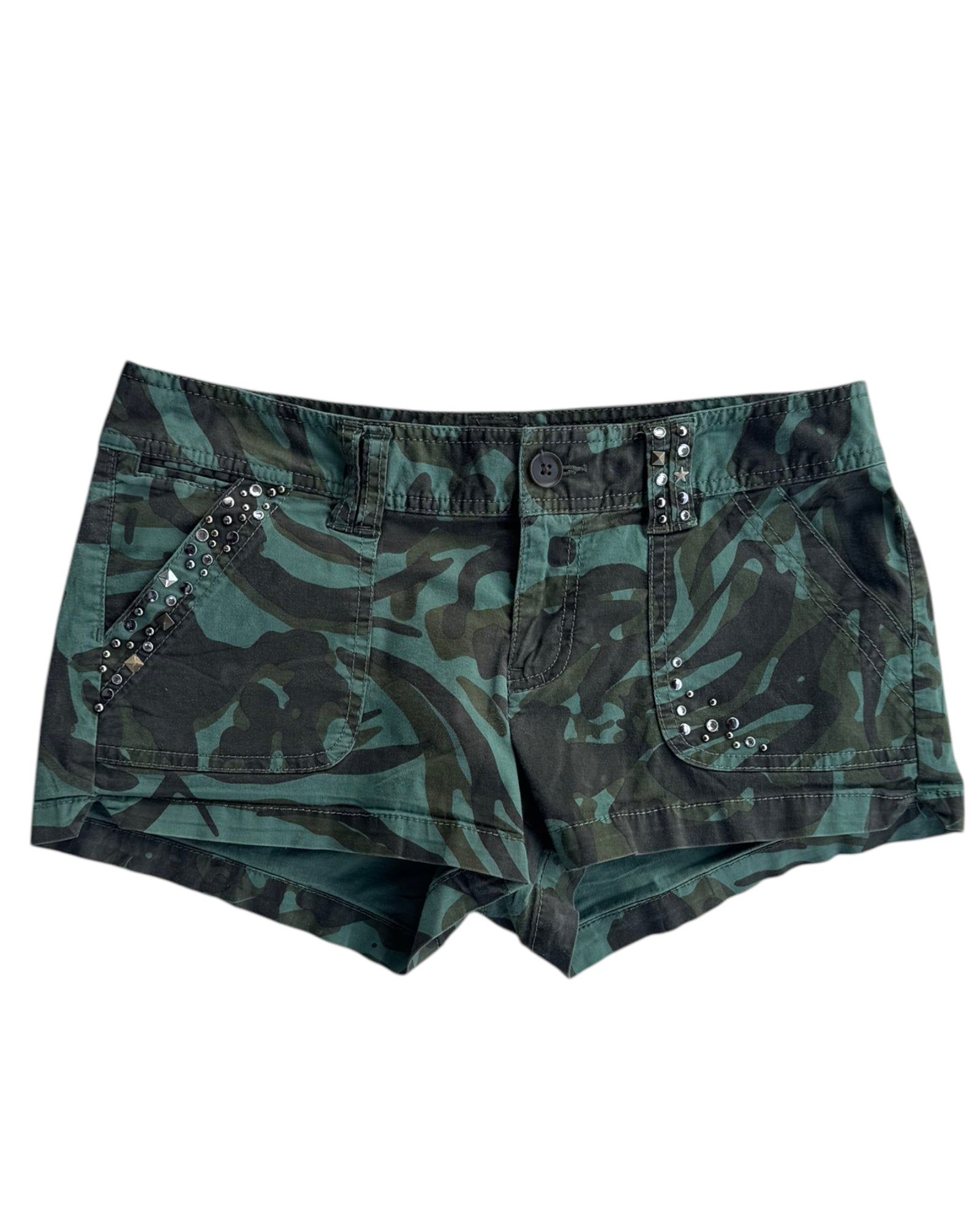 SHORTS CAMUFLAJE CORTE MINI, ESTOPEROLES PLATEADOS EN BOLSILLOS Y HEBILLA EN LA PARTE DELANTERA, BOLSILLOS TRASEROS FUNCIONALES. NO TIENE DETALLES.