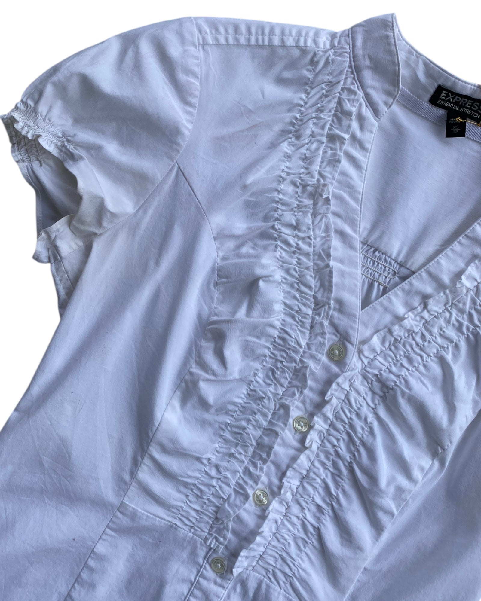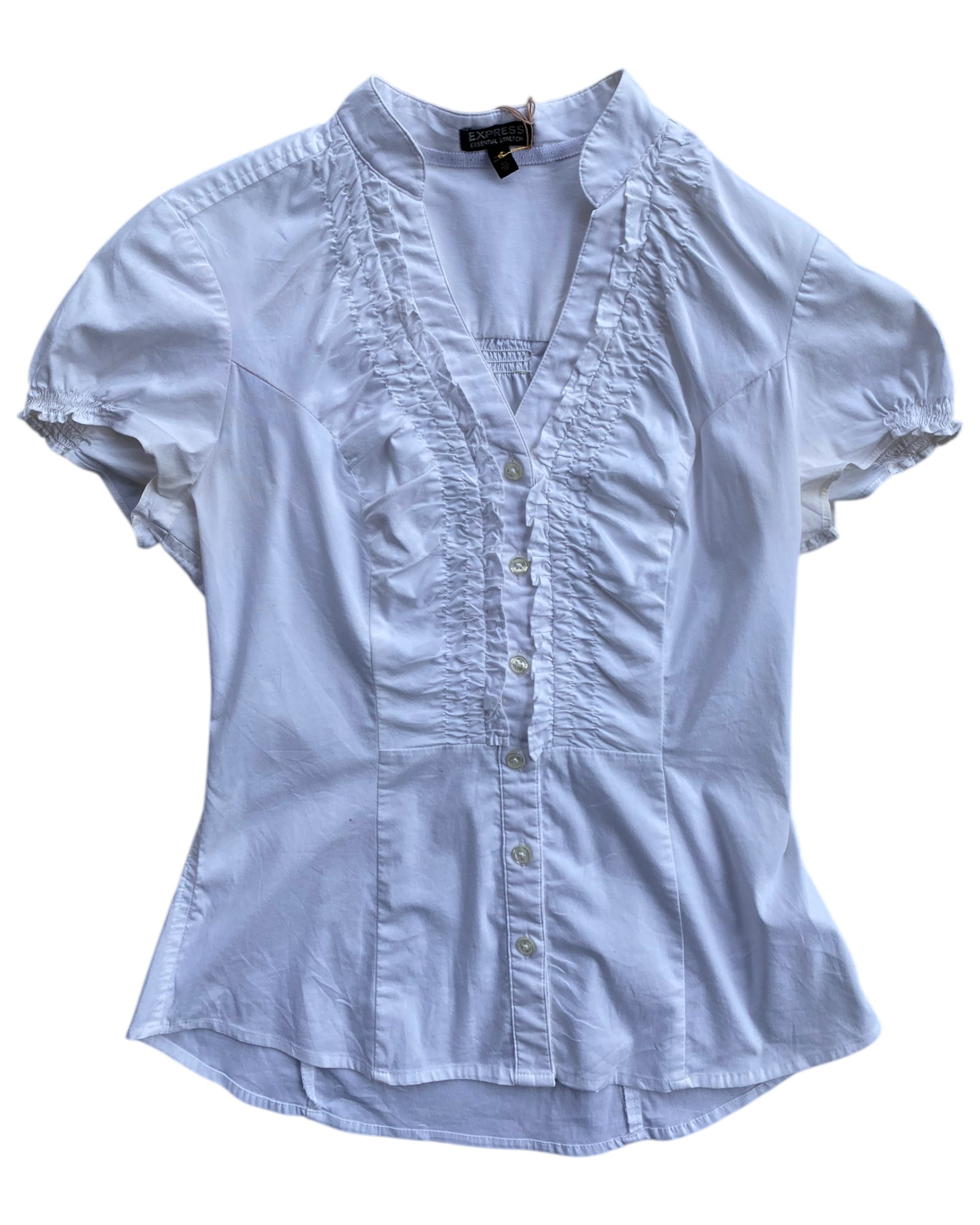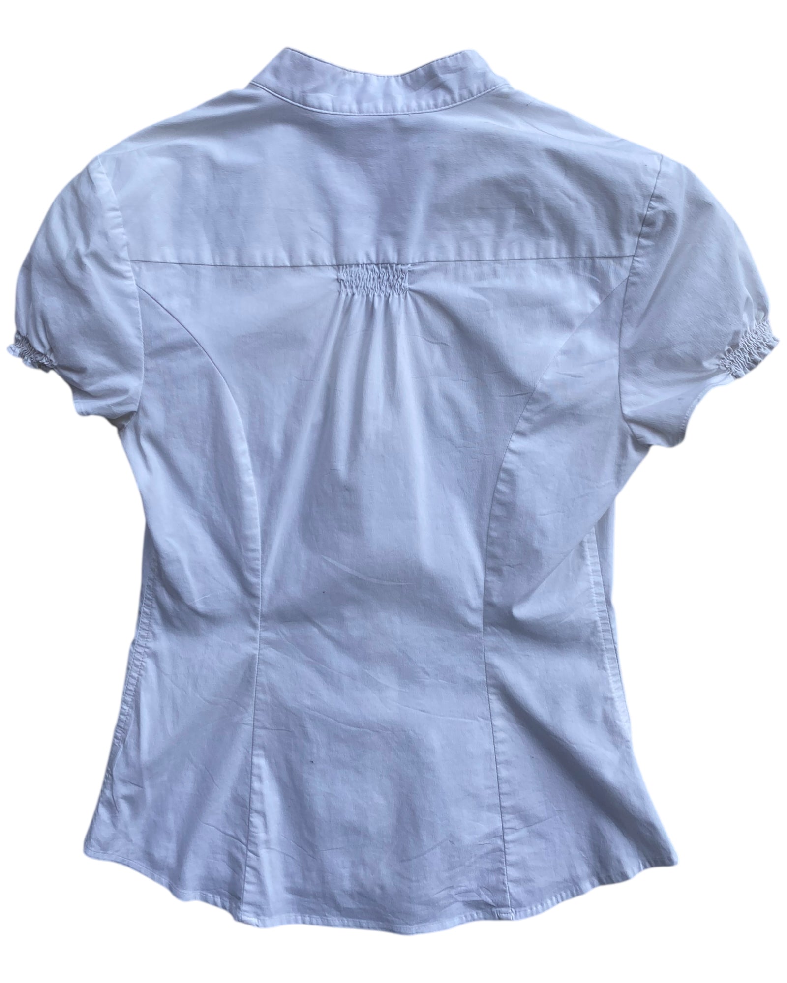 CAMISA BLANCA CON BOTONES EN MEDIO PEQUEÑOS Y RUSHING Y PINZAS PARA CEÑIRLA AL CUERPO, 60% ALGODON, 35% POLYESTER Y 5% SPANDEX. EN MUY BUEN ESTADO.