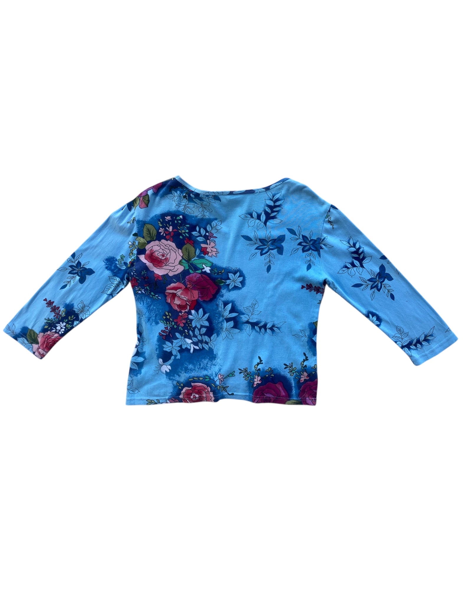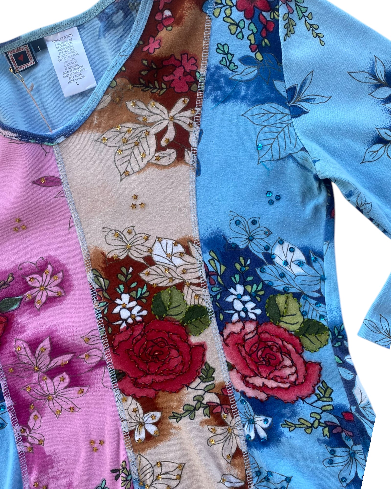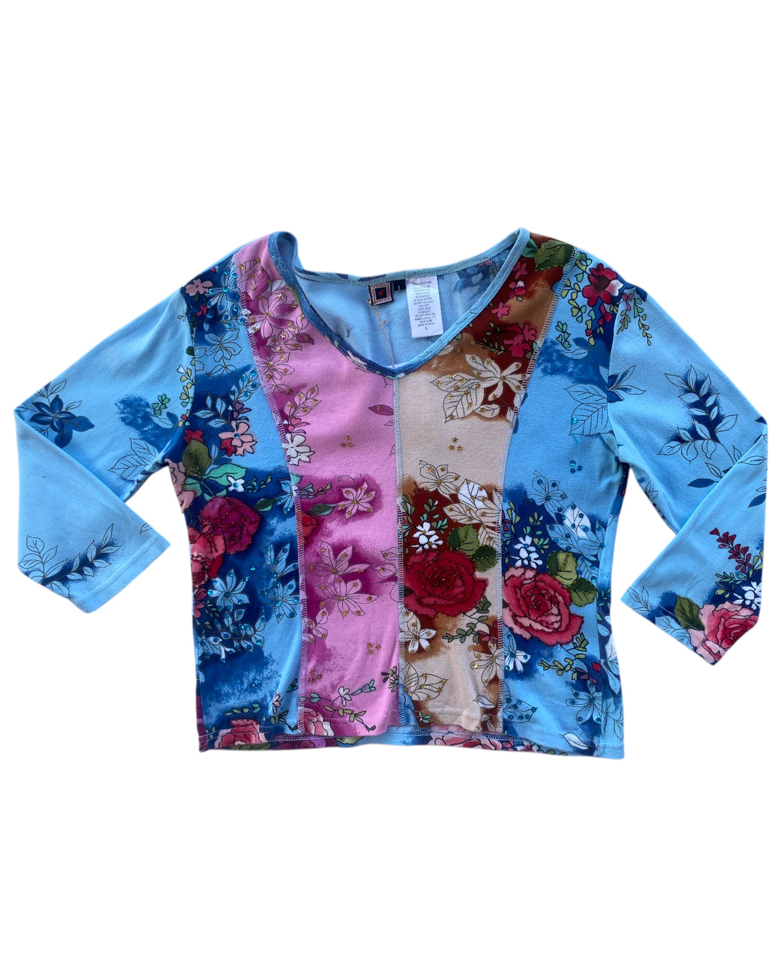 PLAYERA CON MANGAS TRES CUARTOS EN PATCHWORK AZUL, ROSA Y CAFE CON PRINT DE FLORES DISTINTAS Y BRILLITOS PEGADOS COMO DETALLE, CUELLO EN V. 100% ALGODÓN. SIN DETALLES DE USO.