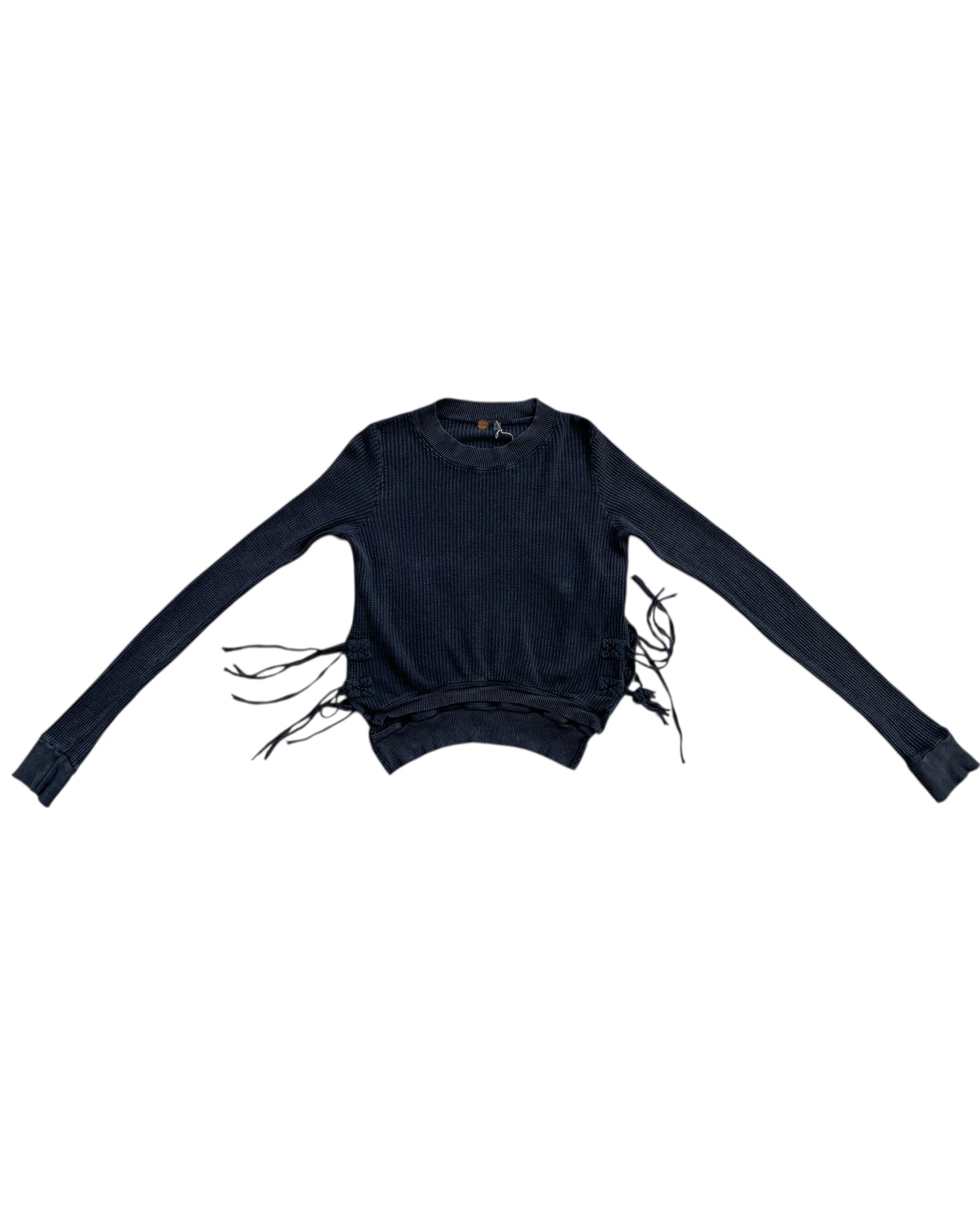 SUDADERA GRIS OXFORD CON TEJIDO ESTILO WAFFLE Y TIRAS A LOS COSTADOS PARA AMARRAR Y AJUSTAR, MANGA LARGA, 100% ALGODÓN. NO TIENE DETALLES, EN PERFECTO ESTADO.