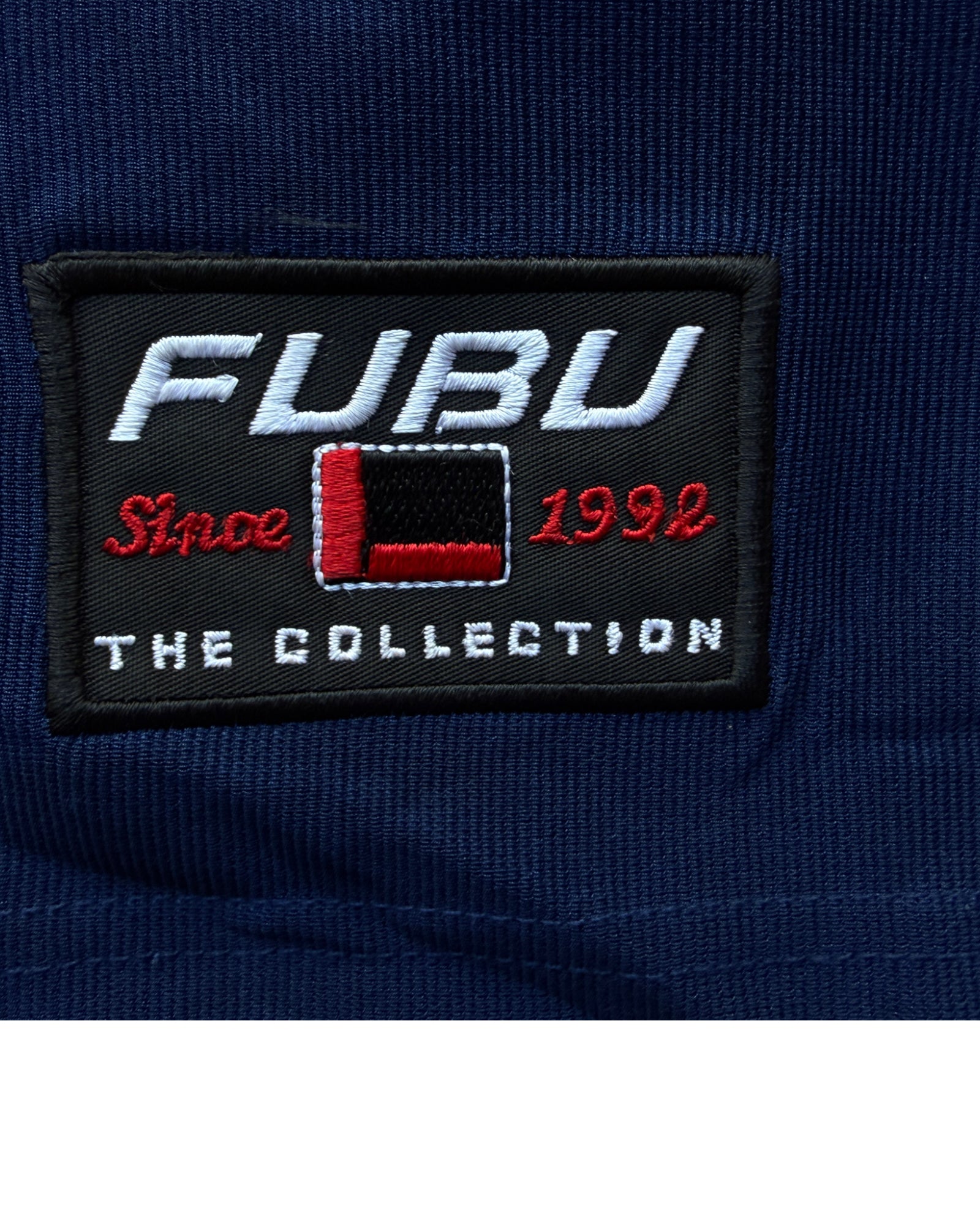 PLAYERA DE MANGA LARGA EN COLOR AZUL MARINO ESTILO JERSEY DE FUTBOL, LIGERAMENTE CROPPED Y NUMEROS BORDADOS EN LOS HOMBROS Y LA PARTE TRASERA AL IGUAL QUE LA PALABRA FUBU EN COLOR AMARILLO. 92% POLYESTER Y 8% SPANDEX. NO TIENE DETALLES, EN PERFECTAS CONDICIONES.