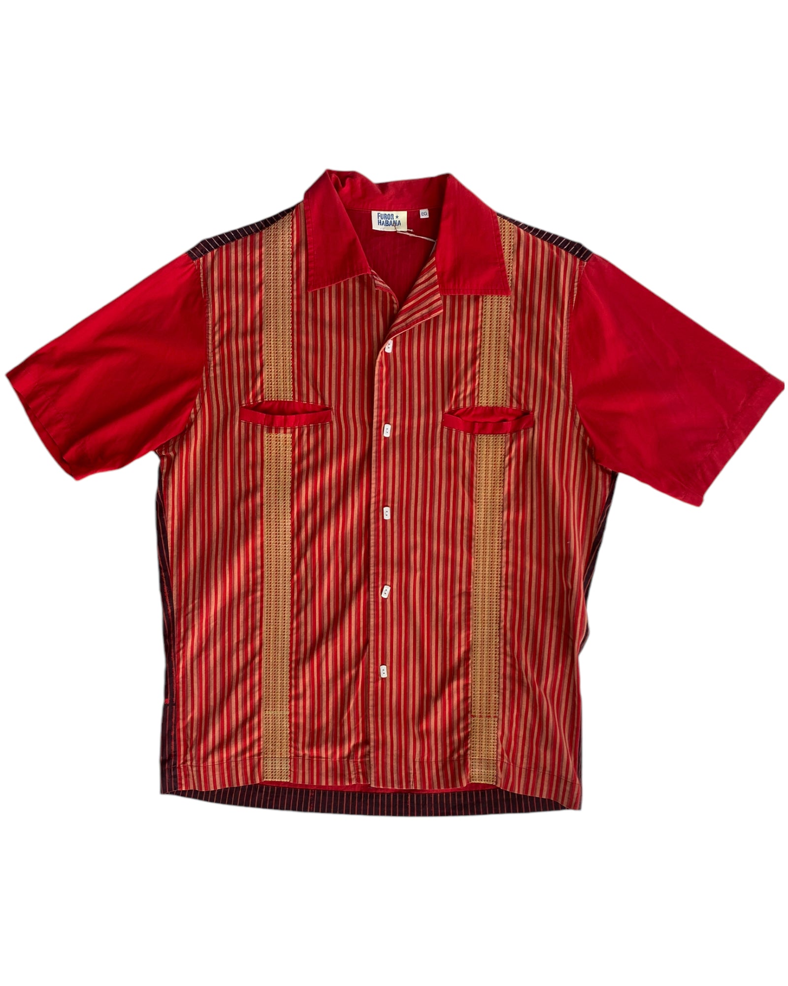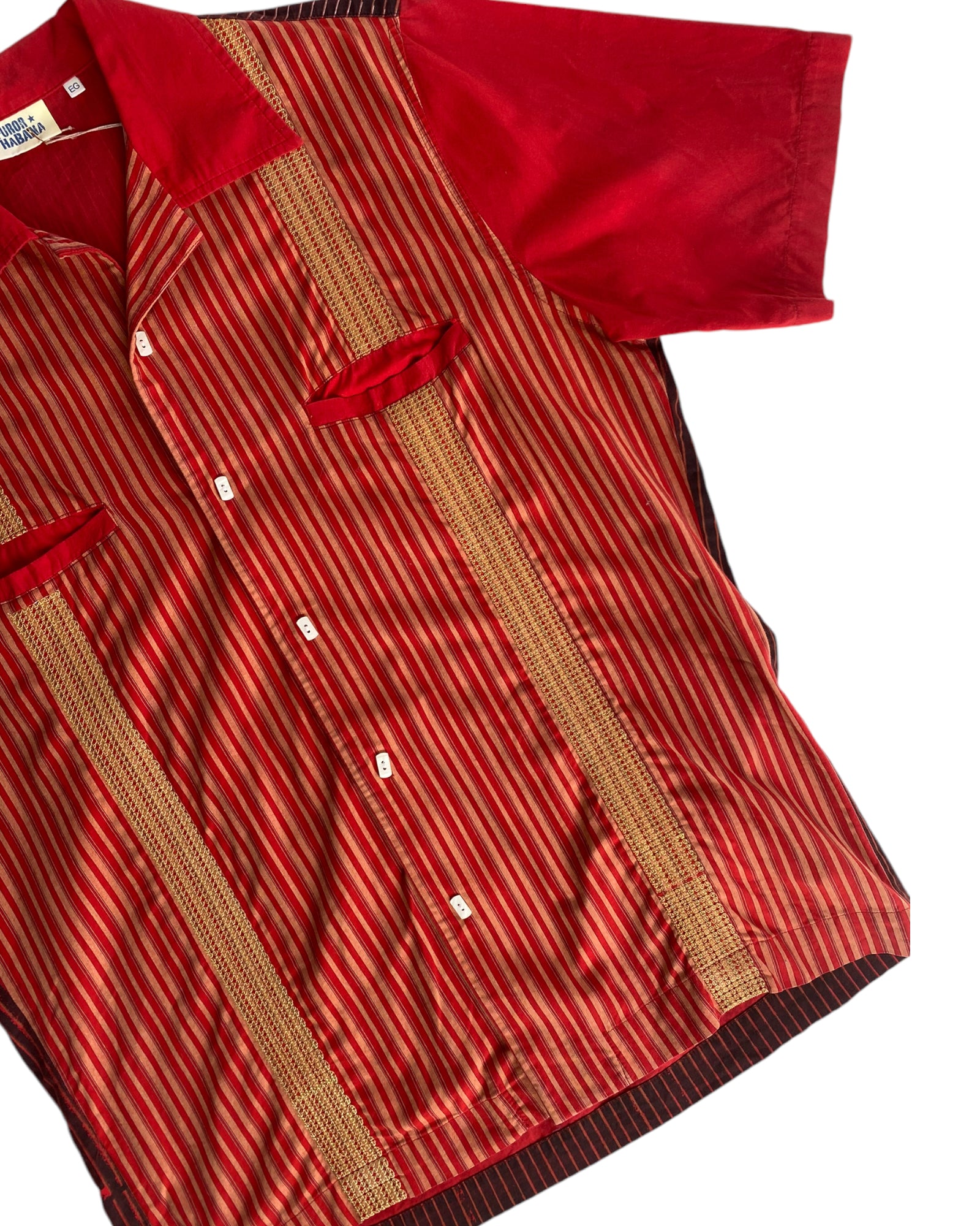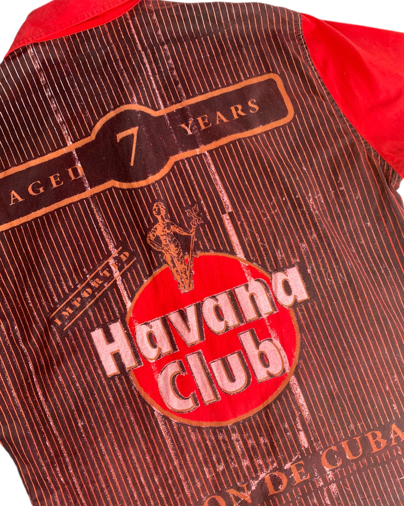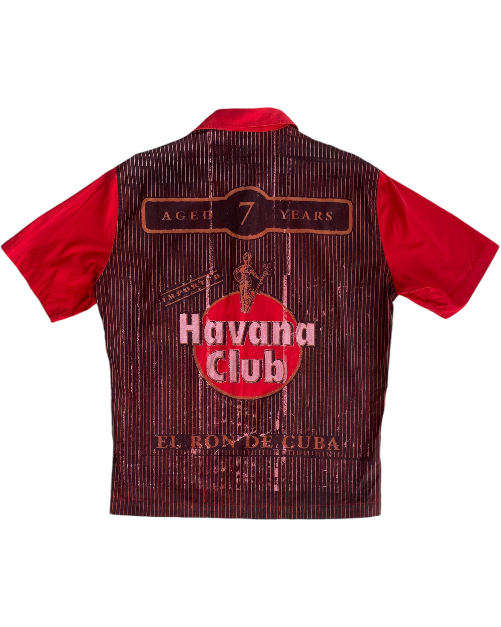 CAMISA 100% ALGODON CON PRINT DE RAYAS VERTICALES Y BORDADO EN LA PARTE DELANTERA, BOLSOS DELANTEROS FUNCIONALES; PRINT DE RAYAS VERTICALES MORADAS Y LOGO DE HAVANA CLUB EN LA PARTE TRASERA. SIN DETALLES DE USO.