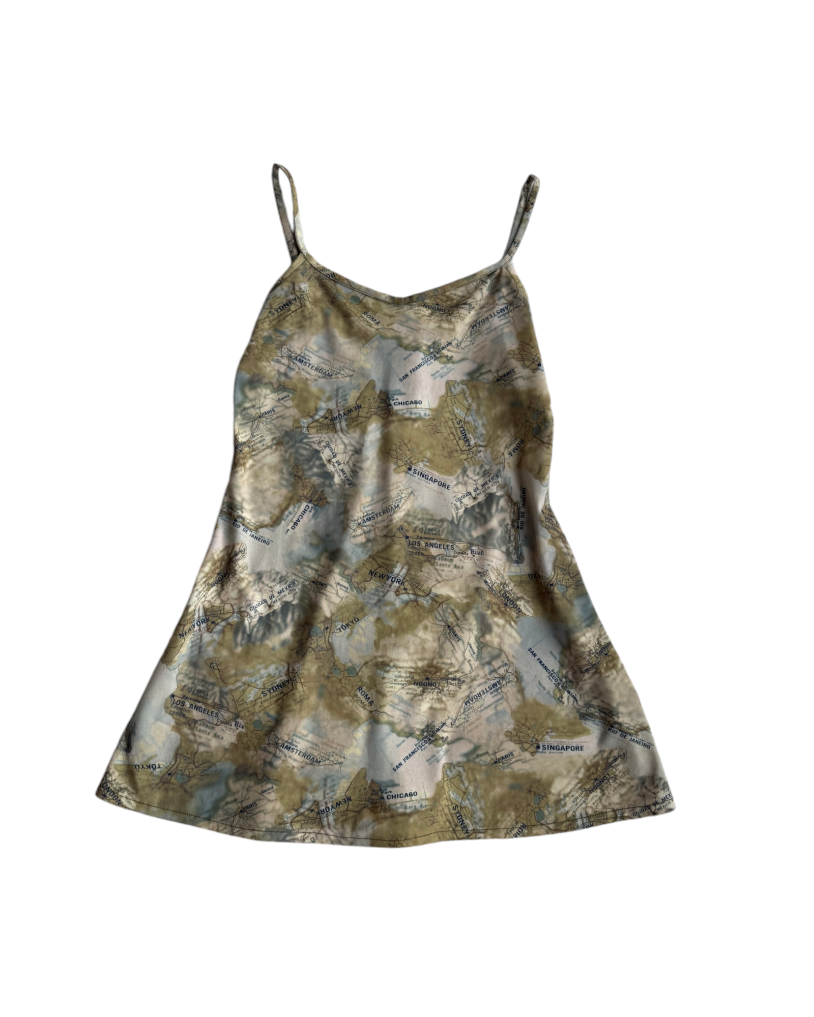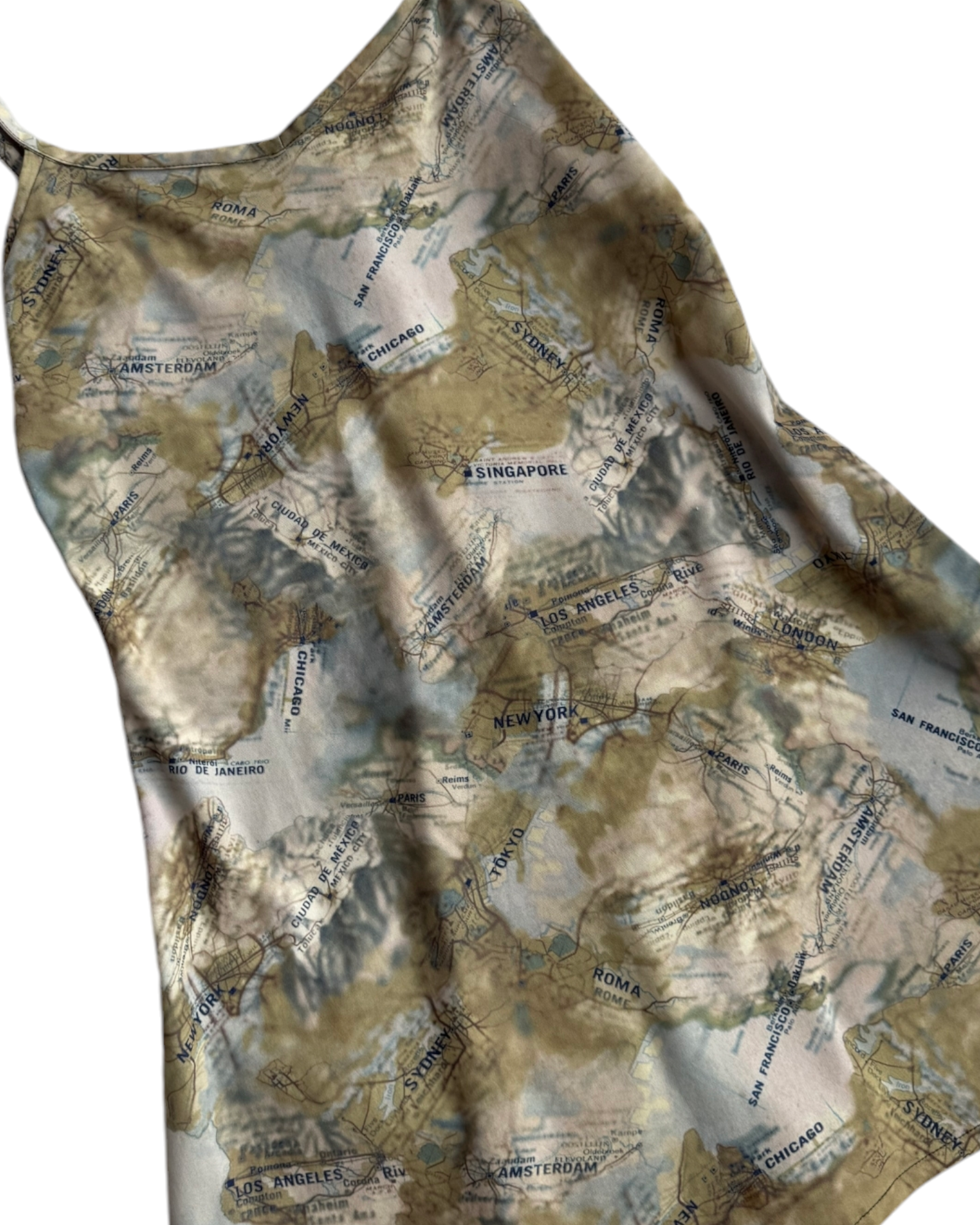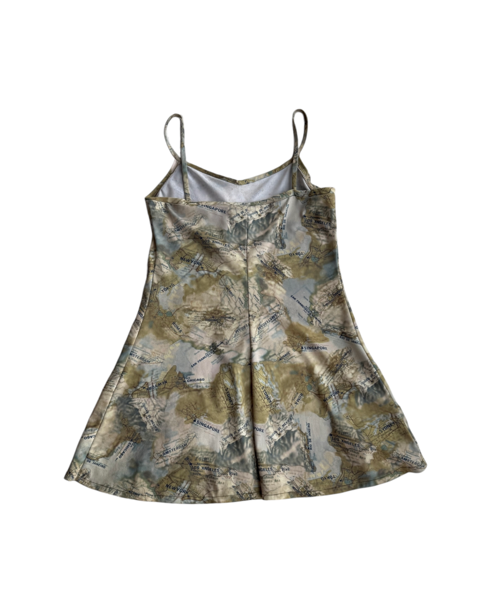 MINI VESTIDO EN CORTE A Y CON TIRANTES SPAGUETTI CON PRINT DE MAPA DE EUROPA, TRAE DIFERENTES CIUDADES MARCADAS. SIN DETALLES DE USO.