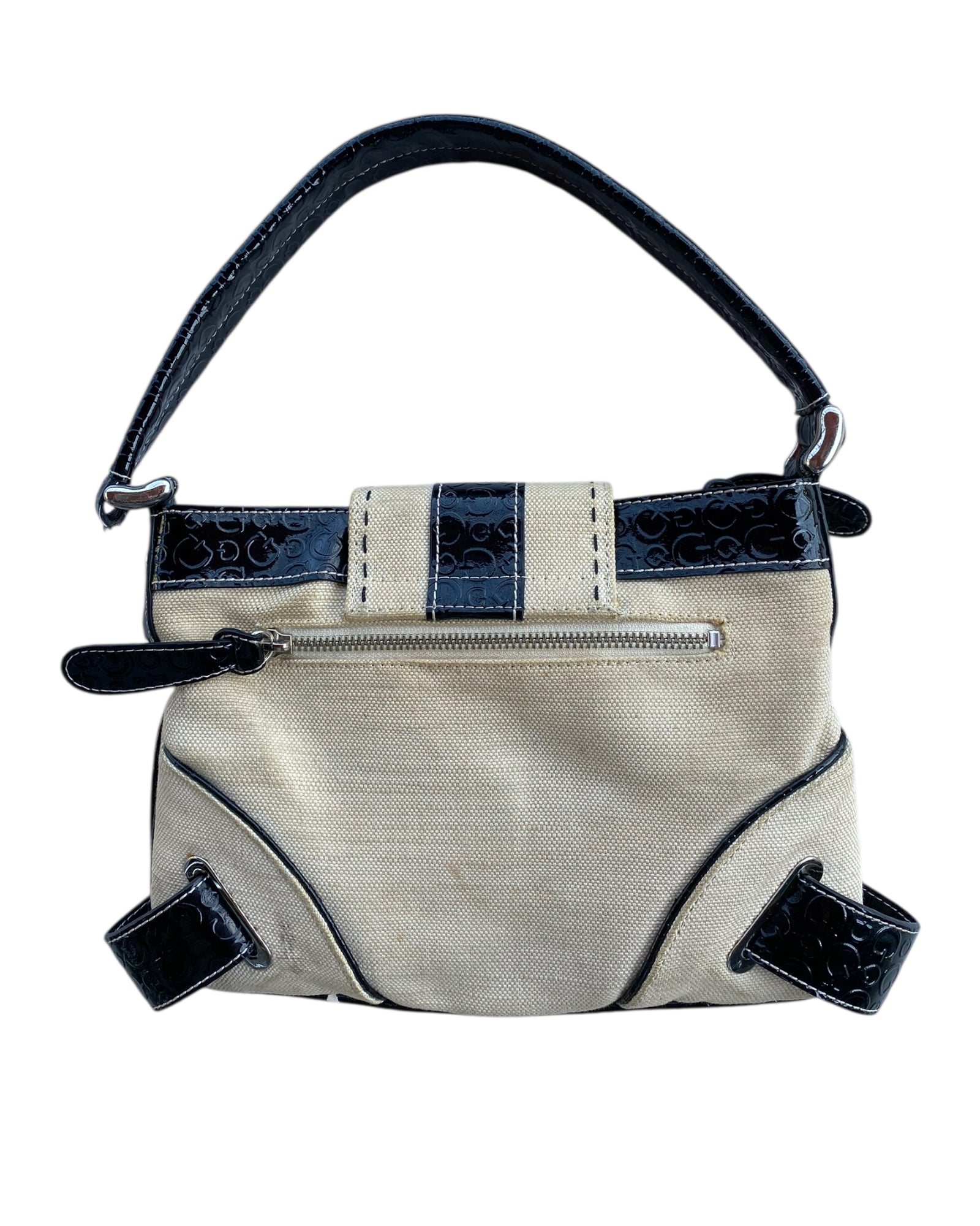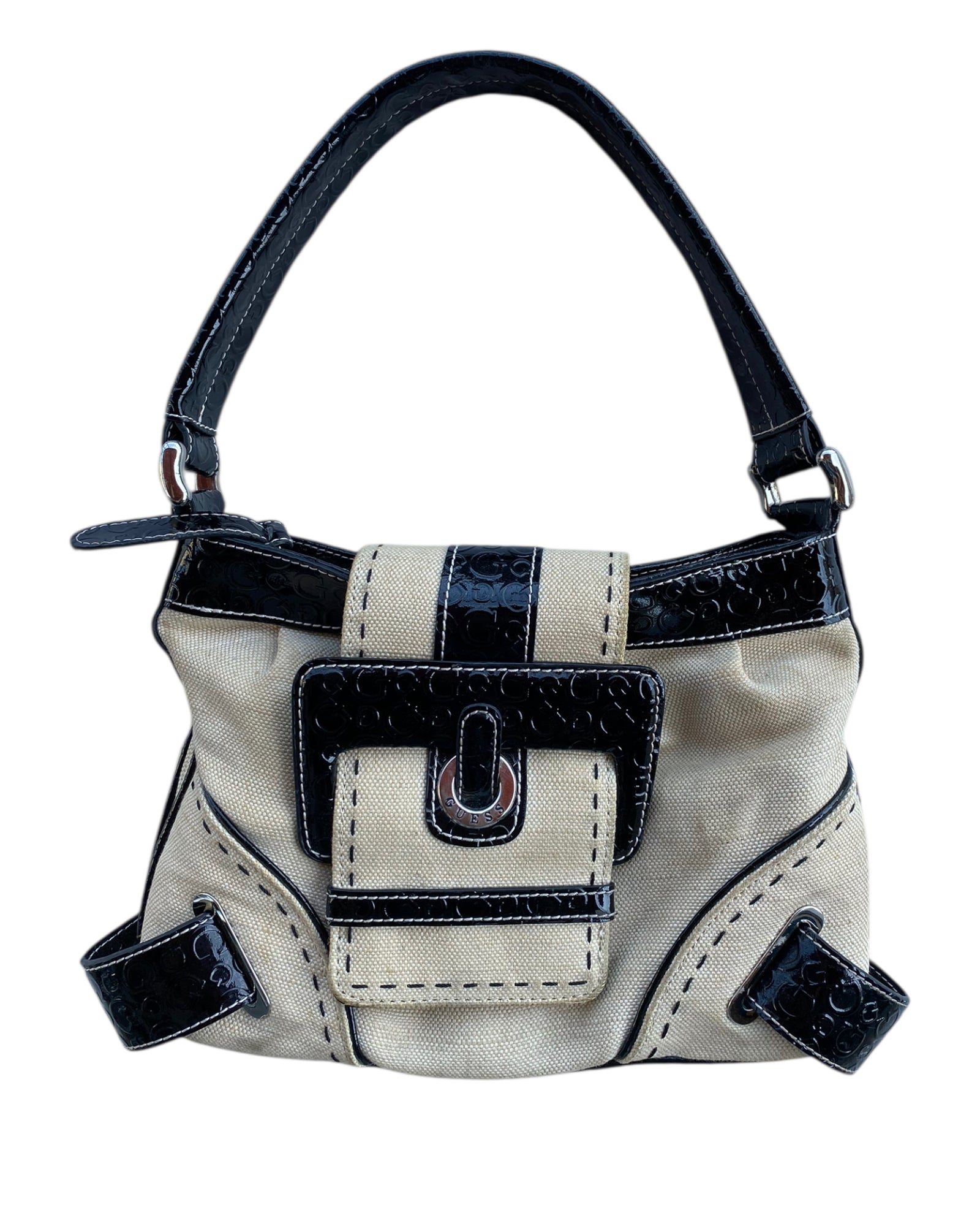 BOLSA CUADRADA DE TELA COLOR BEIGE CON DETALLES NEGROS TIPO CHAROL, LETRAS DE LA MARCA POR TODOS LOS DETALLES NEGROS, , CIERRE AL REVERSO, IMÁN FRONTAL PARA CERRAR, STRAP EXTRA REMOVIBLE, LIGERO DESGASTE POR ANTIGÜEDAD