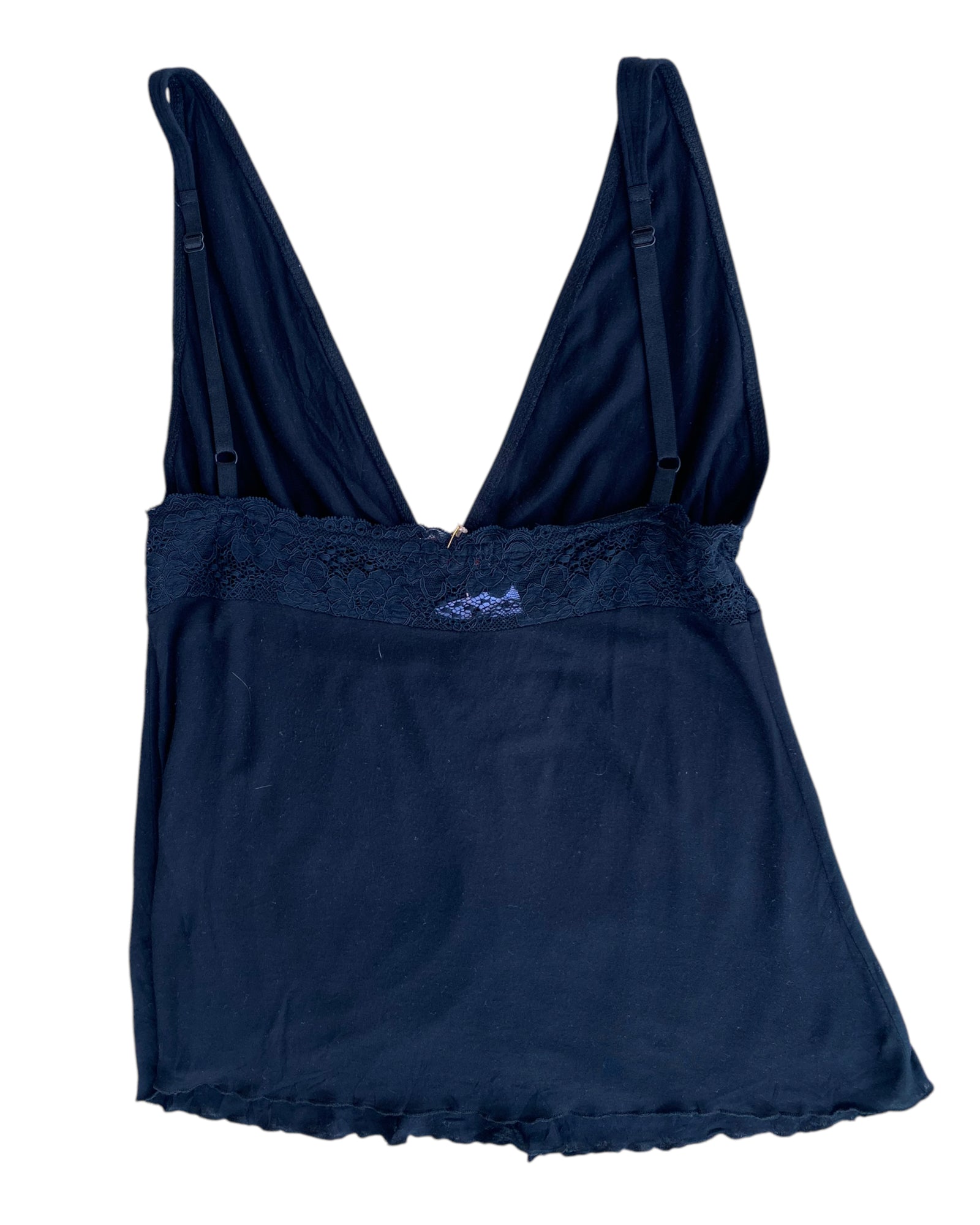 TOP DE TIRANTES NEGRO CON ENCAJE EN LA PARTE DEL TORSO, TIRANTES AJUSTABLES, ESCOTE TIPO "V", BORDES TIPO LECHUGA. LISO SIN ESTAMPADO, EN PERFECTO ESTADO. 100% ALGODON.