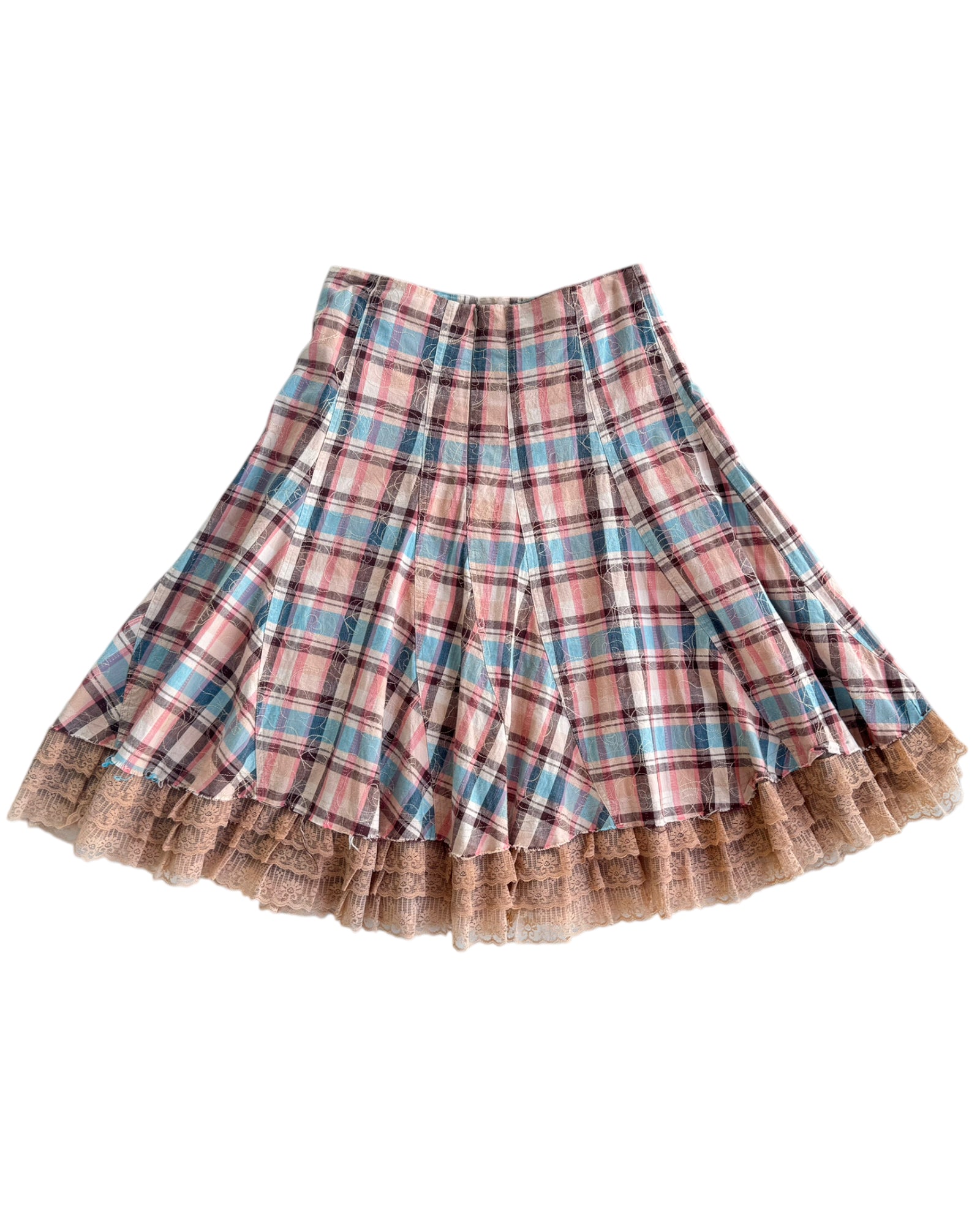 FALDA 55% POLYESTER Y 45% ALGODON CON PATRON DE CUADROS EN COLORES ROSA, AZUL Y CAFE CON CIERRE TRASERO PARA SUBIR. BORDADO EN COLOR BEIGE DE FLORES Y DOBLADILLO DE ENCAJE PLISADO. NO TIENE DETALLES, EN PERFECTO ESTADO.