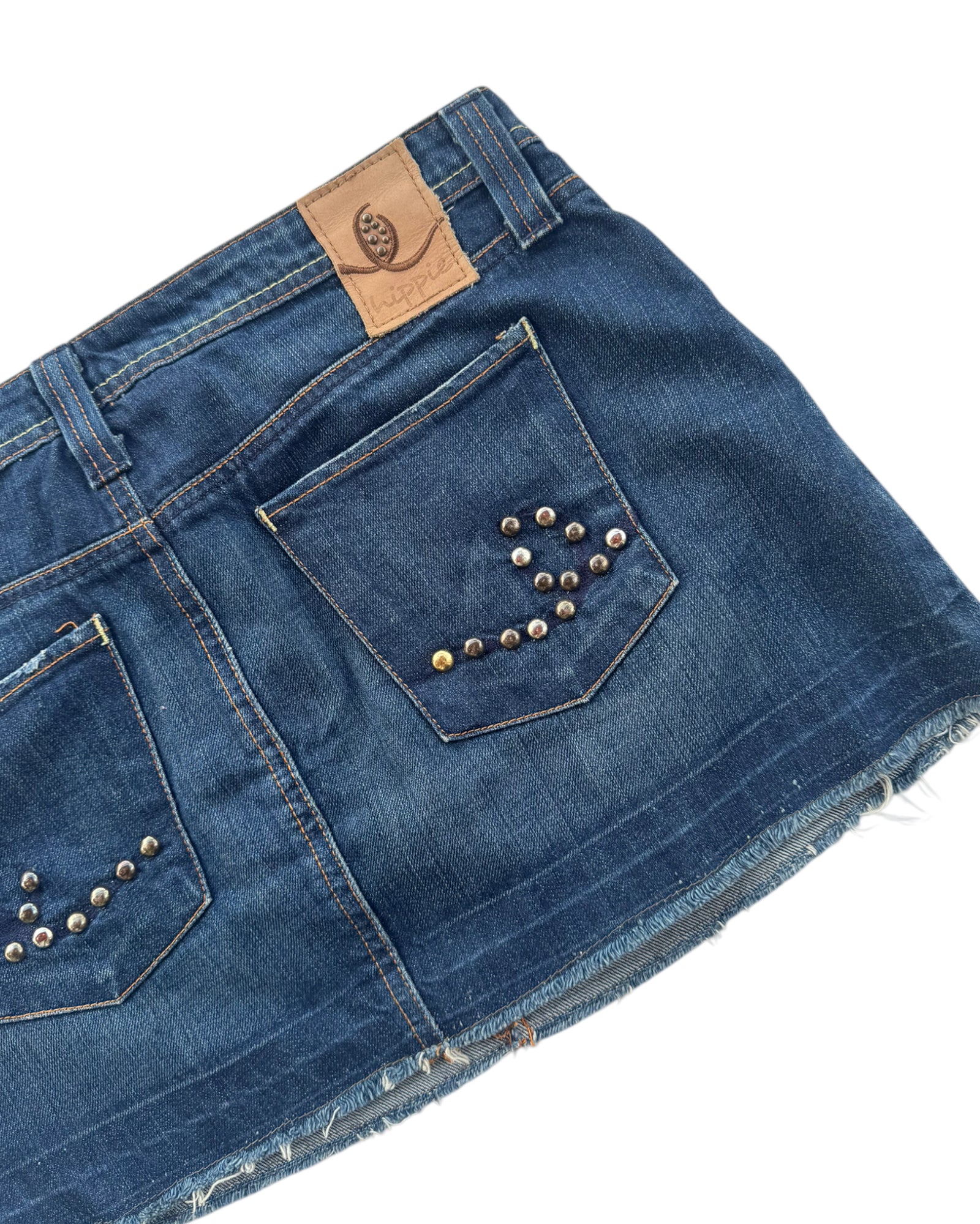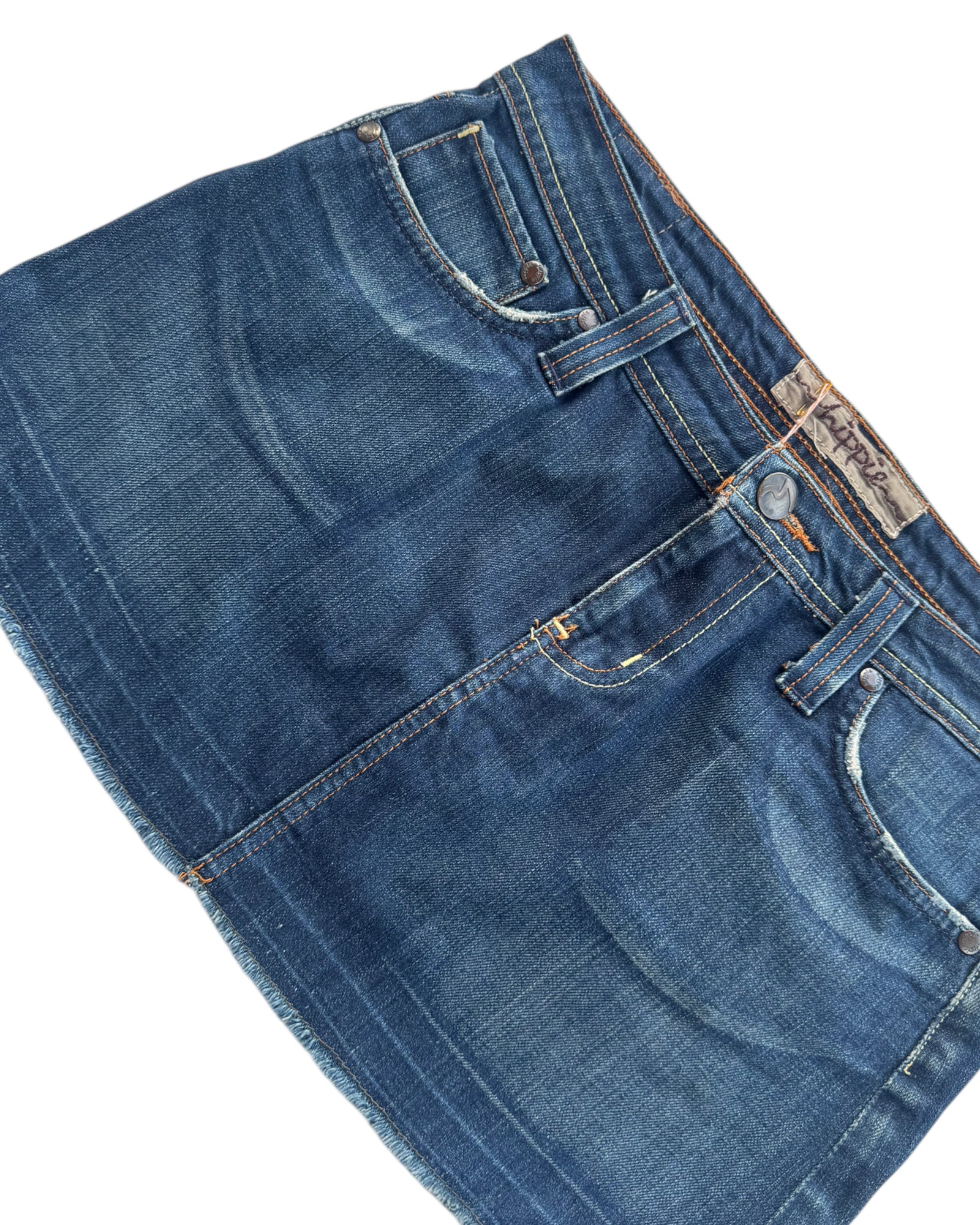 FALDA DENIM CORTA CON DENIM OSCURO, BOLSILLOS FRONTALES Y TRASEROS CON ESTOPEROLES FUNCIONALES. 100% ALGODON. EN PERFECTO ESTADO, SIN DETALLES