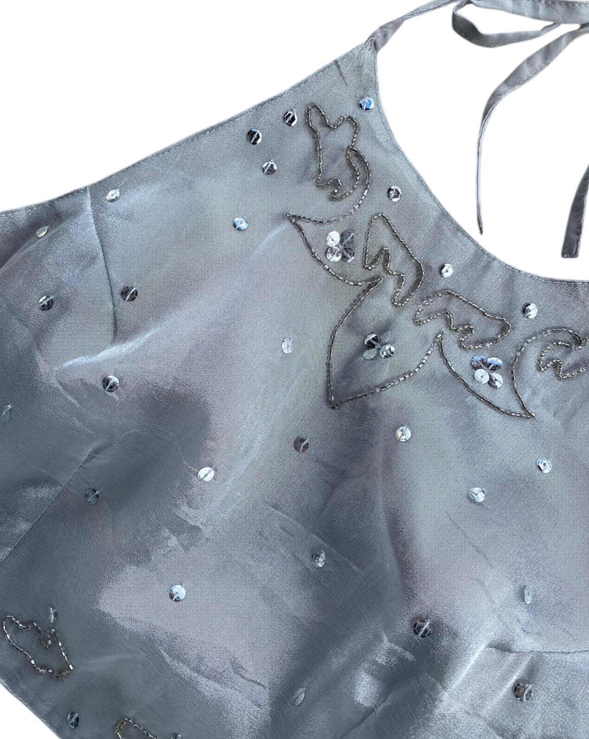 TOP 100% POLYESTER GRIS CON ESPALDA DESCUBIERTA Y LISTONES PARA AMARRAR, LENTEJUELAS TRANSPARENTES Y CUENTAS PLATEADAS Y CUELLO ESTILO HALTER, NO TIENE DETALLES, EN PERFECTO ESTADO.