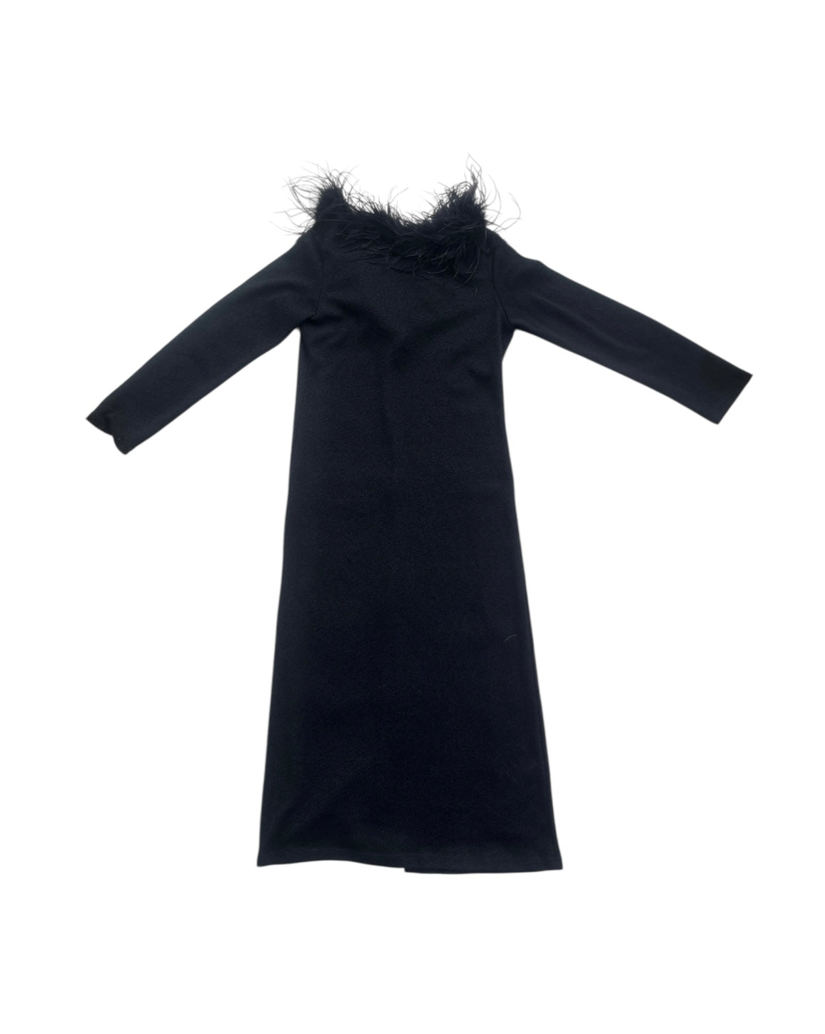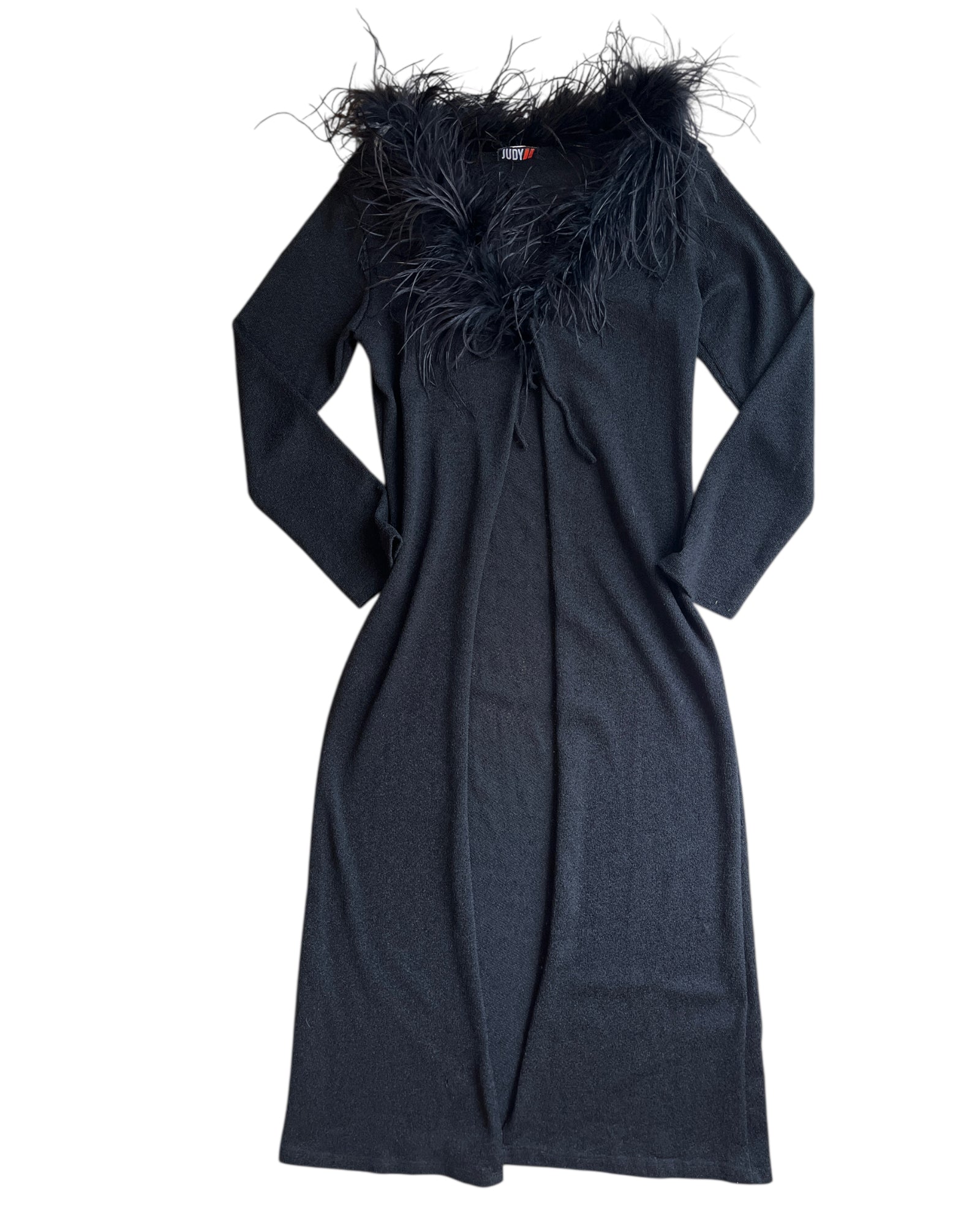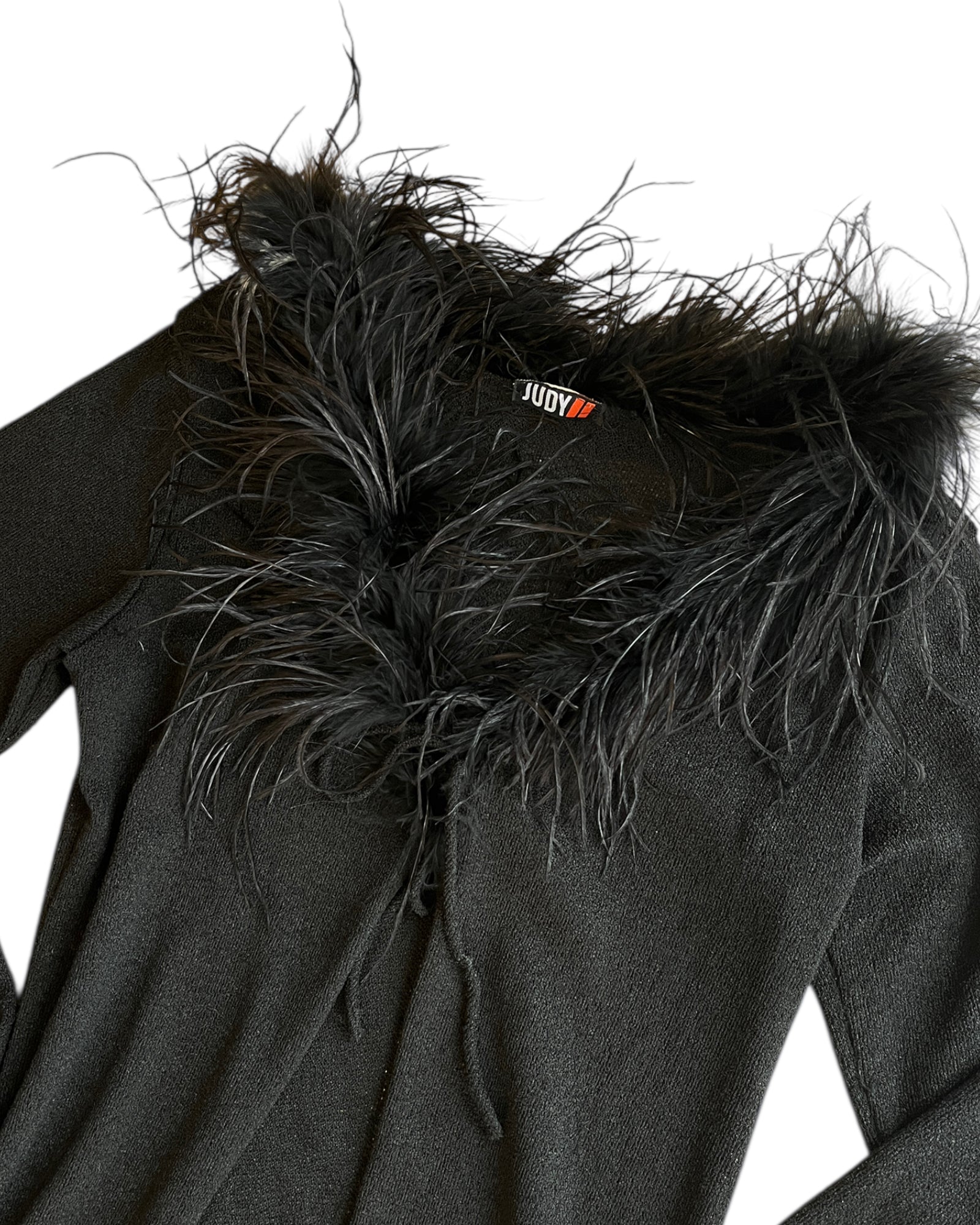SUÉTER NEGRO DE TELA RESPIRABLE CON DETALLE EN EL CUELLO DE PLUMAS NEGRAS, LISTÓN PARA AMARRAR EN EL PECHO, NO TIENE DETALLES, EN PERFECTO ESTADO.