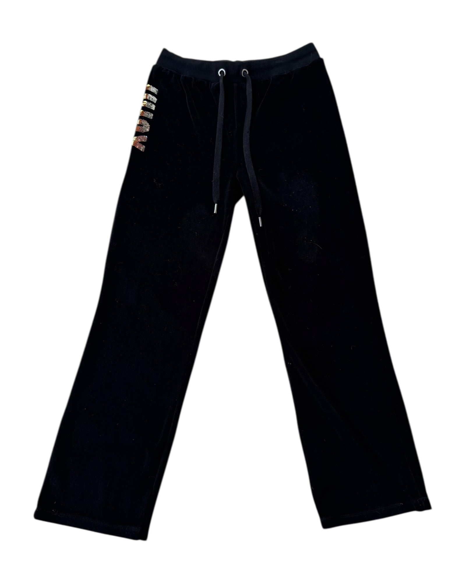 PANTS ESTILO TERCIOPELO ENBLEMATICO DE JUICY EN COLOR NEGRO Y CON LA PALABRA JUICY CON LENTEJUELAS PLATEADAS Y DORADAS NO TIENE DETALLES, EN PERFECTO ESTADO.