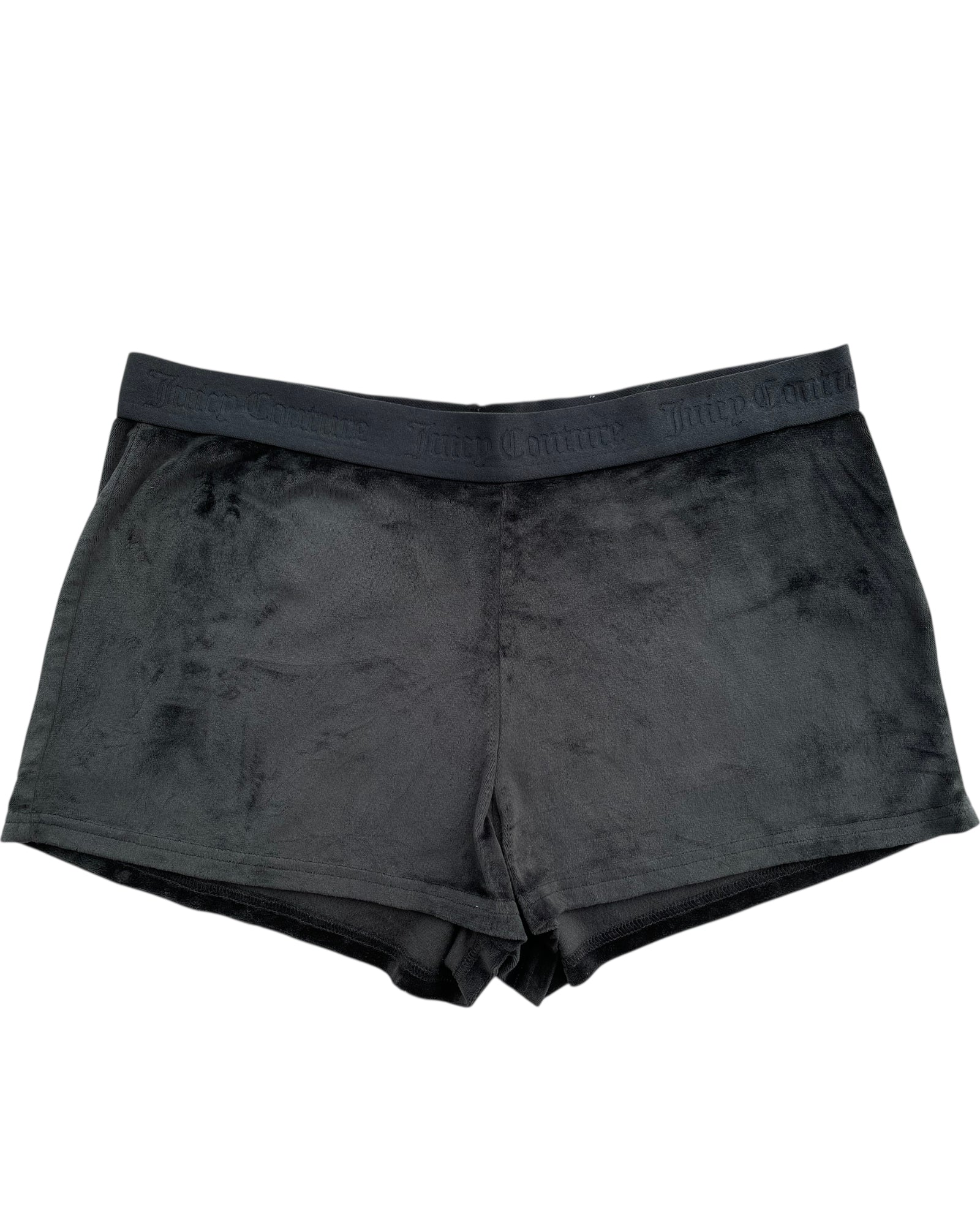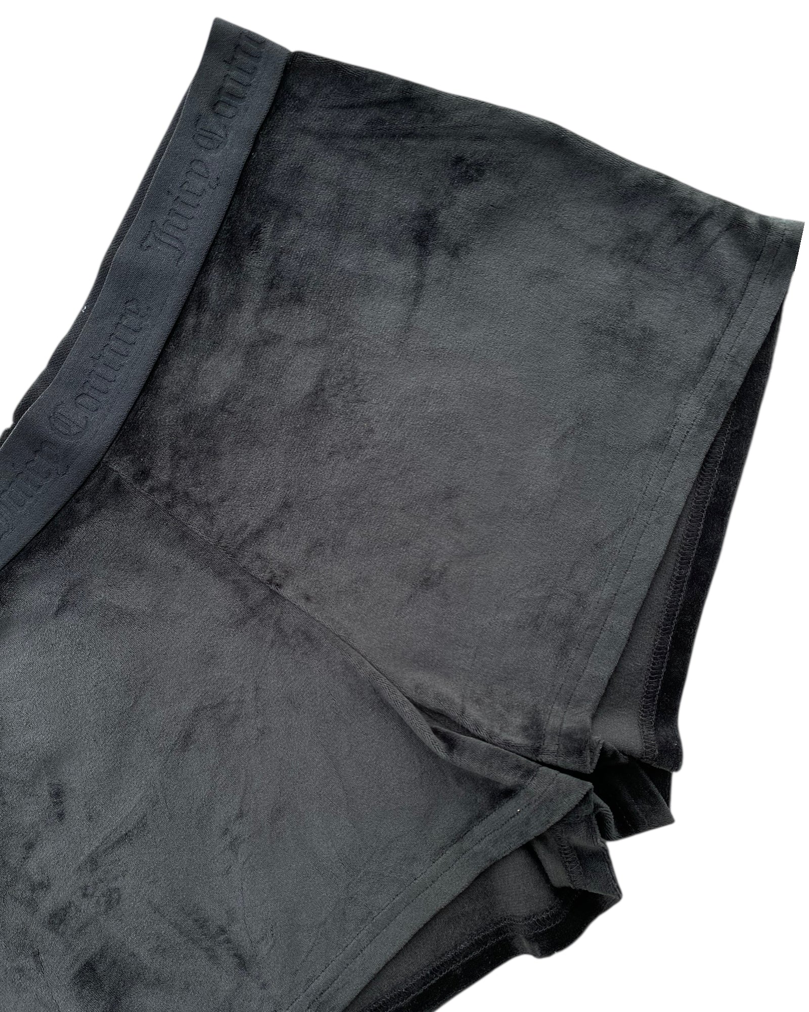 SHORTS ESTILO TERCIOPELO EN COLOR NEGRO CON PRINT EN EL TRASERO DE JUICY EN PIEDRITAS PLATEADAS, BANDA ELASTICA CON LOGO JUICY COUTURE BORDADO EN NEGRO. EN PERFECTO ESTADO., 95% ´POLYESTER Y 5% SPANDEX