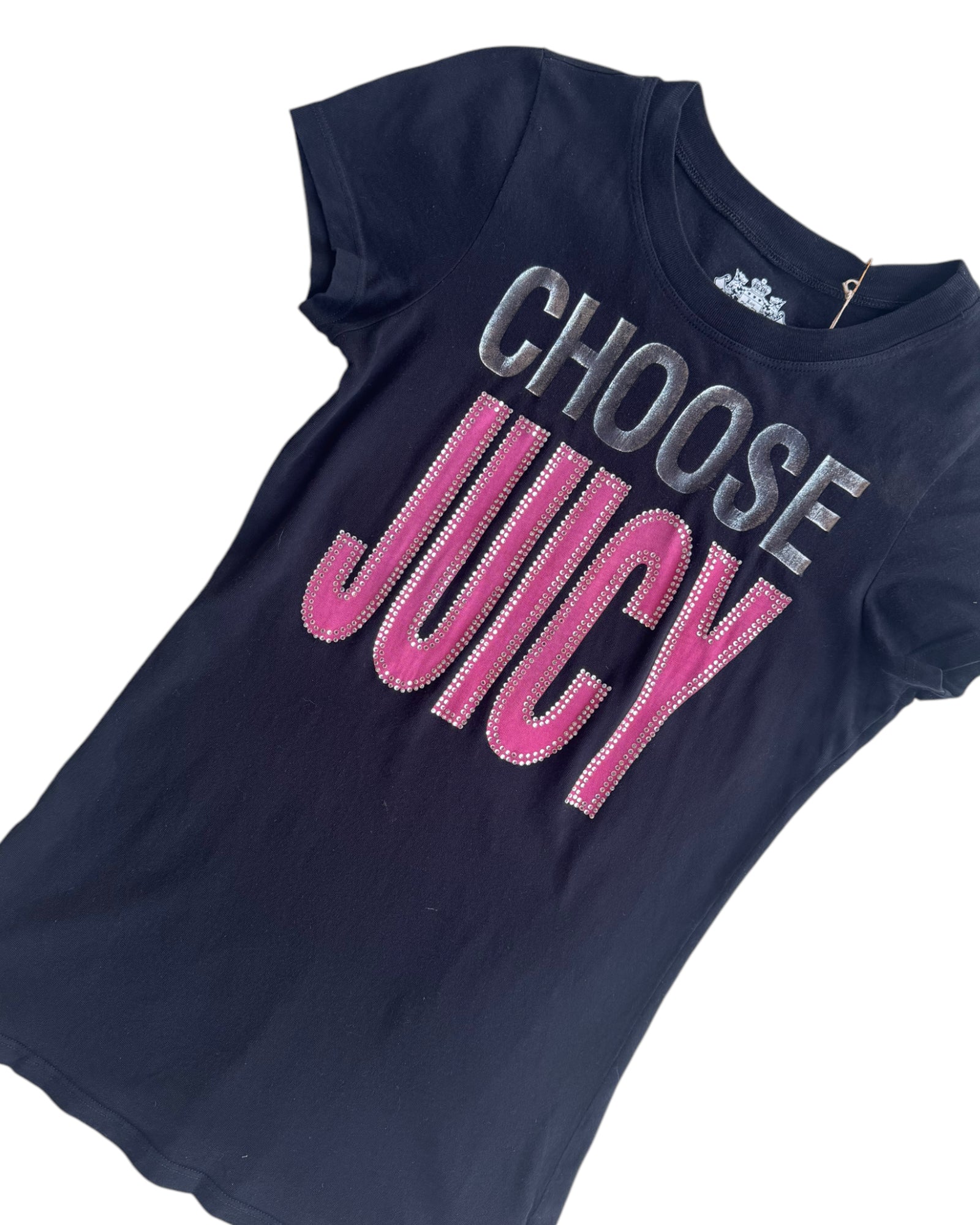 PLAYERA 100% ALGODON NEGRA CON PRINT DELANTERO "CHOOSE JUICY" EN LETRAS GRANDES ROSAS CON CUENTAS PEGADAS EN LA PALABRA JUICY. NO TIENE DETALLES.