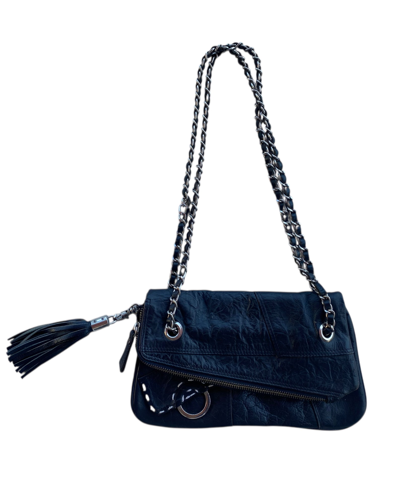 BOLSA CON CORREA DE METAL PLATEADO AJUSTABLE. CIERRE E IMAN PARA CERRAR. COLOR NEGRO, EXTERIOR 100% PIEL E INTERIOR 100% POLYESTER. TASSEL NEGRO COLGADO CON HARDWEAR PLATEADO. EN MUY BUEN ESTADO