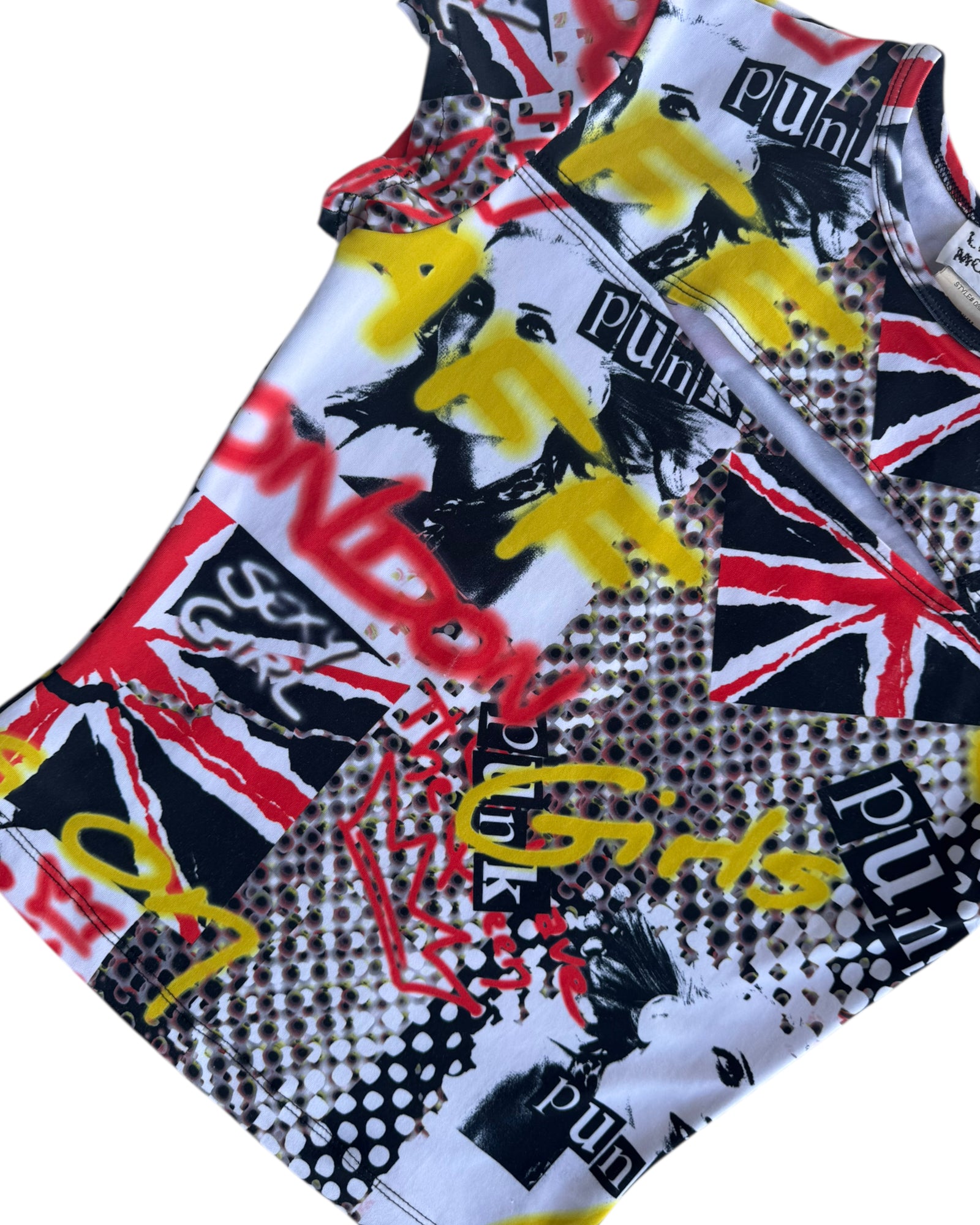 TOP CON PRINT DE LETRAS PUNK EN BLANCO, NEGRO Y GRIS Y GRAFFITI EN COLOR AMARILLO Y ROJO. BANDERA DE UK, 92% MICROPOLY Y 8% SPANDEX. NO TIENE DETALLES, EN PERFECTO ESTADO.