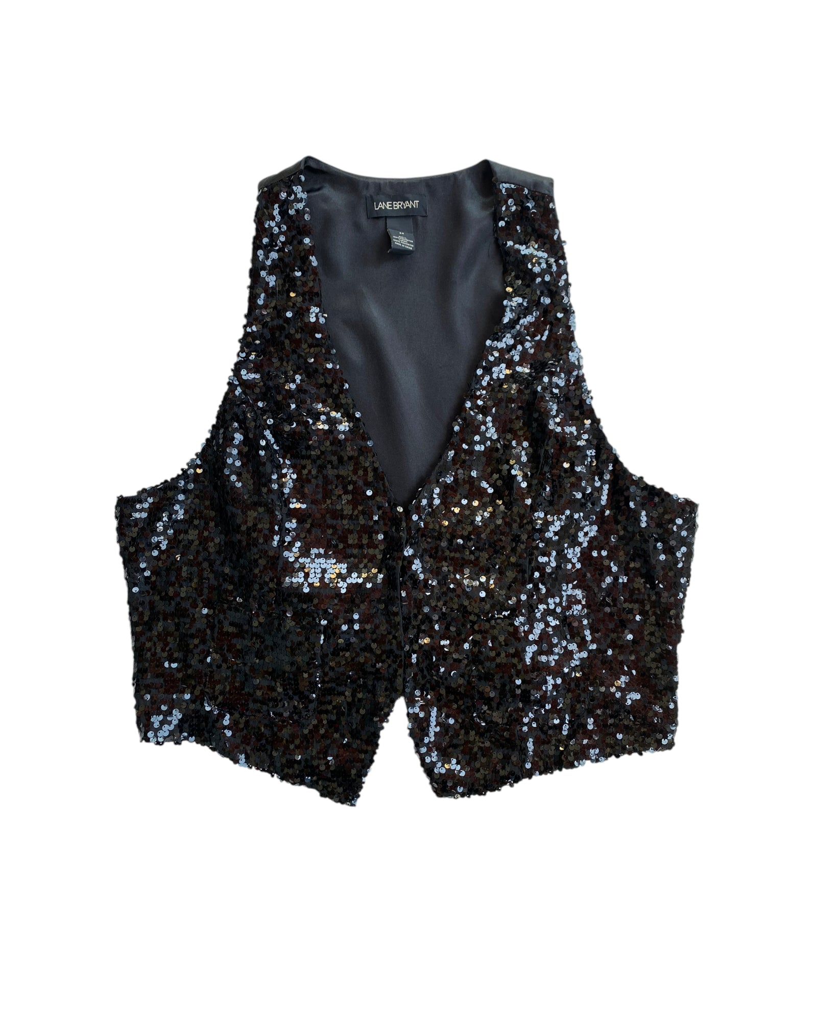 CHALECO NEGRO DE LENTEJUELAS CON TELA TIPO SEDA. SE ABROCHA CON SEGURITOS PLATEADOS. NO TIENE DETALLES DE USO.