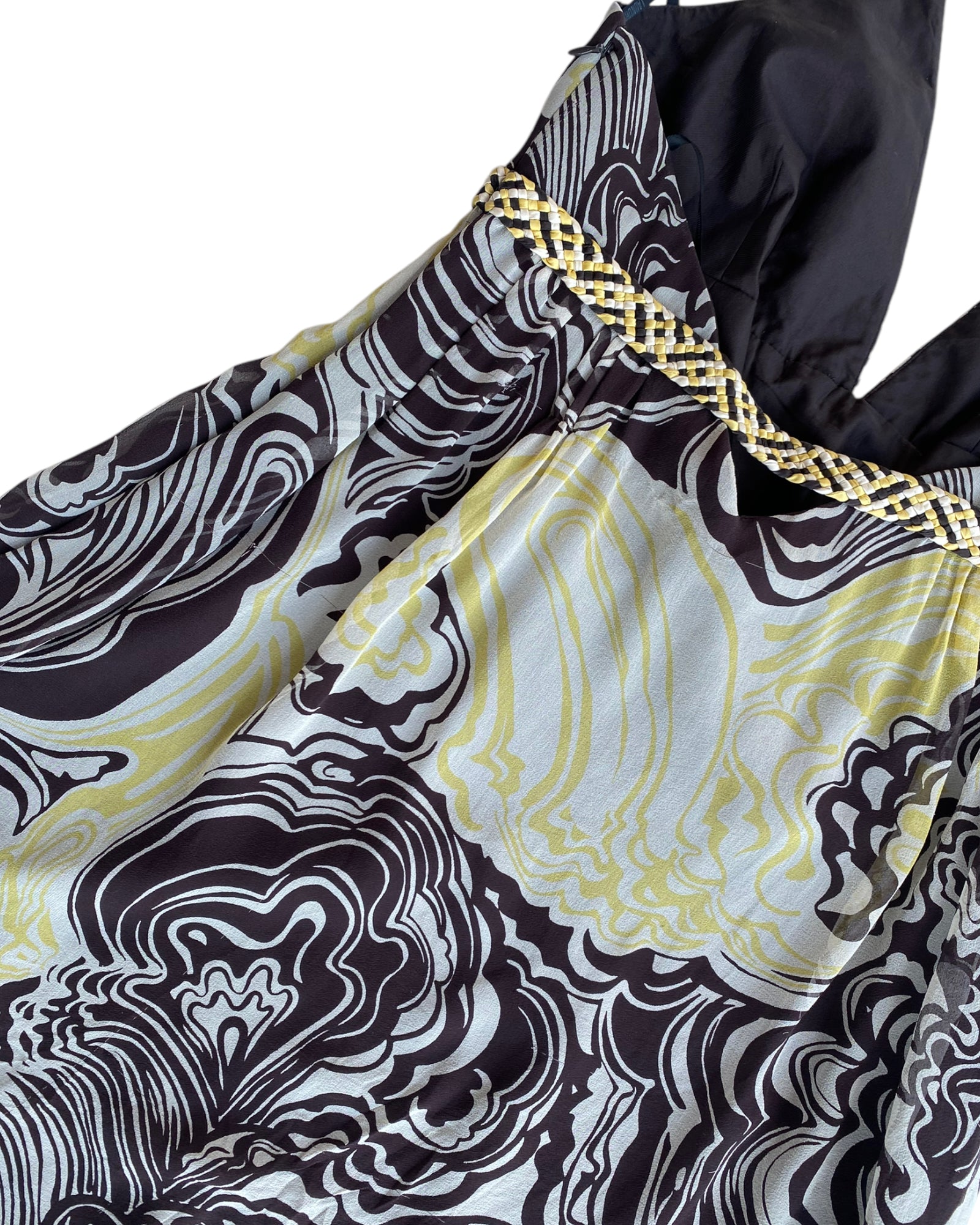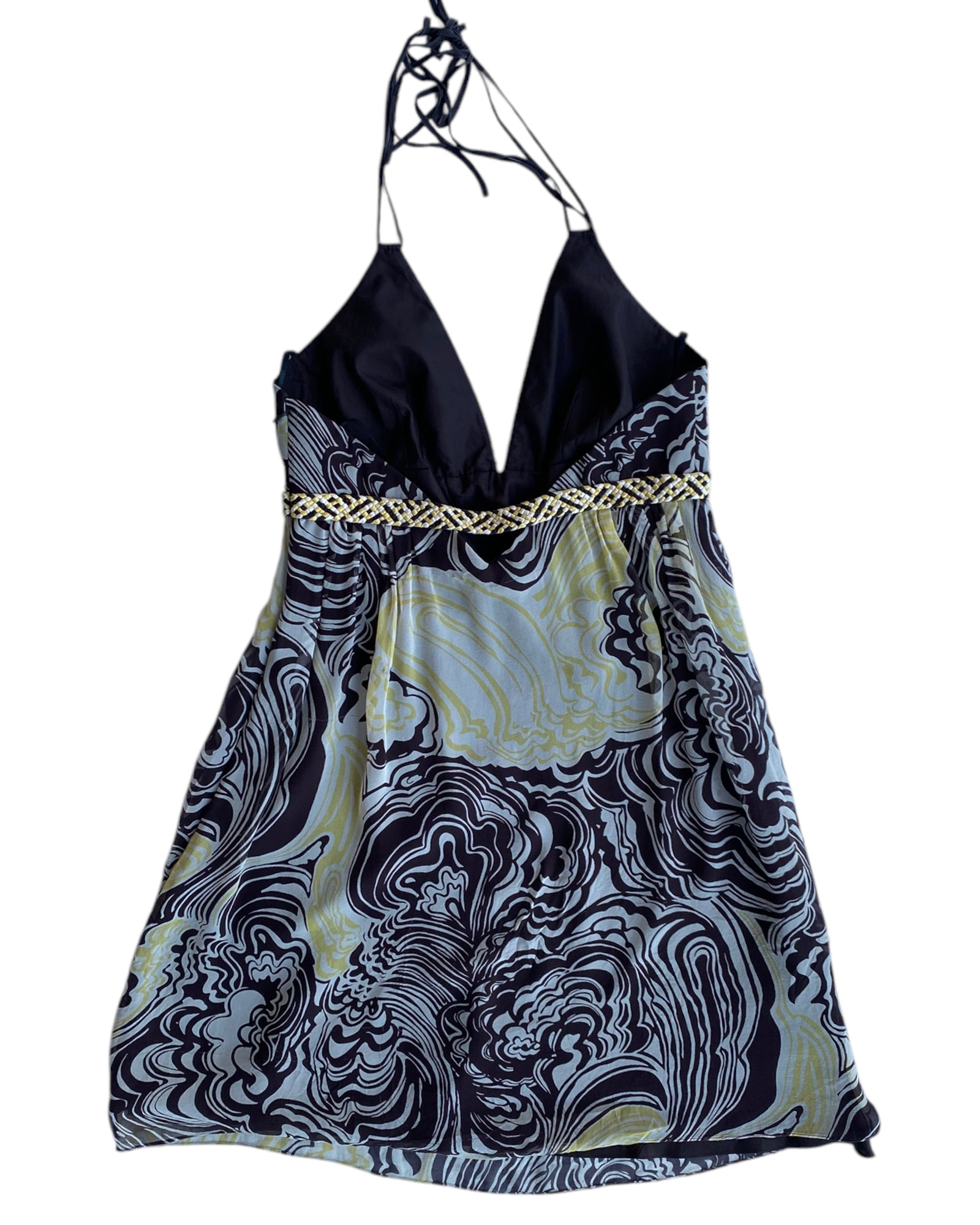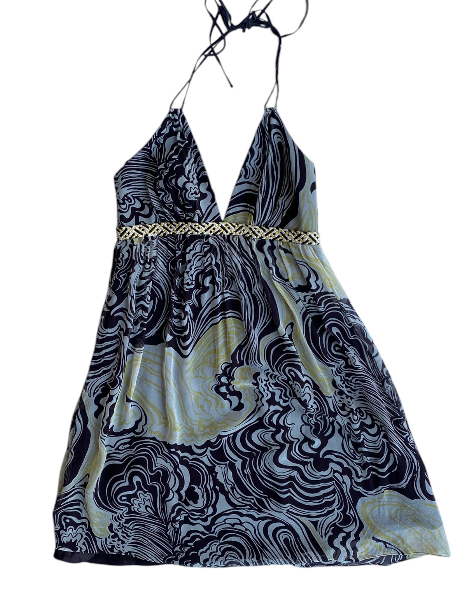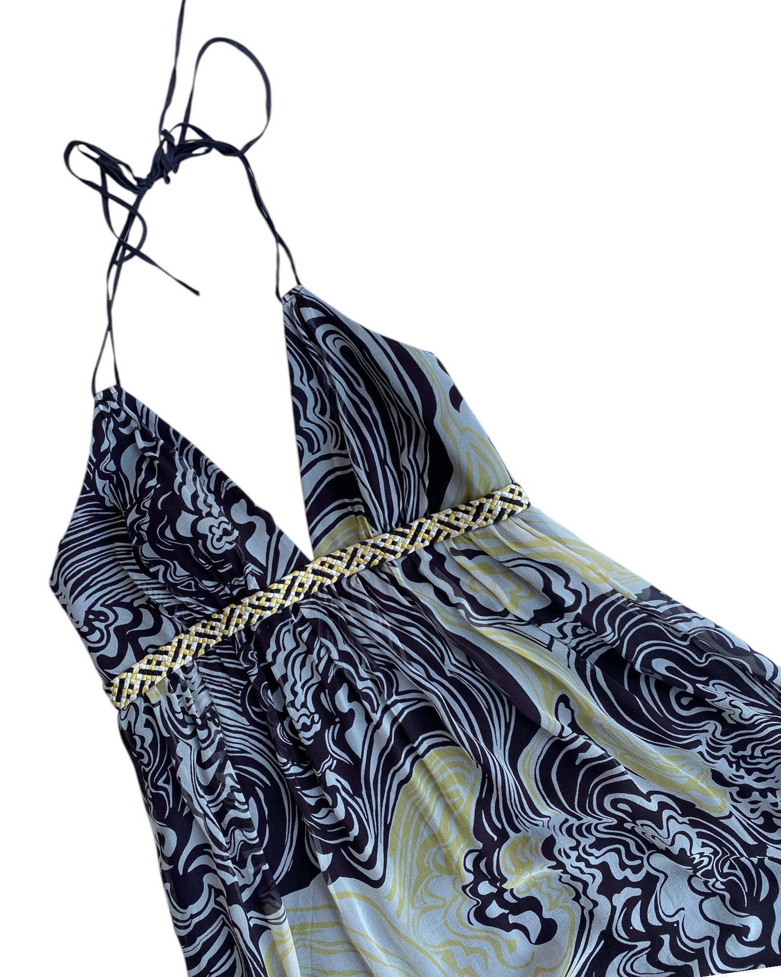 VESTIDO CON TELA TIPO GASA Y FORRO, TELA ESTAMPADA EN COLORES CAFE, AMARILLO Y BLANCO, CUELLO HALTER Y ESPALDA DESCUBIERTA, CINTURON DEBAJO DEL PECHO ESTILO TEJIDO. CIERRE EN COSTADO IZQUIERDO. 100% SEDA, EN PERFECTO ESTADO.
