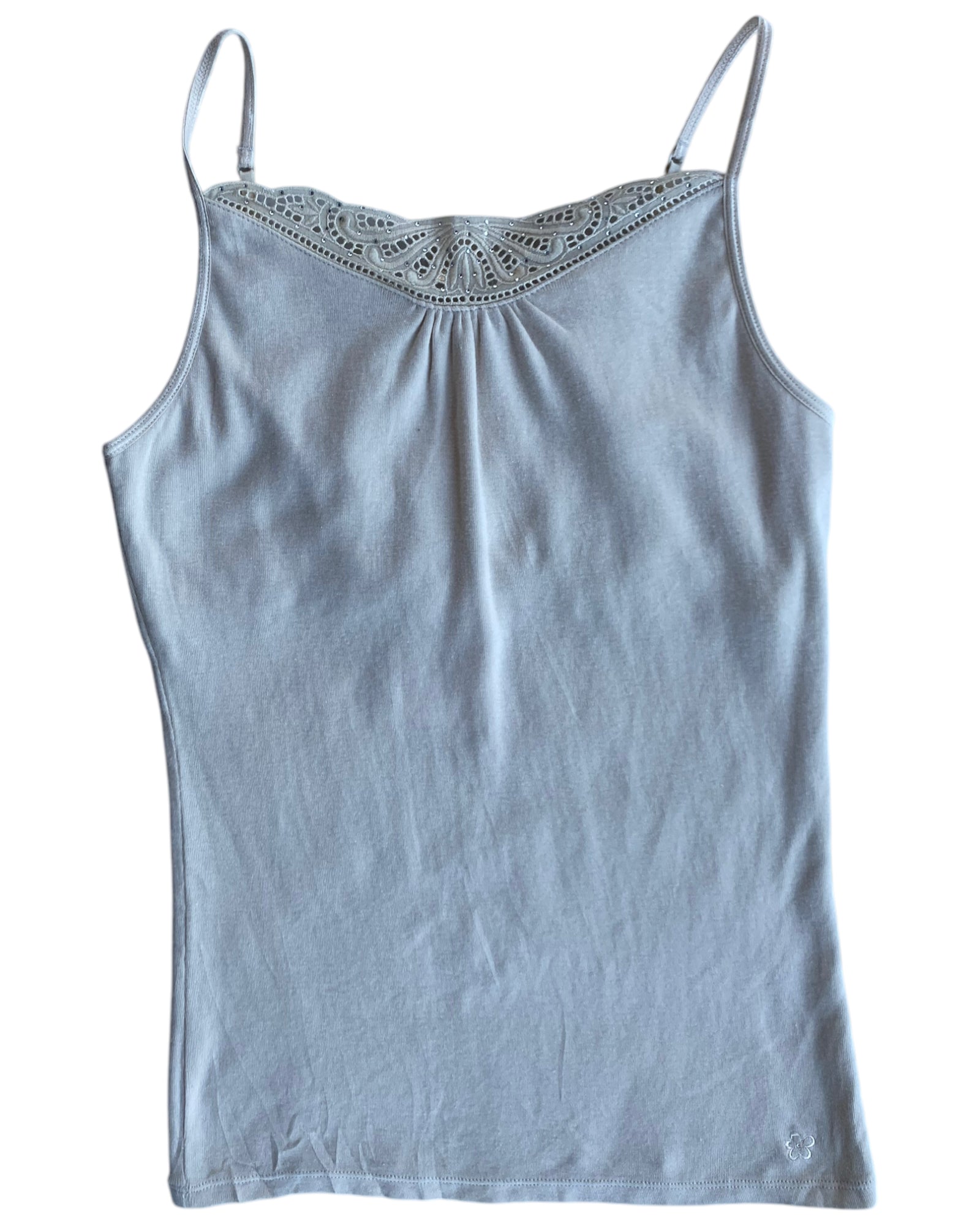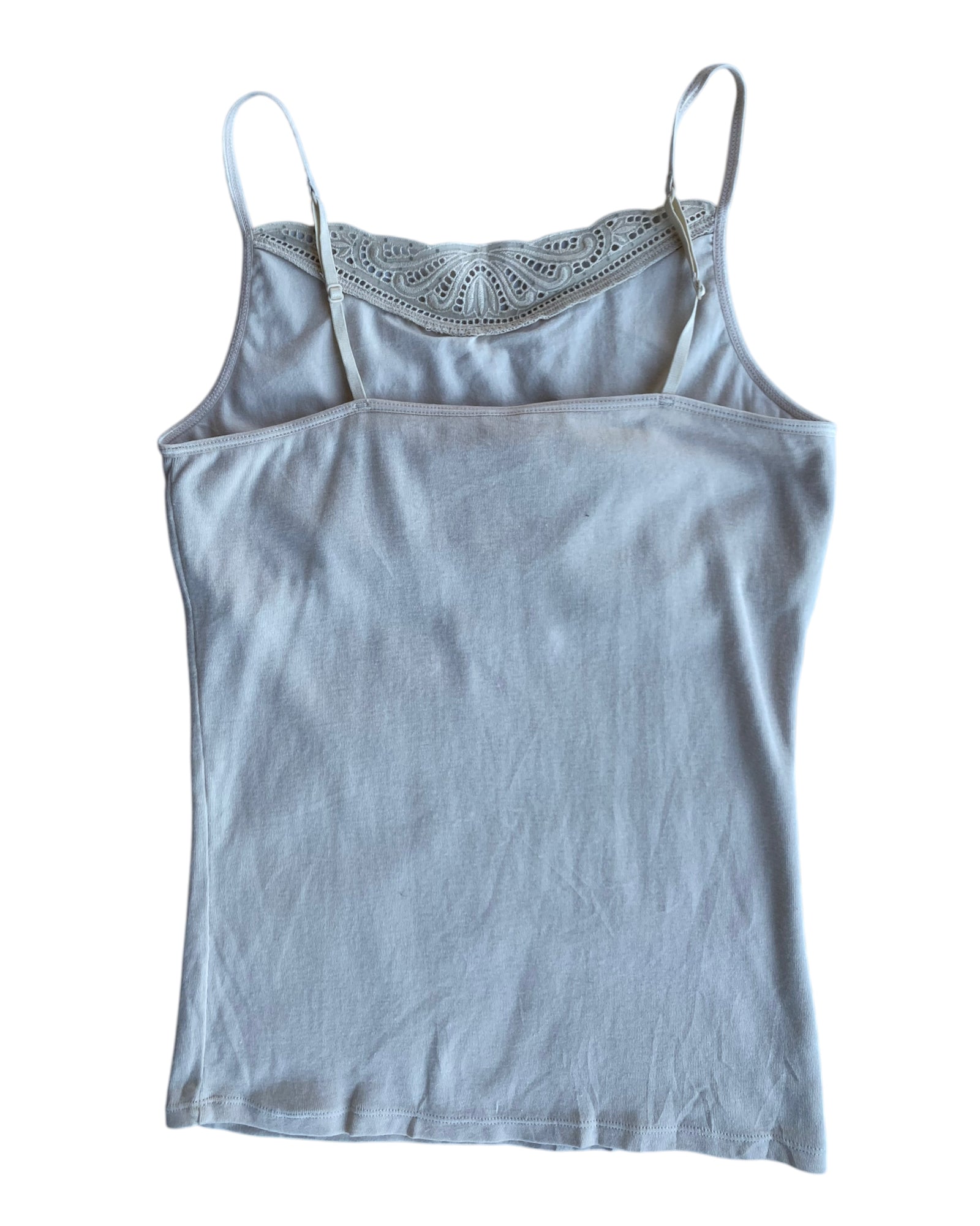 CAMISETA COLOR BEIGE CON TIRANTES AJUSTABLES Y PANEL EN EL PECHO DE ENCAJE Y BRILLITOS PLATEADOS, AJUSTABLE AL CUERPO 100% ALGODON, CONTIENE UN BRA COMO CAPA EXTRA, EN MUY BUEN ESTADO.