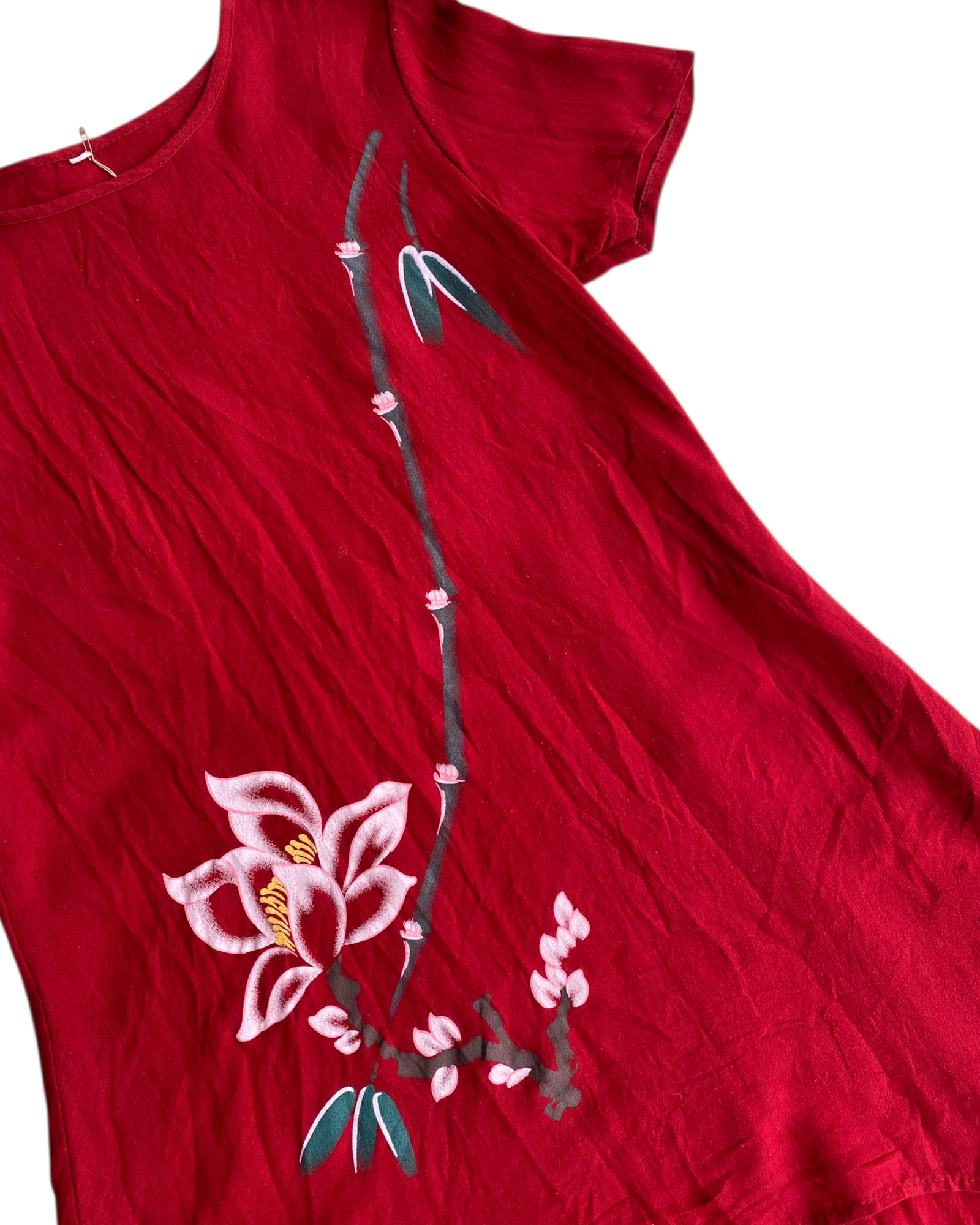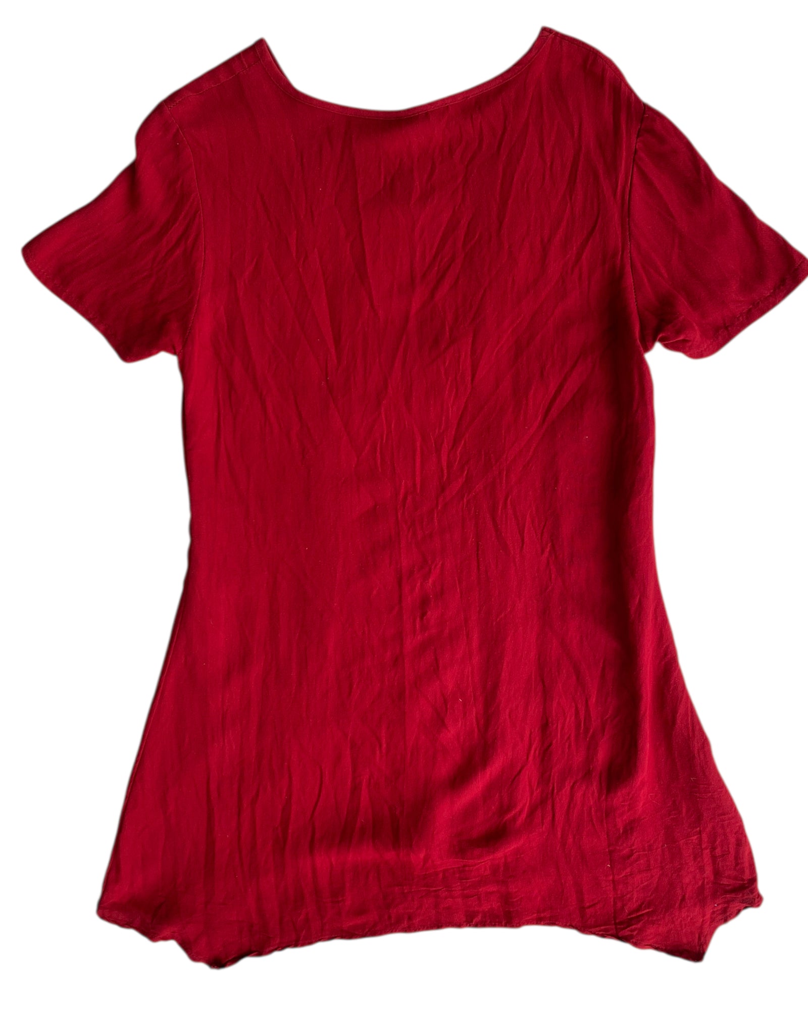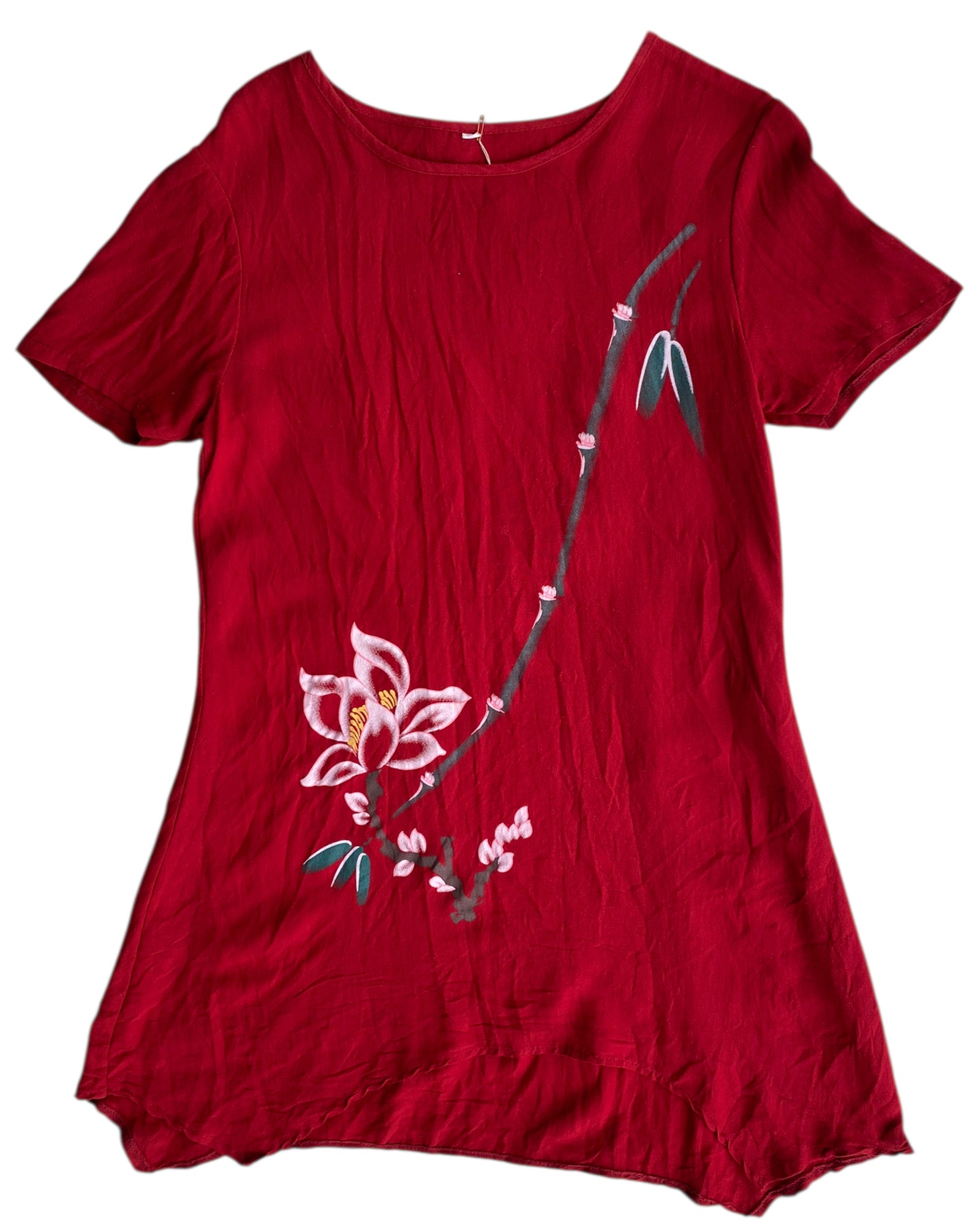 BLUSON LARGO O PUEDE SER USADO COMO MINI VESTIDO EN COLOR ROJO CEREZA CON PRINT DE FLORES EN LA PARTE FRONTAL. ASIMETRIA. EN PERFECTO ESTADO.