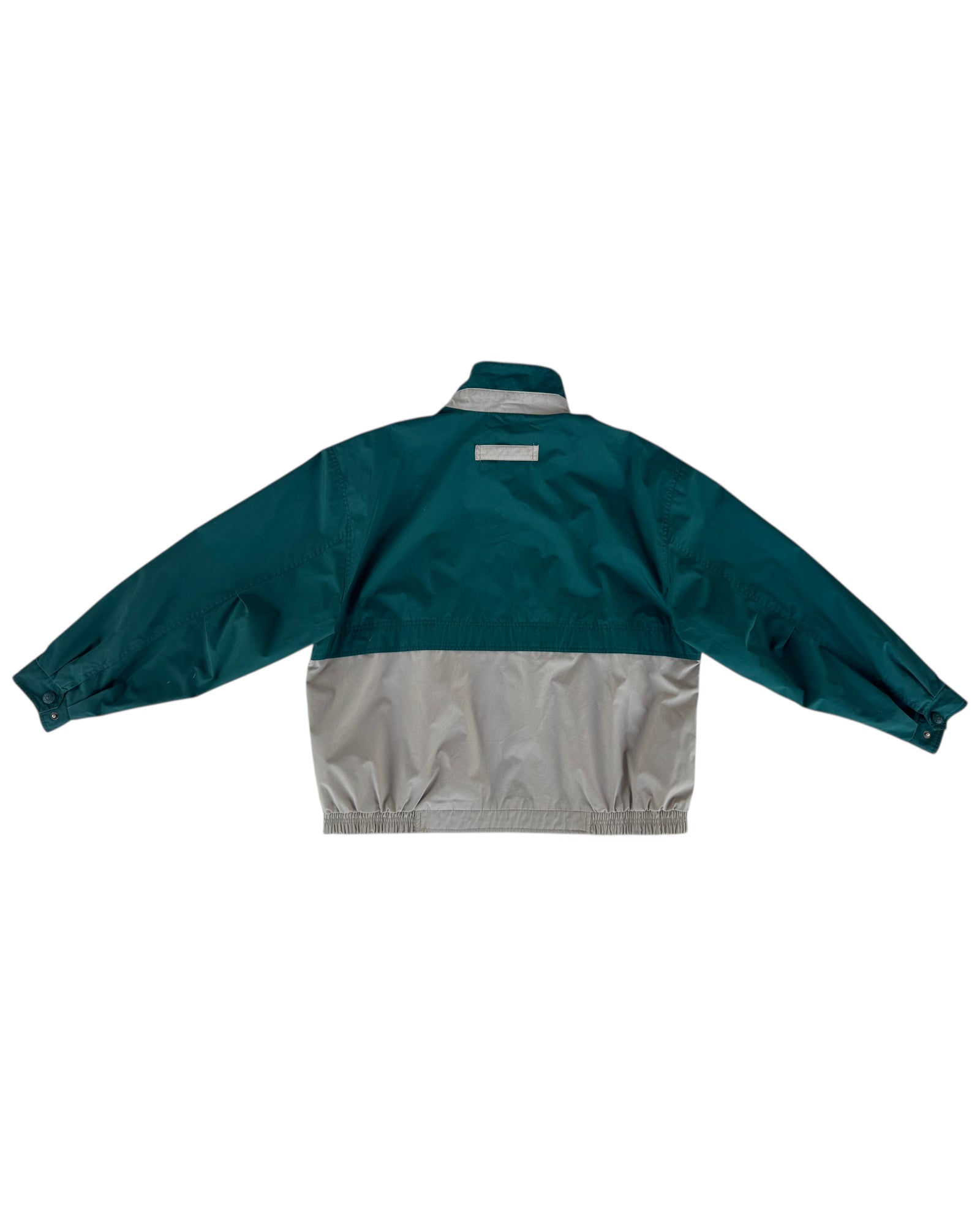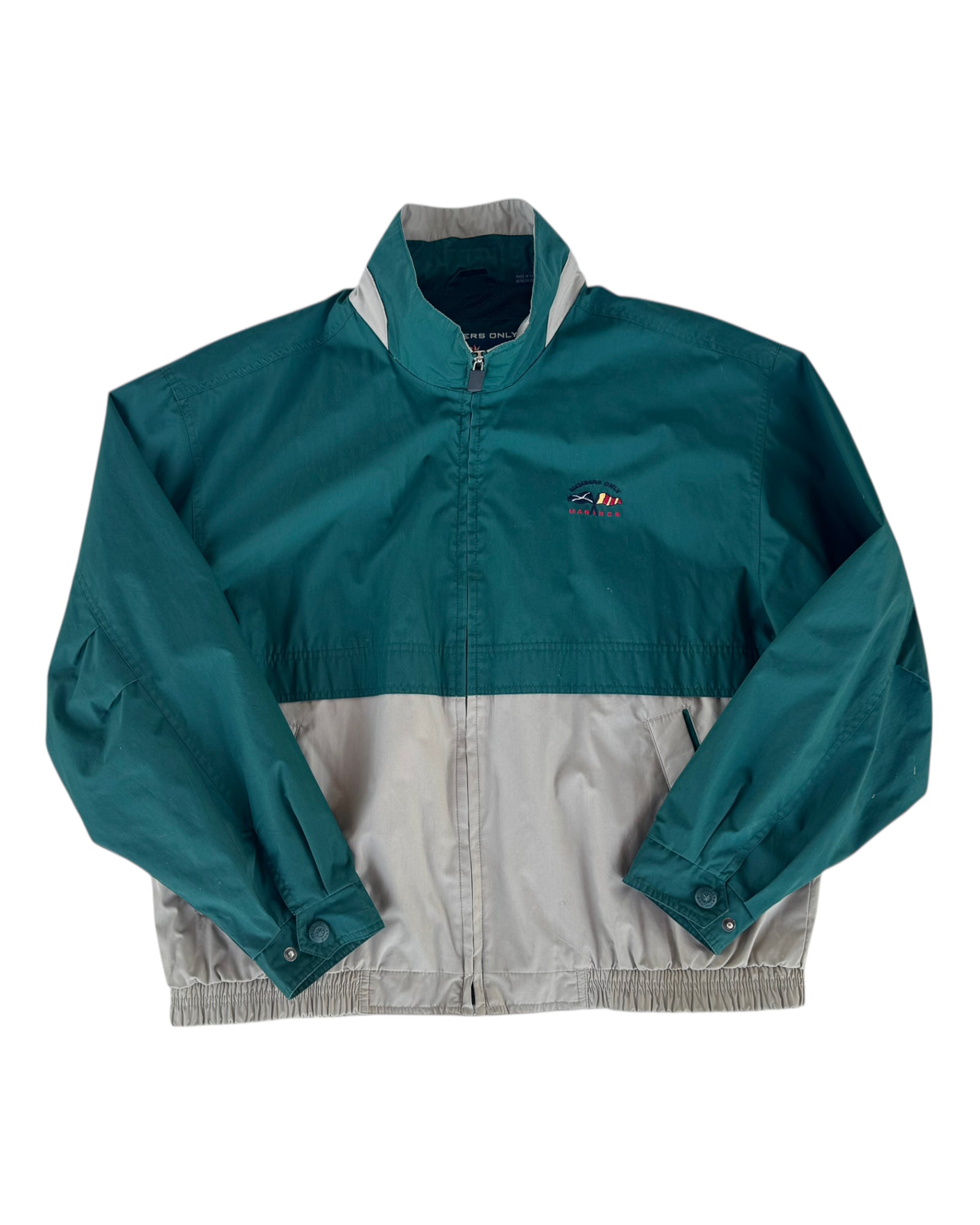 CHAMARRA ESTILO ROMPEVIENTOS 65% POLYESTER Y 35% ALGODON EN COLOR VERDE BOSQUE Y GRIS CON BORDADO EN ROJO DE MARINER. BOLSOS FUNCIONALES EN LA PARTE DELANTERA. NO TIENE DETALLES, EN PERFECTO ESTADO.