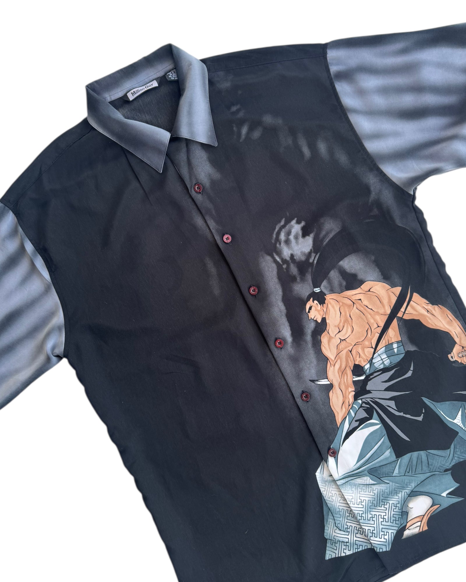 CAMISA OVERSIZED NEGRA CON DEGRADADO GRIS Y PRINT ASIATICO DE HOMBRE EN LA PARTE DELANTERA Y TRASERA, 100% POLYESTER. EN PERFECTO ESTADO, SIN DETALLES.
