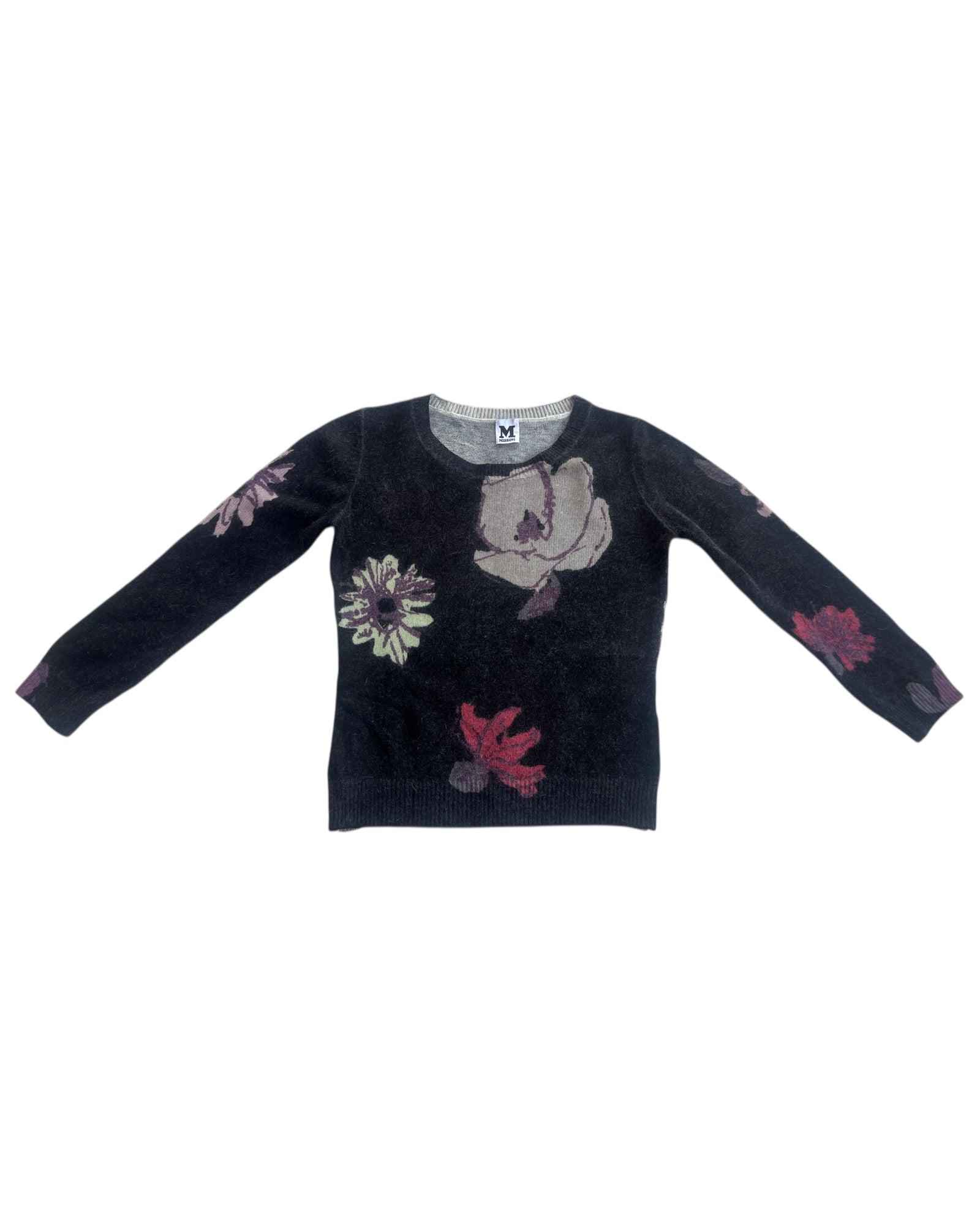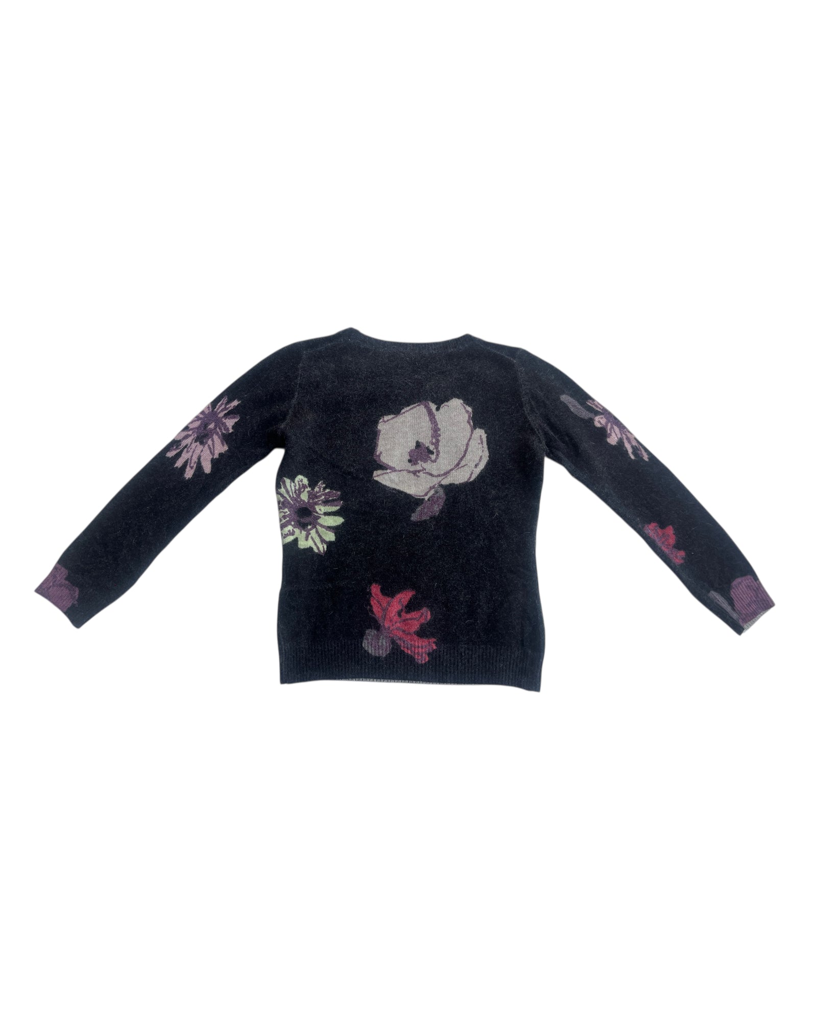 SUETER 75% LANA DE BORREGO Y 25% ANGORA EN COLOR GRIS OSCURO CON PRINT DE FLORES EN COLORES BLANCO, MORADO Y ROSA. NO TIENE DETALLES, EN PERFECTO ESTADO.