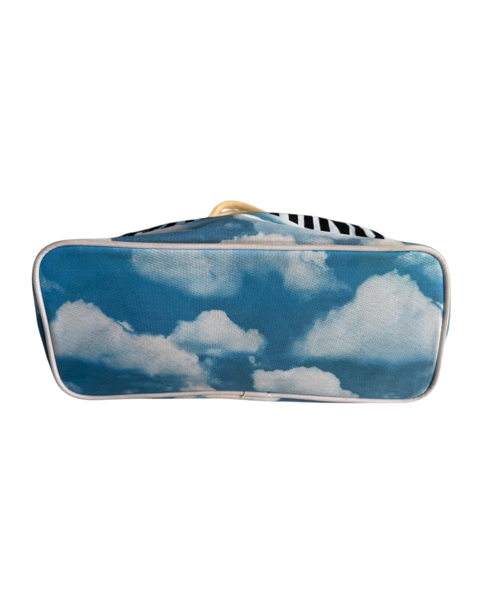 BOLSA AL HOMBRO 100% POLYESTER CON PRINT DEL CIELO EN AZUL Y BLANCO Y LÍNEA ROJA, LETRAS EN NEGRO MOSCHINO Y CORDÓN BLANCO COMO ASA. EN BUEN ESTADO.