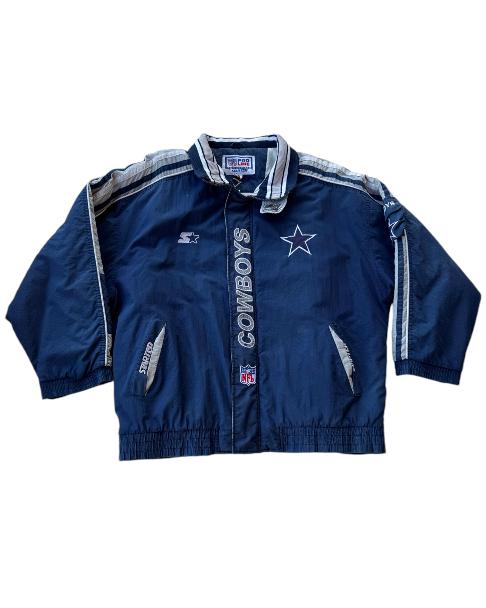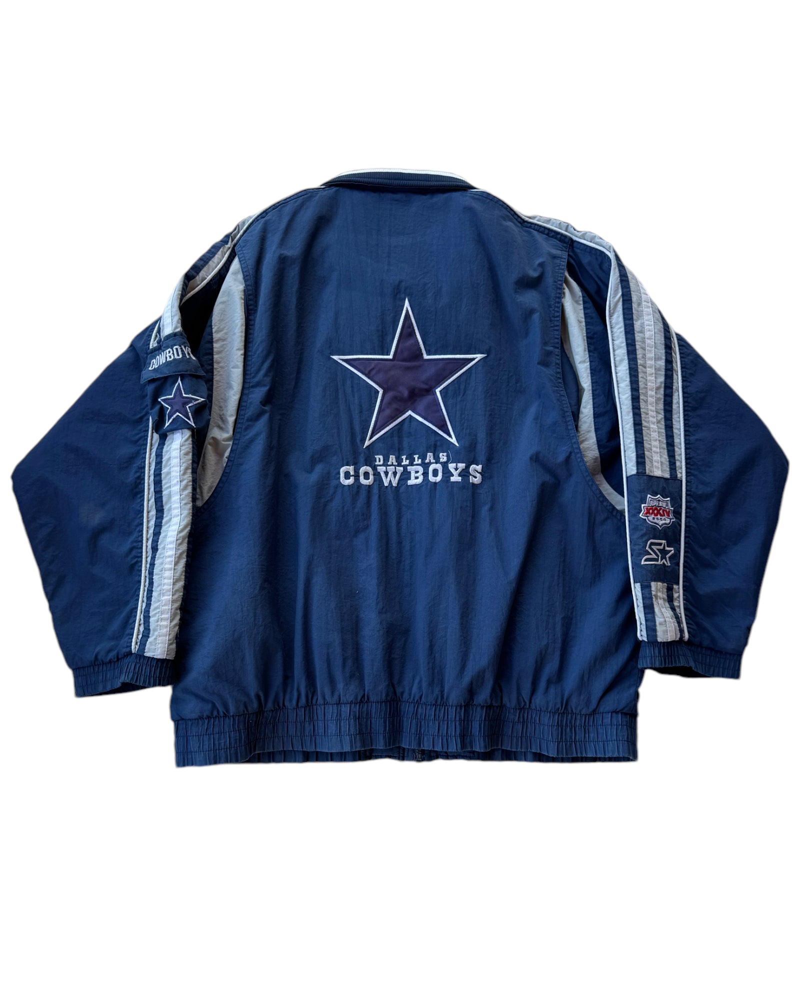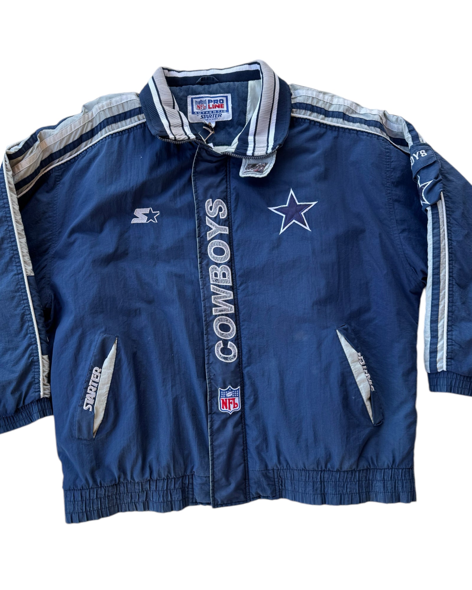 CHAMARRA STARTER PRO LINE DE NFL COWBOYS ACOLCHONADA POR DENTRO Y POR FUERA AZUL NAUTICO, GRIS Y BLANCO CON PARCHES DE TEXAS COWBOYS. LIGERO DESGASTE POR EL TIEMPO