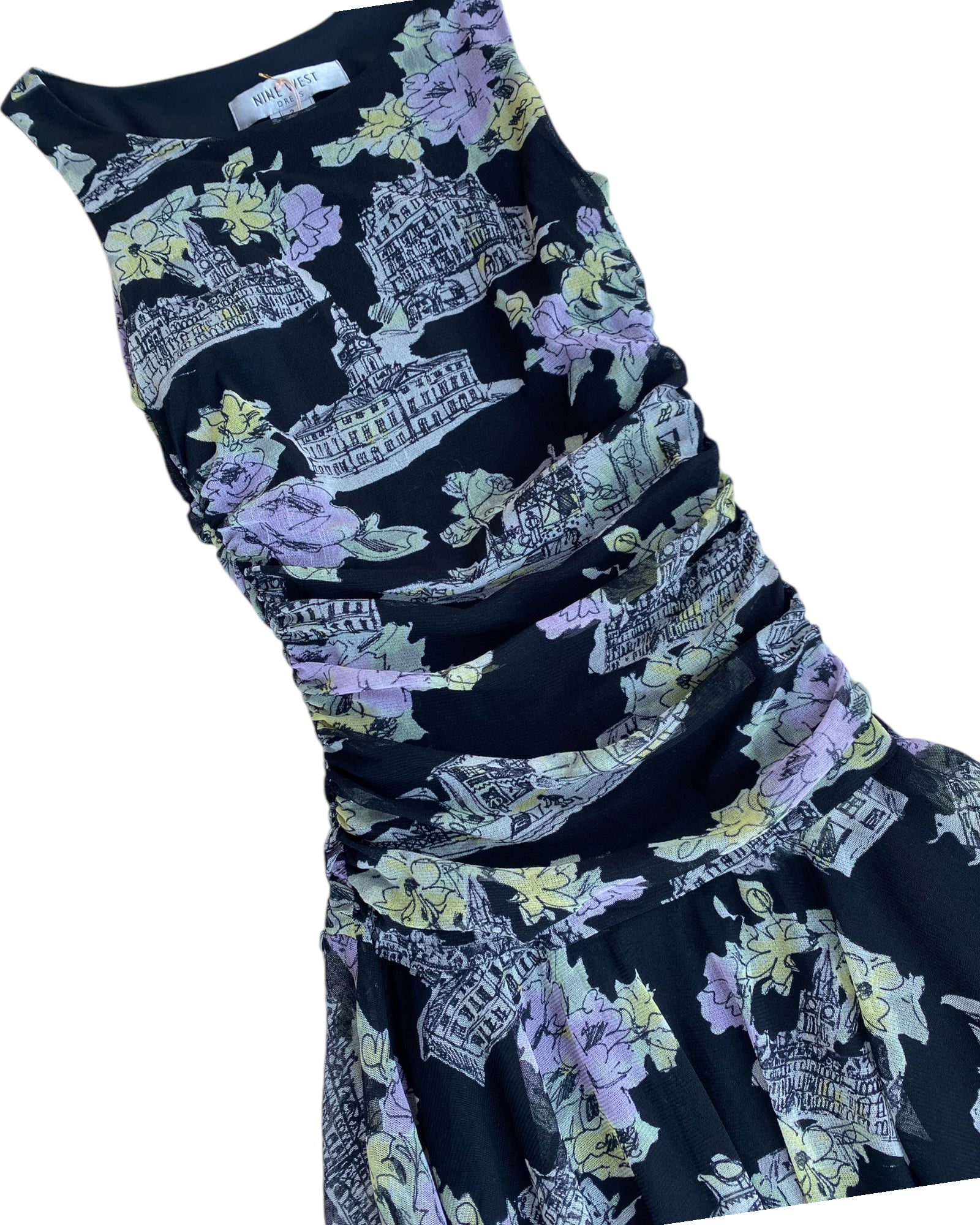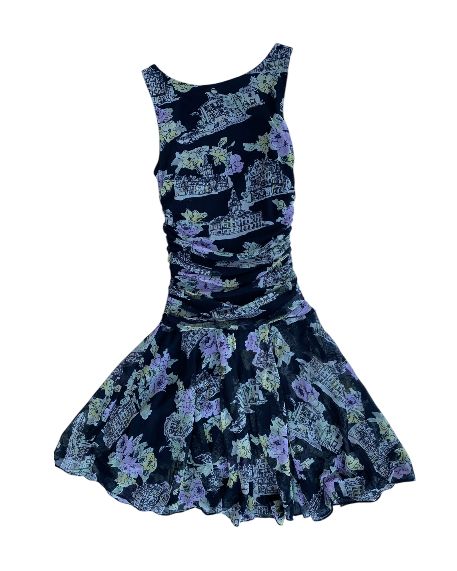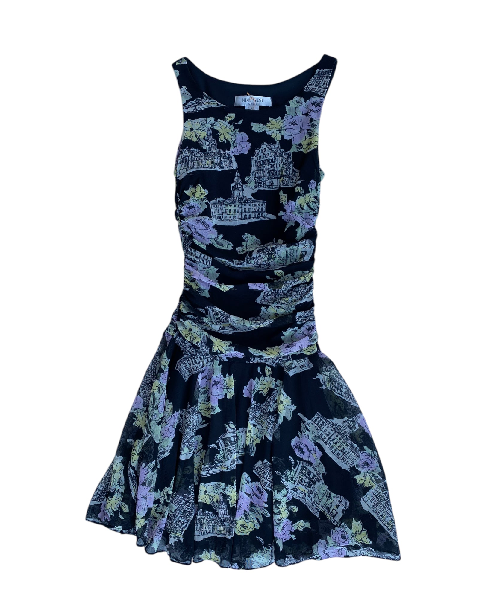 VESTIDO TIPO MESH CORTO EN COLOR NEGRO CON PRINT DE FLORES Y EDIFICIOS EN TONOS PASTEL, CUELLO ALTO, RUSHING EN EL TORSO Y FALDA CON VUELO, EN MUY BUEN ESTADO.100% NYLON.