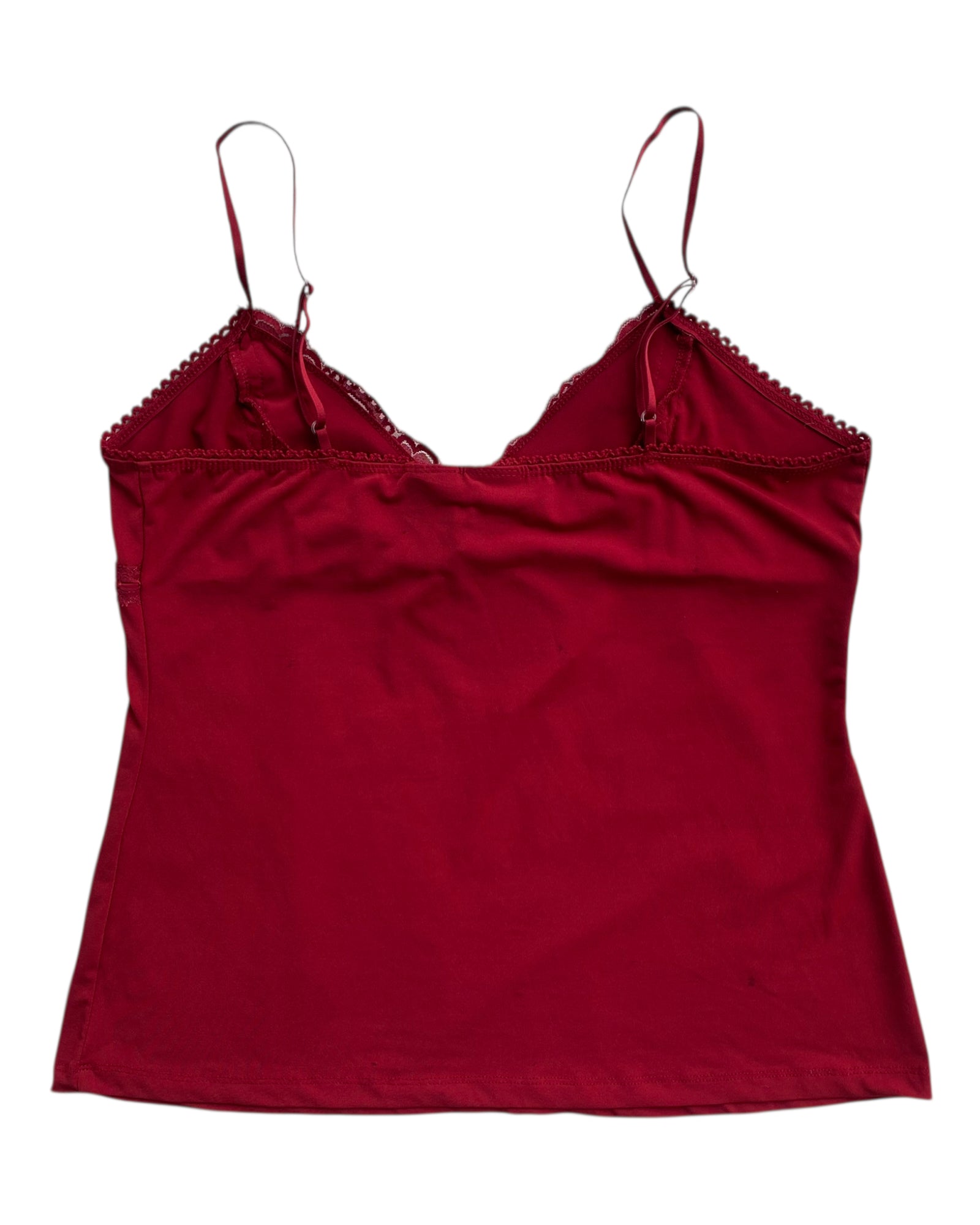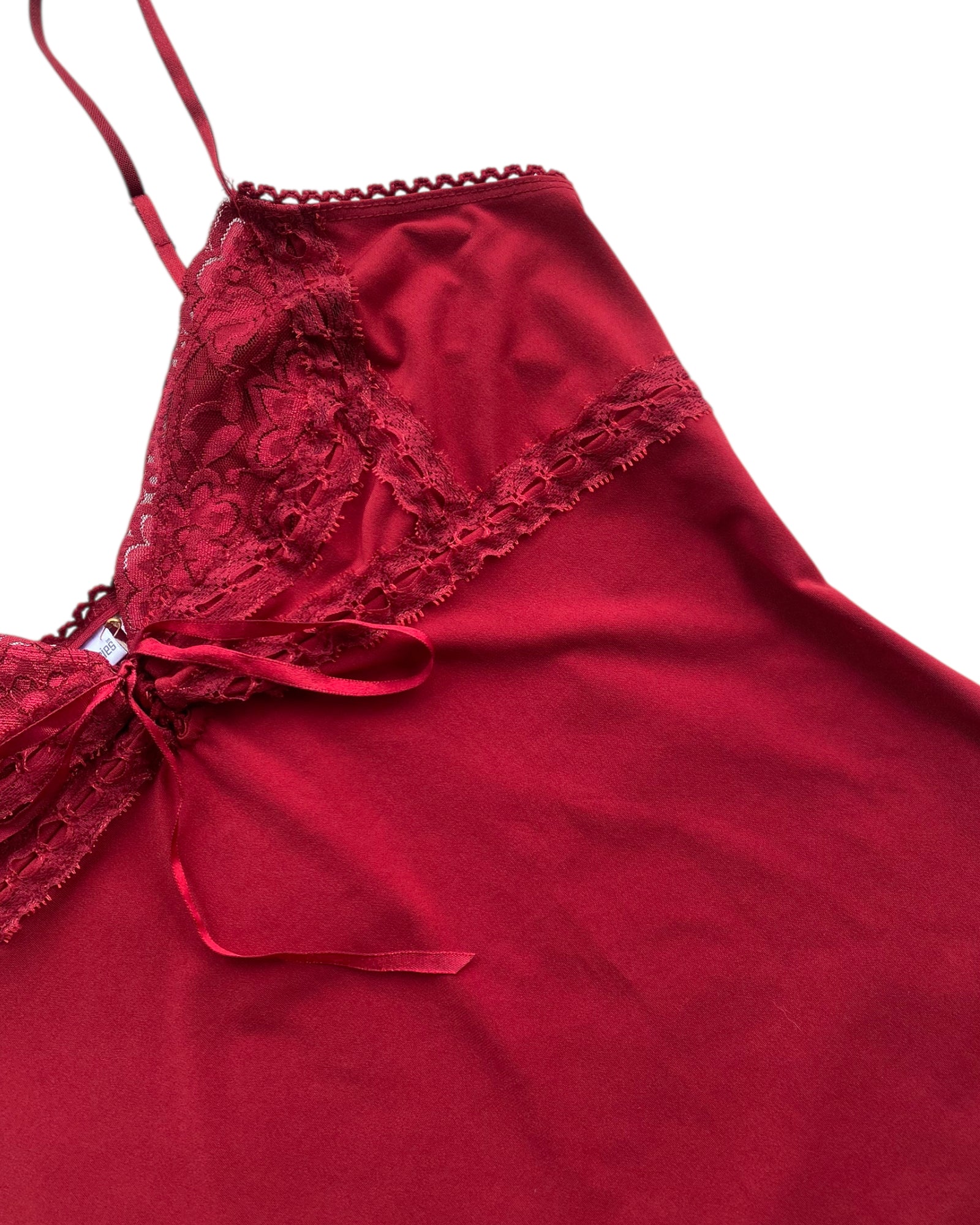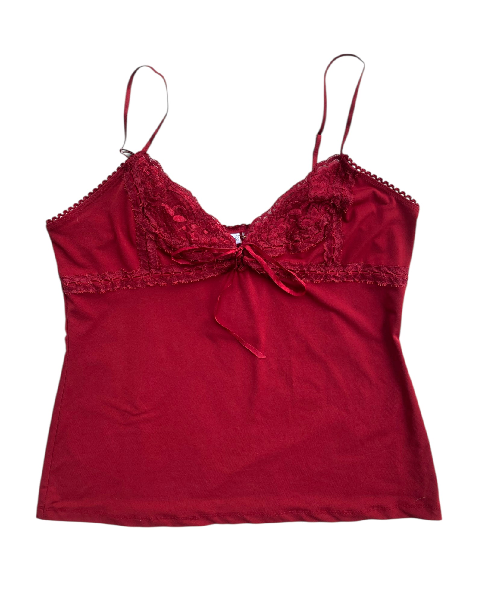 TOP TIPO LENCERO ROJO CEREZA CON ENCAJE EN LA PARTE DEL PECHO DEL MISMO COLOR, TIRANTES AJUSTABLES Y LISTON EN LA PARTE DE EN MEDIO DEL PECHO PARA ADORNAR. 92% POLYESTER Y 8% SPANDEX. EN MUY BUEN ESTADO.