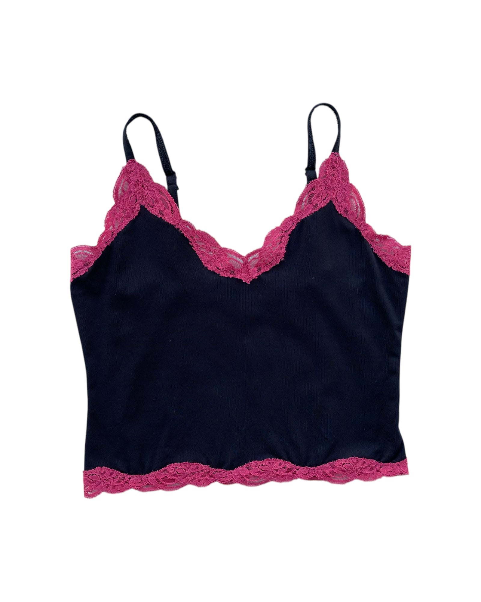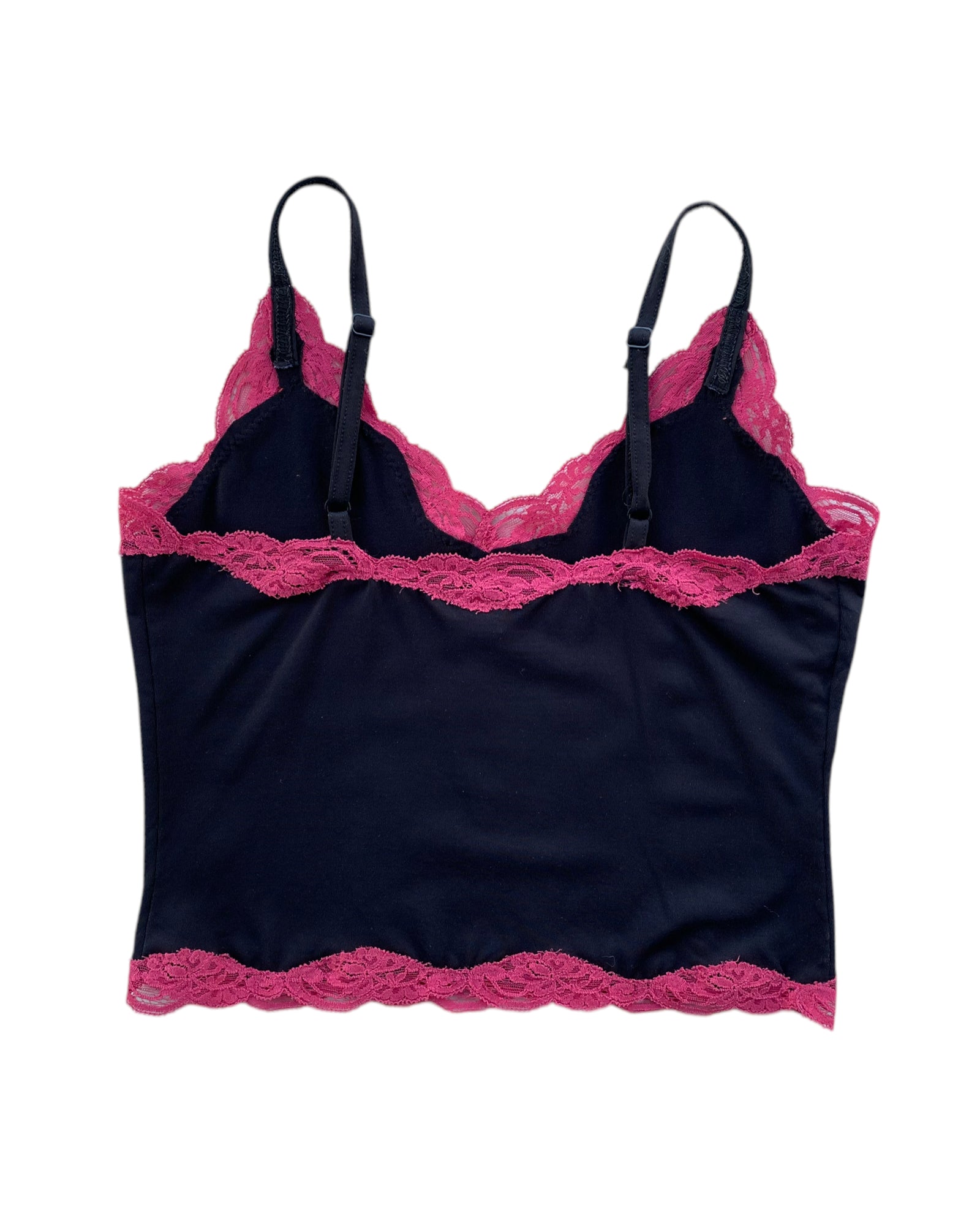 TOP CAMI NEGRO CON ENCAJE ROSA EN EL DOBLADILLO Y TIRANTES AJUSTABLES, ES CROPPED, NO TIENE DETALLES, 90% NYLON 10% LYCRA