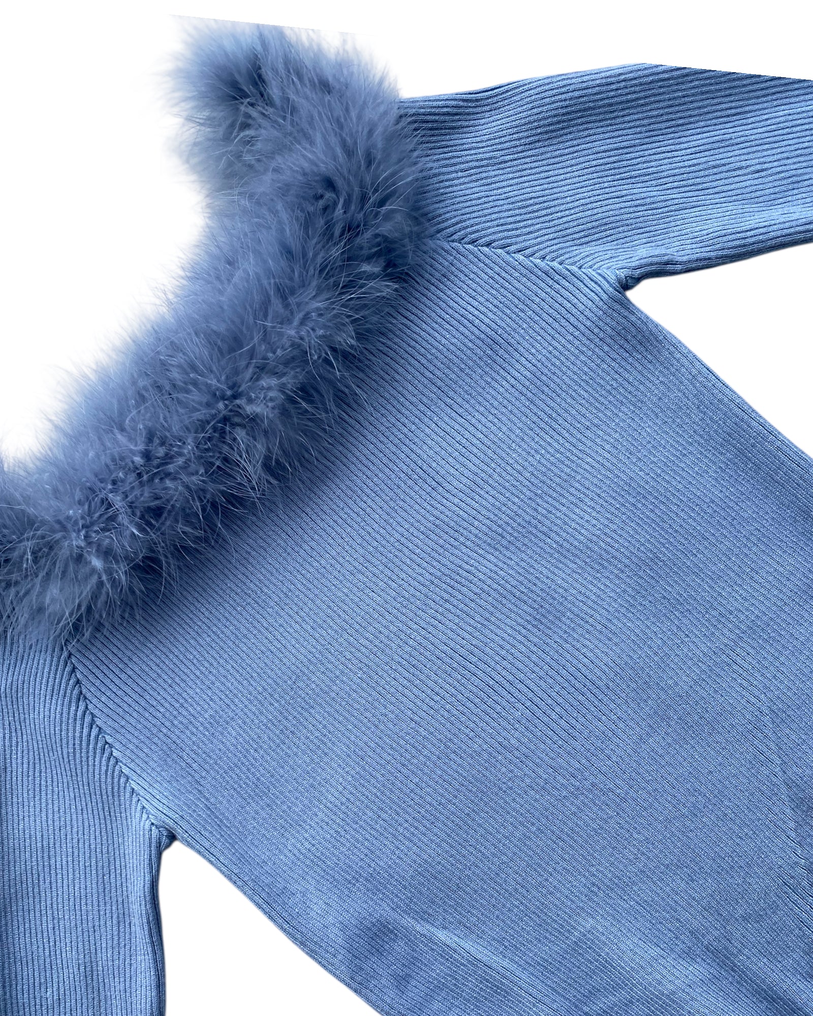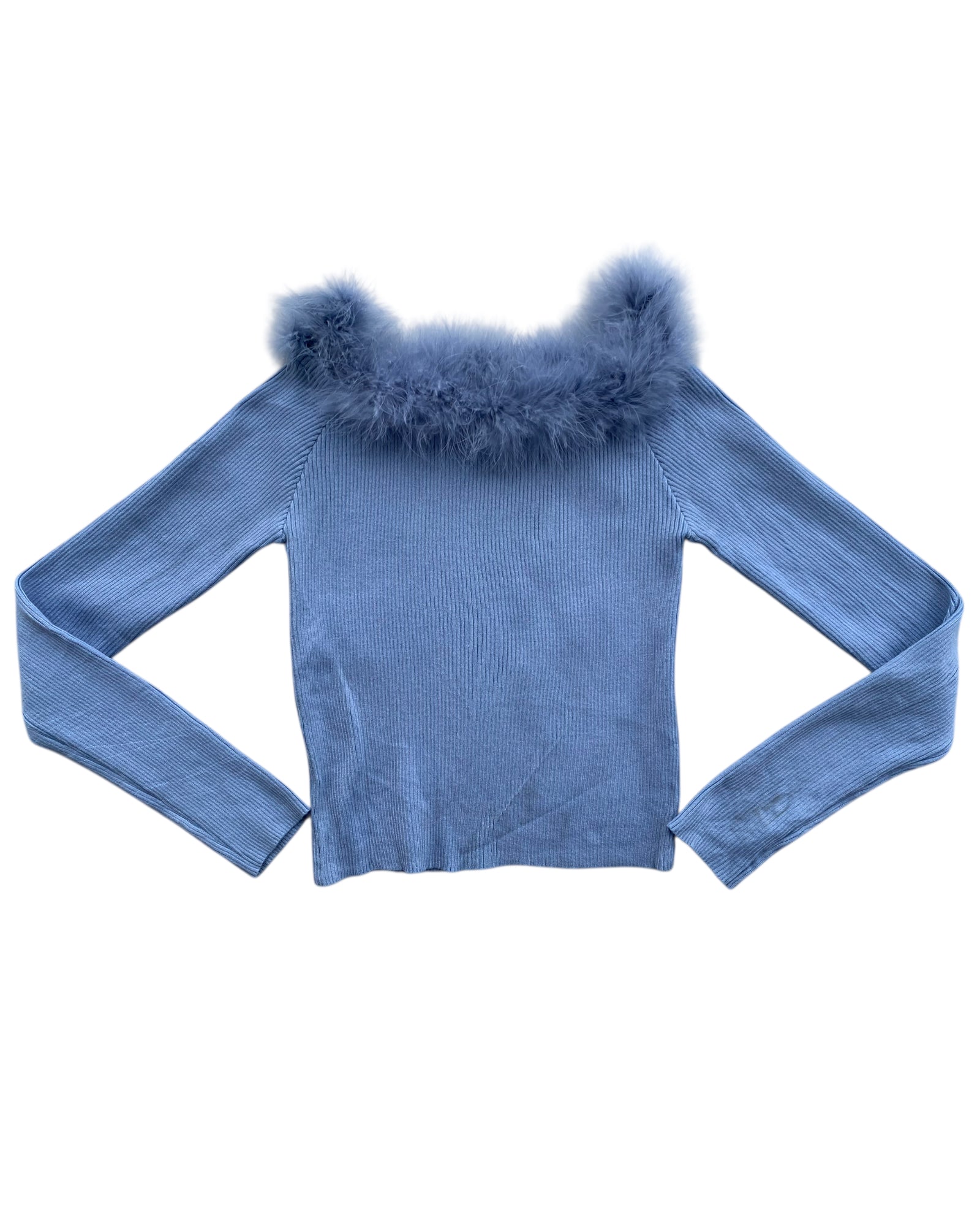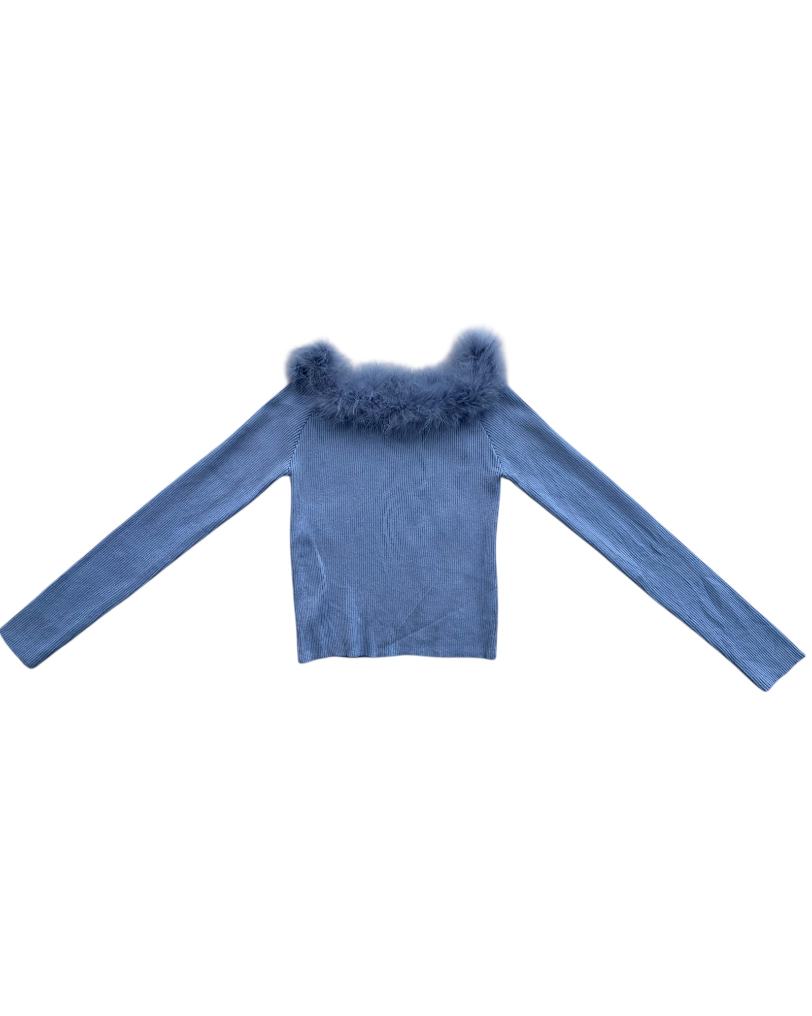 BLUSA DE MANGA LARGA DE PUNTO EN COLOR AZUL CIELO CON PELO FALSO EN EL CUELLO. NO TIENE DETALLES ESTA EN PERFECTO ESTADO, 100% ALGODON