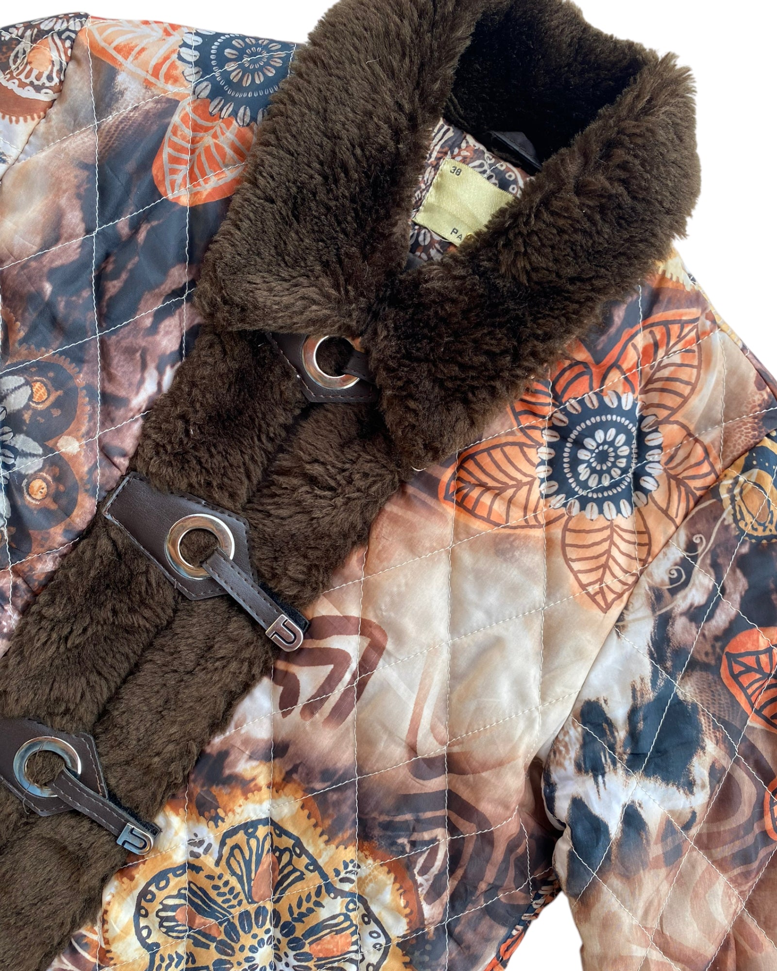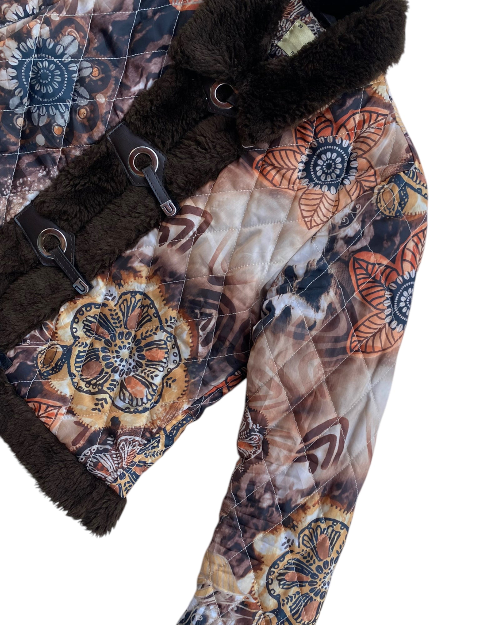 CHAMARRA PUFFY CON PELO CAFE FALSO EN EL CENTRO Y BOTONES CON VELCRO Y HARDWEAR PLATEADO, PELO EN LOS PUÑOS Y CUELLO Y PRINT DE FLORES EN COLORES CAFES. NO TIENE DETALLES. 100% POLYESTER