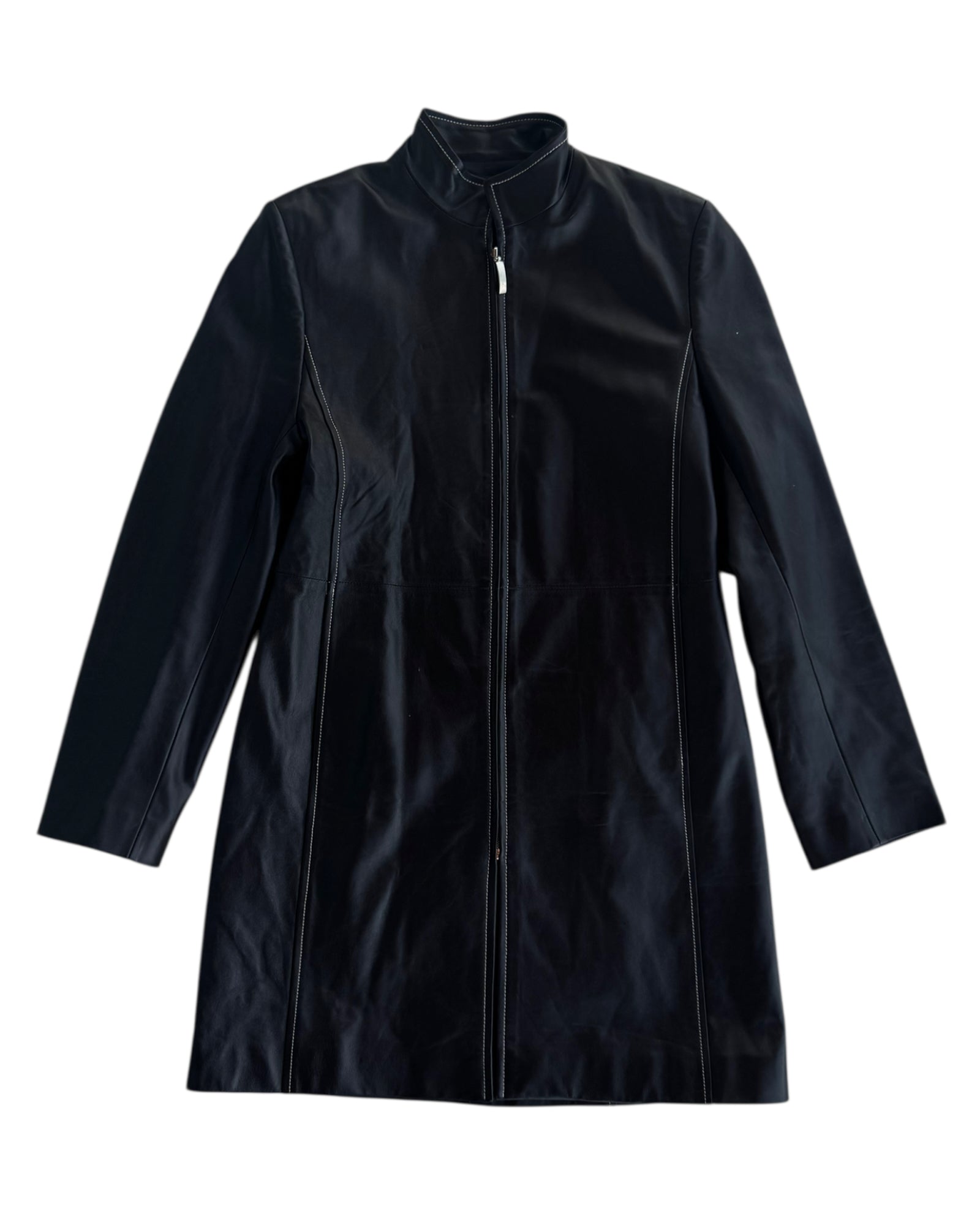 CHAMARRA NEGRA DE PIEL 100% PIEL OVINO CON COSTURAS EN COLOR BLANCO, CIERRE PLATEADO EN FRENTE CON BOLSILLOS FUNCIONALES AL FRENTE. NO TIENE DETALLES, EN PERFECTO ESTADO.