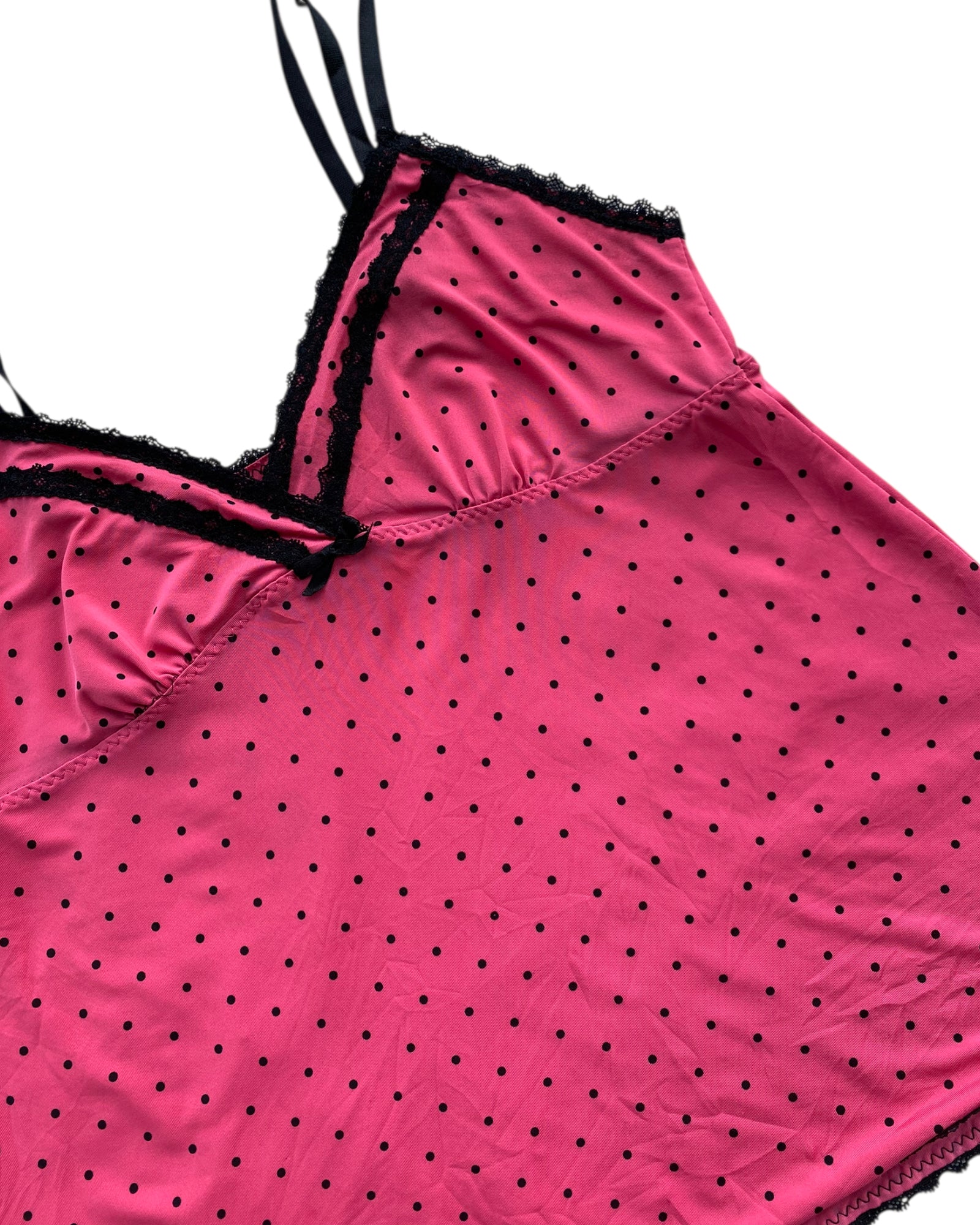 TOP ROSA FUERTE CON PUNTOS NEGROS, DETALLE DE ENCAJE EN NEGRO Y MOÑITO EN EL PECHO, TIRANTES AJUSTABLES, EN PERFECTO ESTADO. 100% POLYESTER
