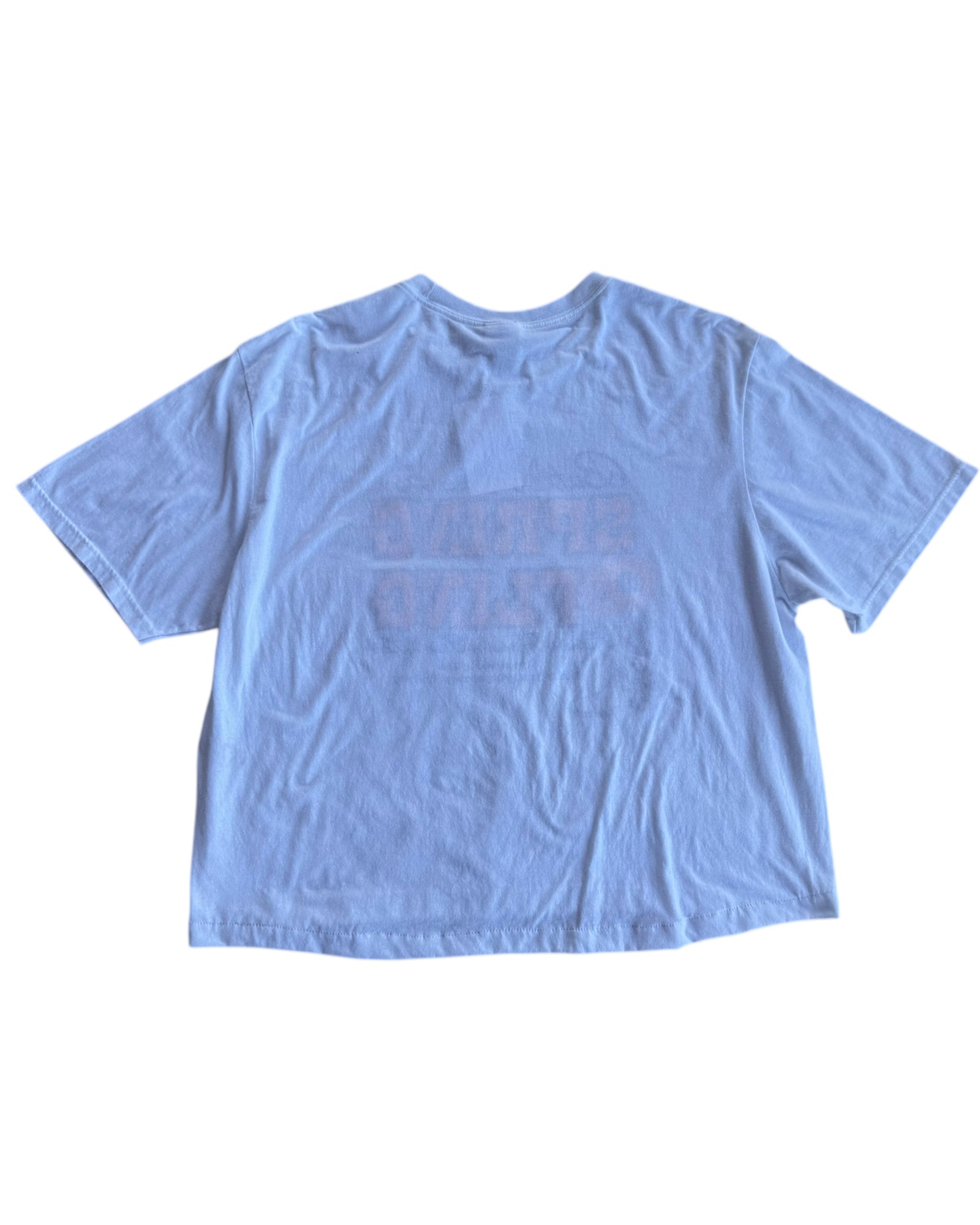 PLAYERA BLANCA DE MANGA CORTA CON PRINT DELANTERO DE BUTTER COUNTY EN COLOR NEGRO Y CON DETALLE EN AMARILLO DE GIRASOL Y UNA BOTA NEGRA. 50% POLYESTER, 37% ALGODÓN Y 13% RAYÓN NO TIENE DETALLES, EN PERFECTO ESTADO.