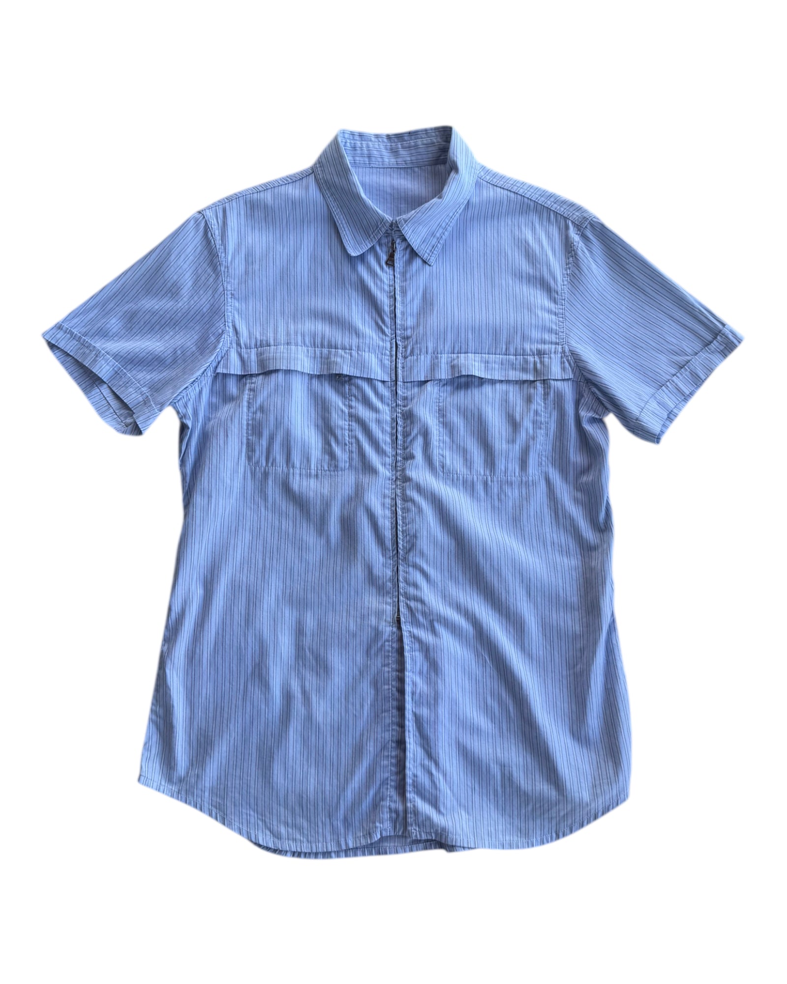 CAMISA DE RAYAS VERTICALES EN COLOR BLANCO Y NEGRO CON FONDO EN COLOR AZUL CLARO Y DOS BOLSILLOS CON CIERRES PLATEADOS Y CIERRE EN MEDIO DE COLOR PLAEADO, NO TIENE DETALLES, EN PERFECTO ESTADO.