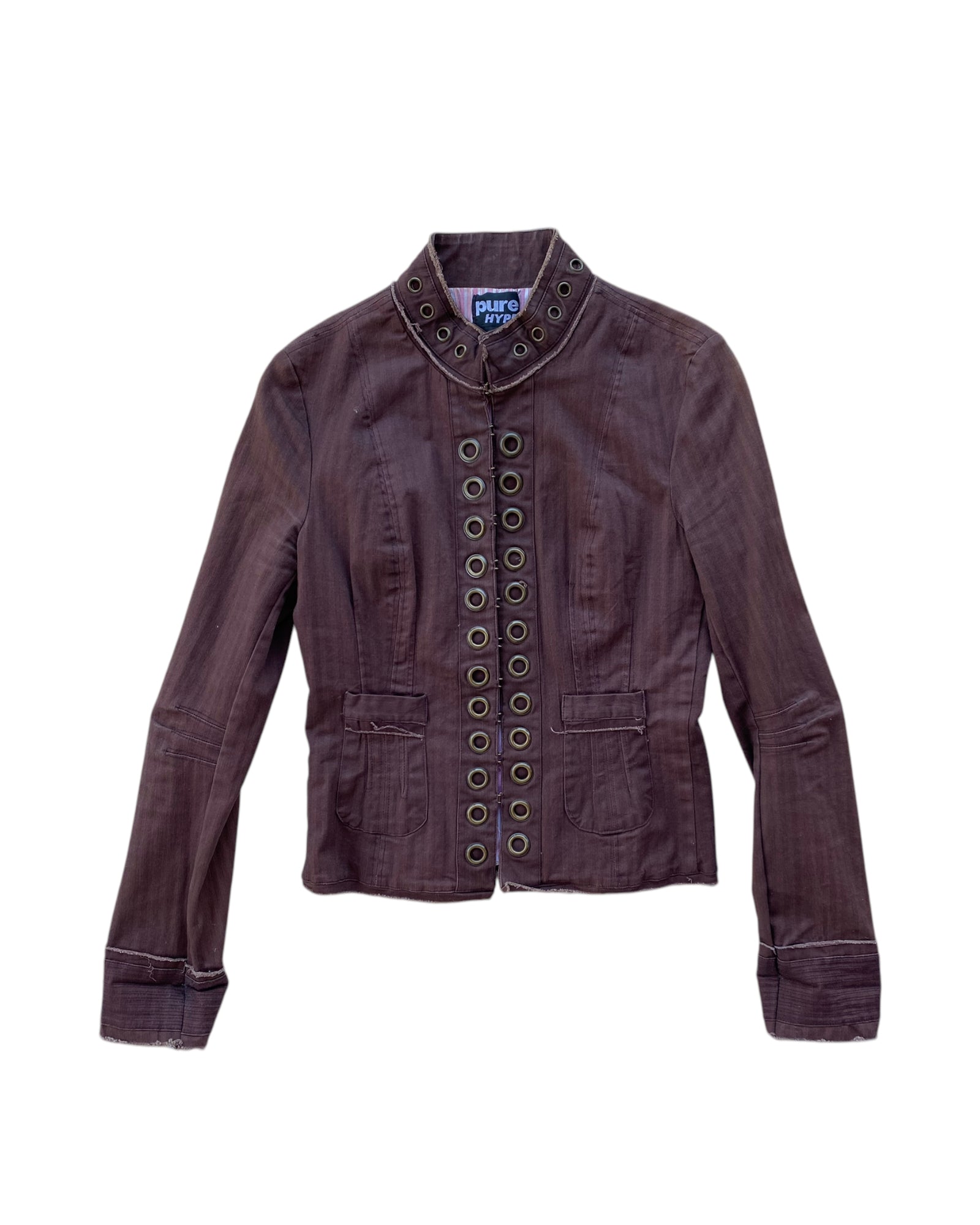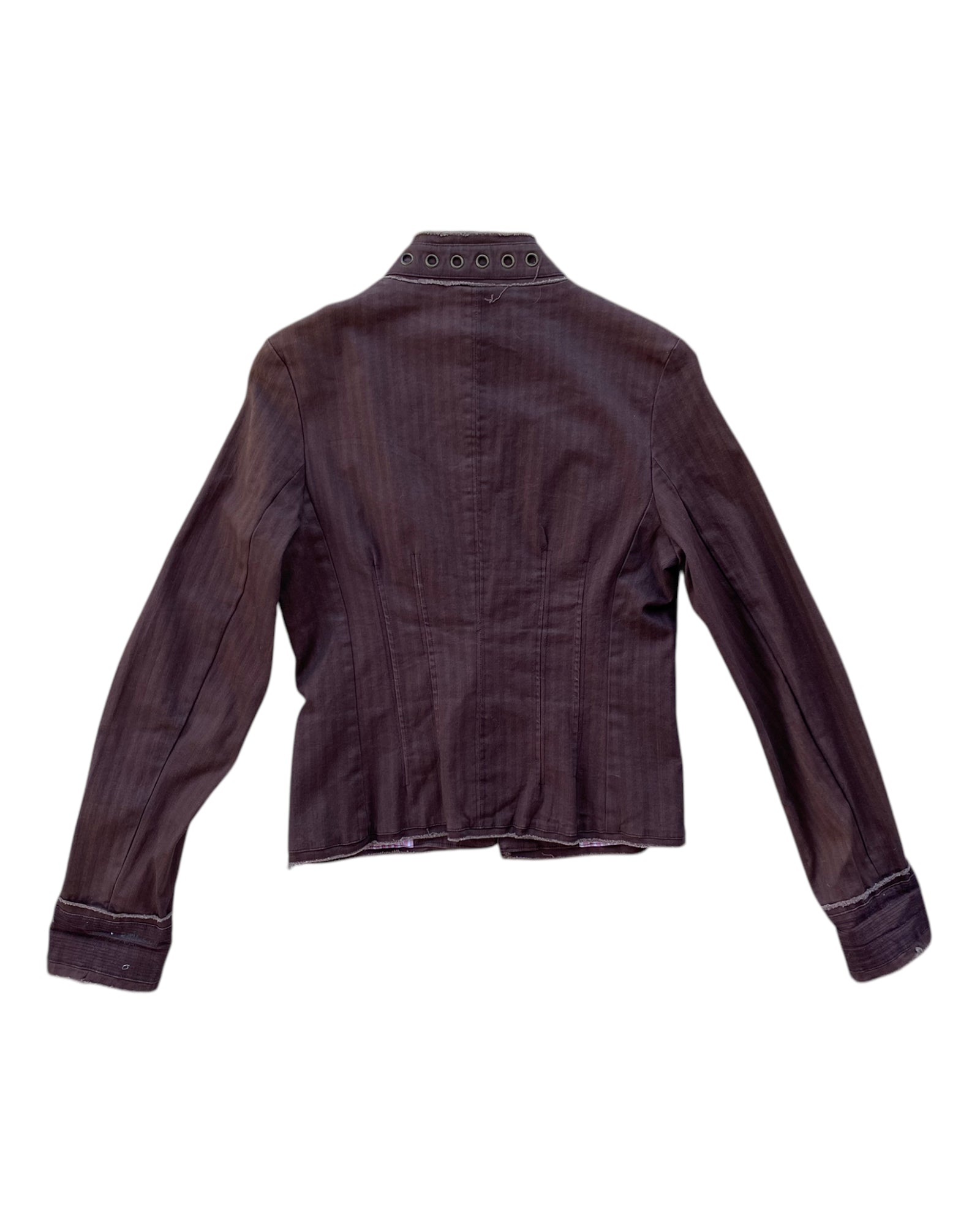 CHAMARRA CAFE OSCURO CON ESTOPEROLES DORADOS EN TODO EL CUELLO Y PECHO. CERRADURA SIN BOTONES. 90% ALGODÓN Y 3% SPANDEX. SIN DETALLES DE USO.