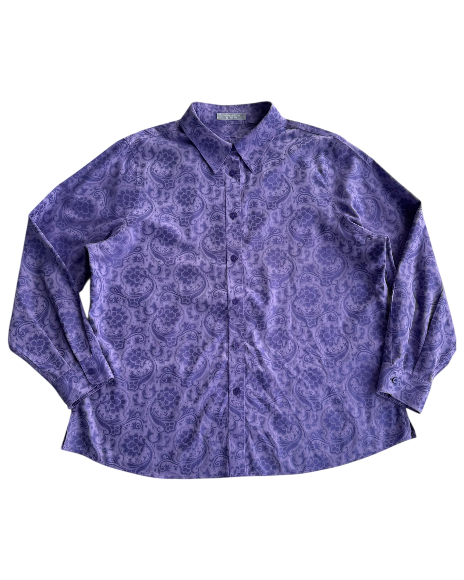 CAMISA NON- IRON 100% POLYESTER EN COLOR MORADO CON PATRON DE FLORES EN UN TONO DE MORADO MÁS CLARO. BOTONES MORADOS EN EL MEDIO PEQUEÑOS, NO TIENE DETALLES, EN PERFECTO ESTADO.