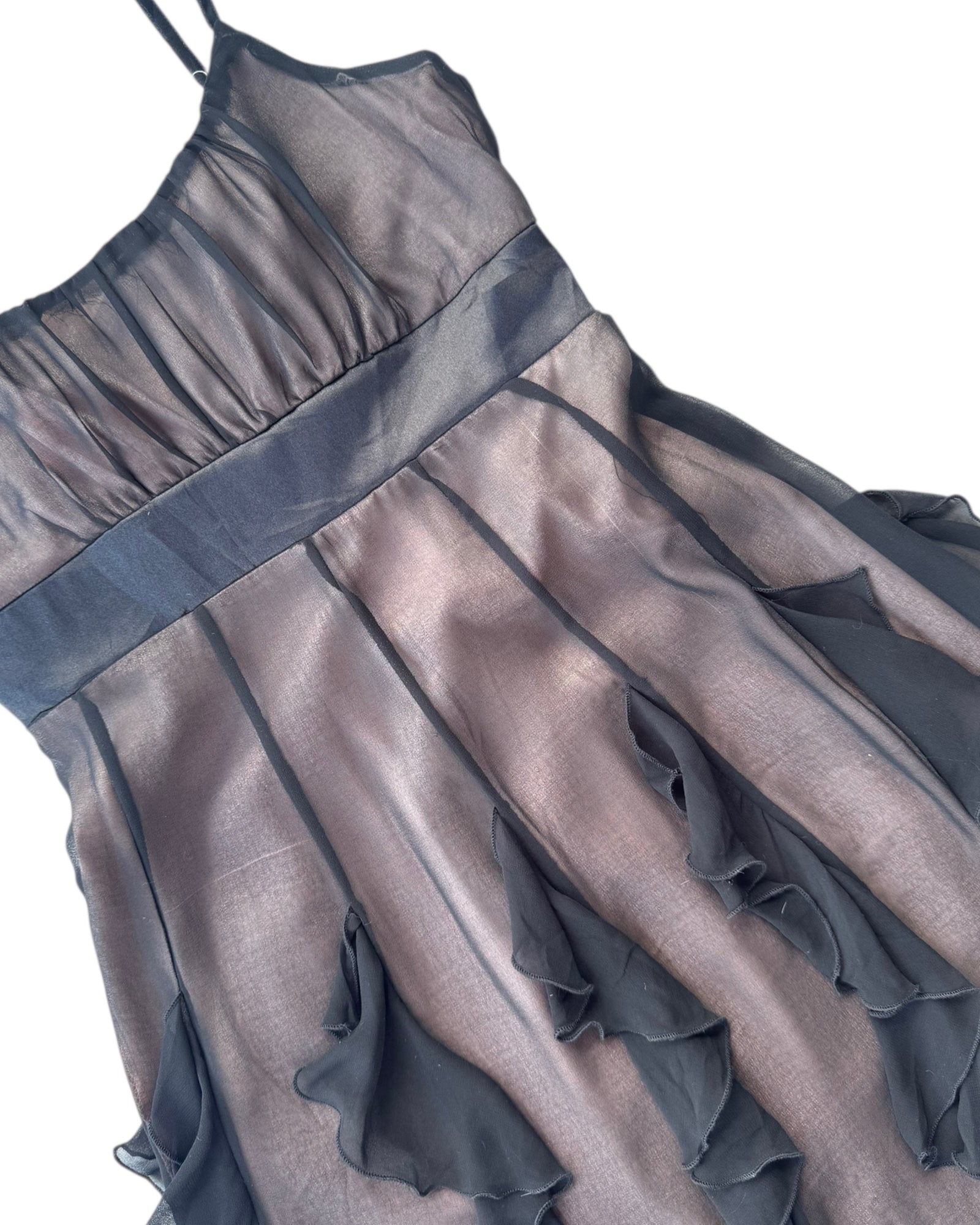 VESTIDO 100% POLYESTER DE TELA SATINADA EN COLOR ROSA PALO CON CAPA DE MESH EN COLOR NEGRO CON RUFLES, TIRANTES AJUSTABLES, LISTON NEGRO EN EL PECHO CON TIRAS PARA AMARRAR EN LA PARTE TRASERA, NO TIENE DETALLES, EN PERFECTO ESTADO.