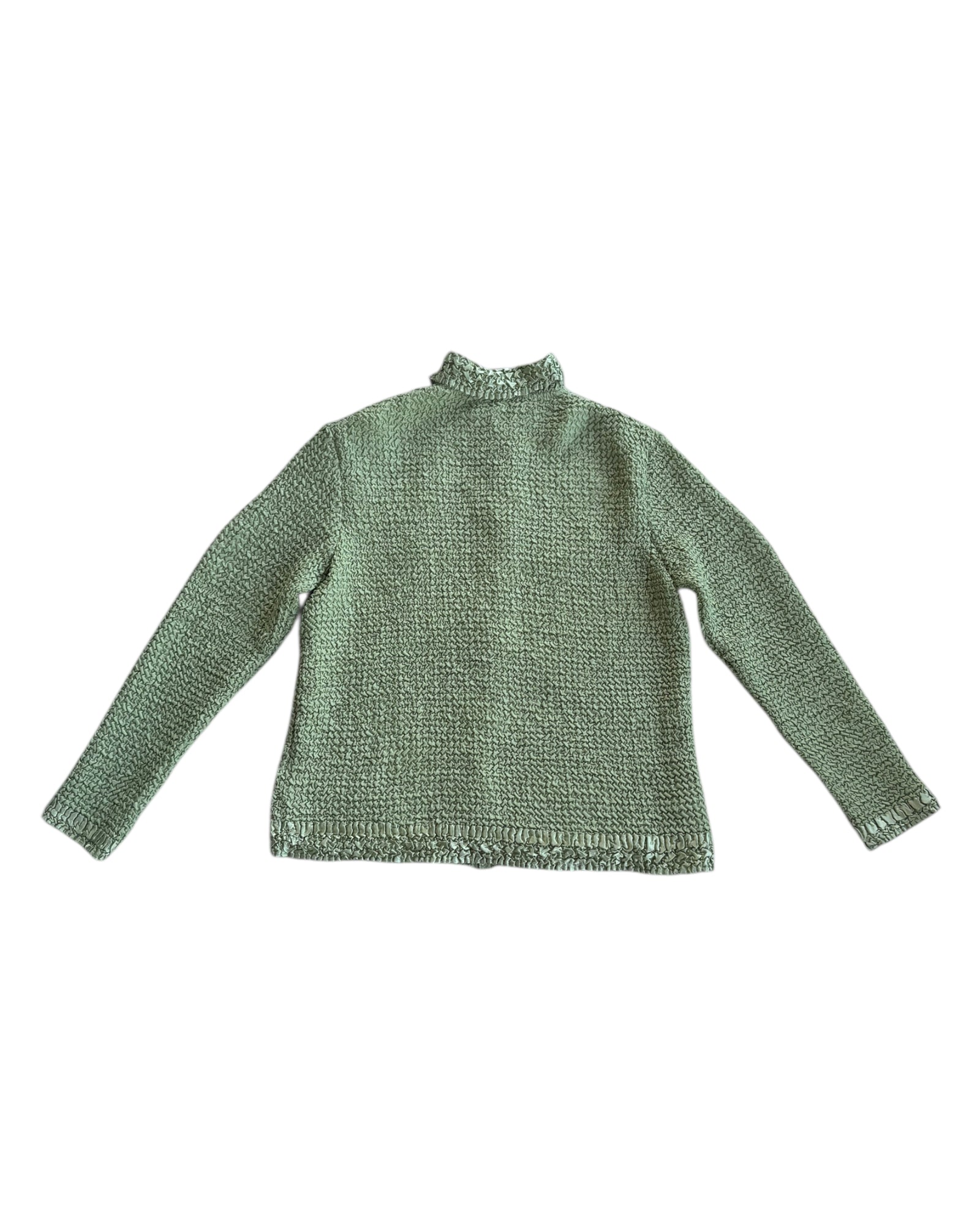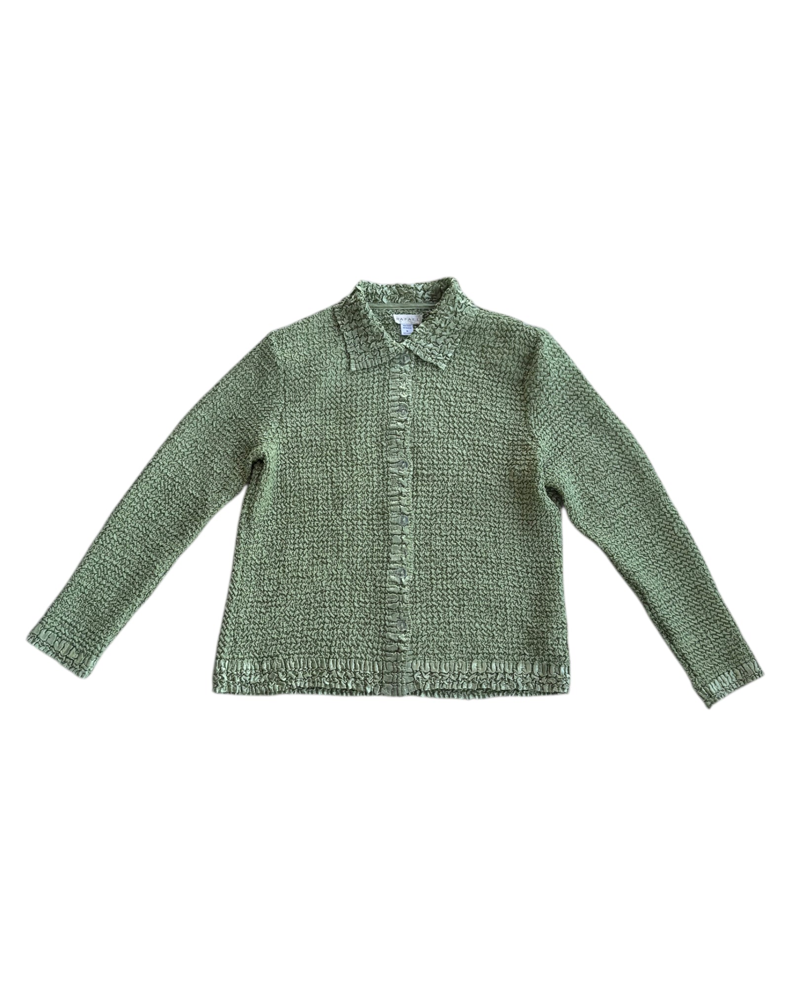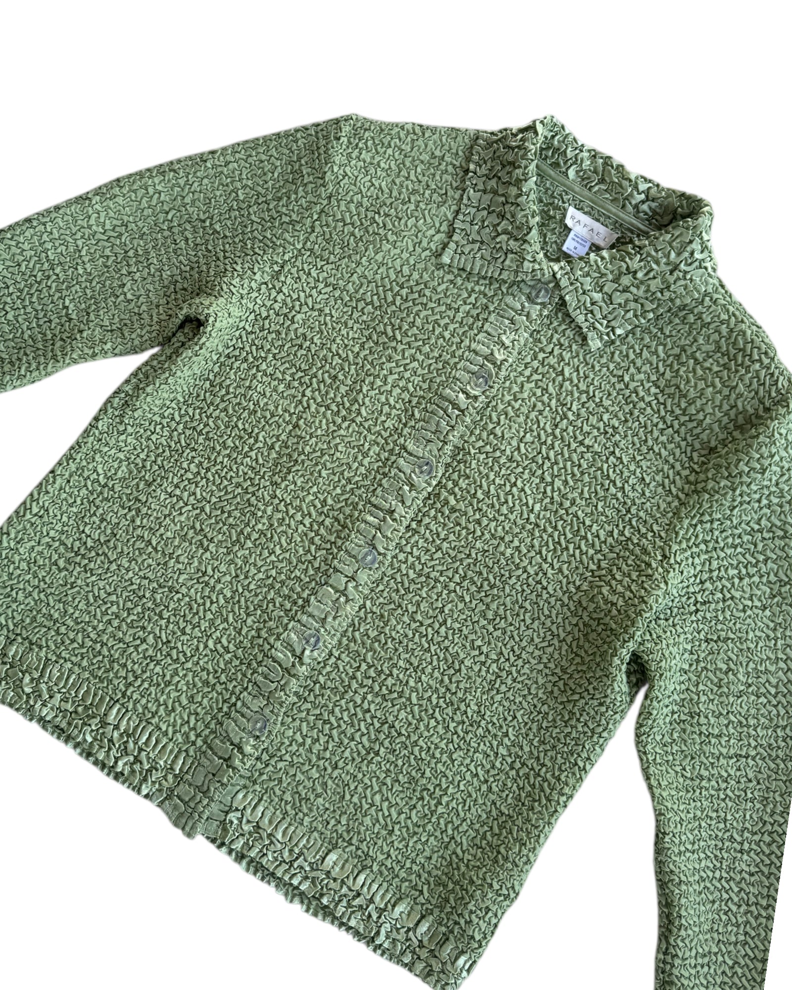 CAMISA VERDE CON TEXTURA DE PALOMITAS QUE ESTIRA Y SE AMOLDA, COLOR VERDE CON BOTONES TRANSPARENTES EN EL MEDIO, NO TIENE DETALLES, EN PERFECTO ESTADO.