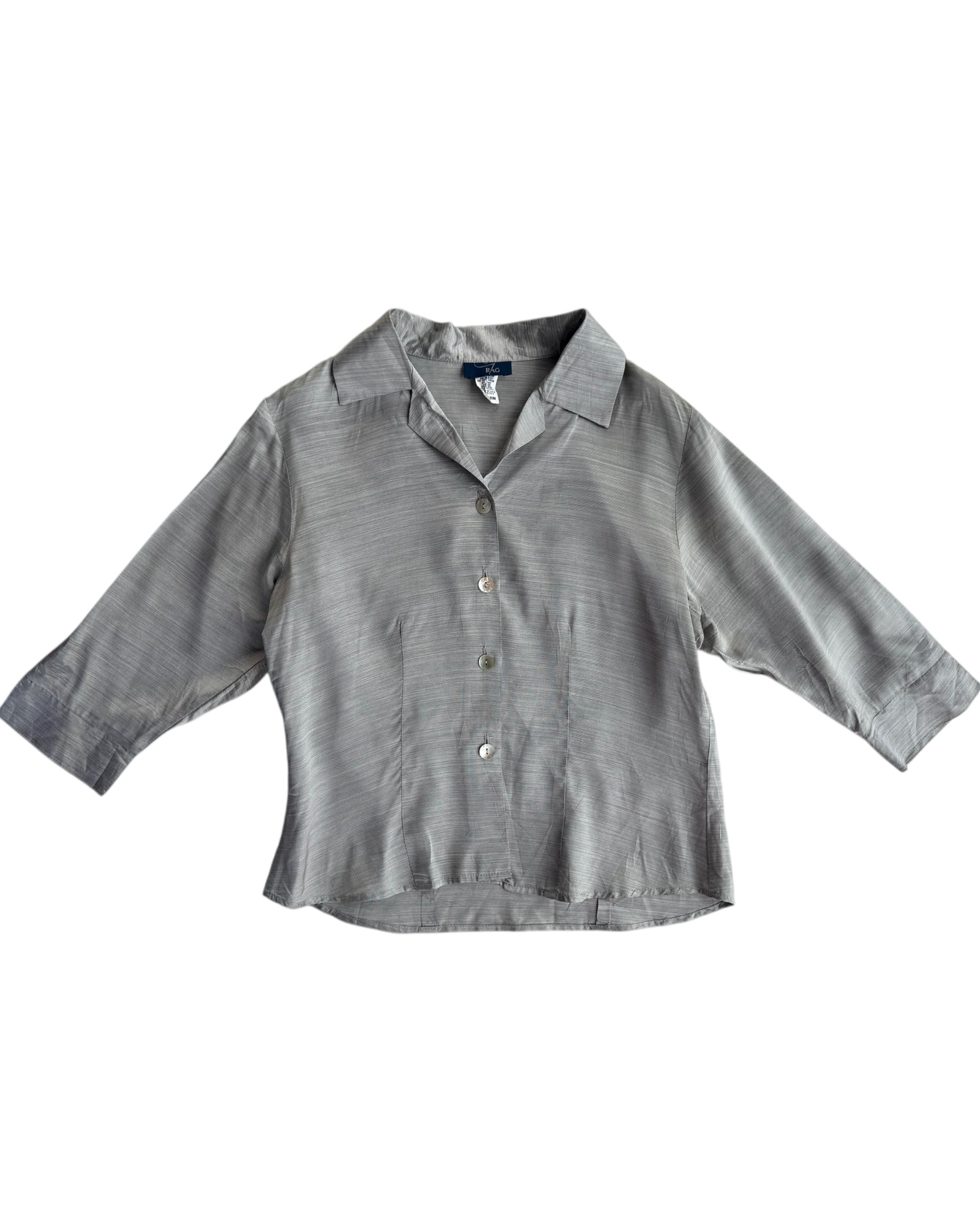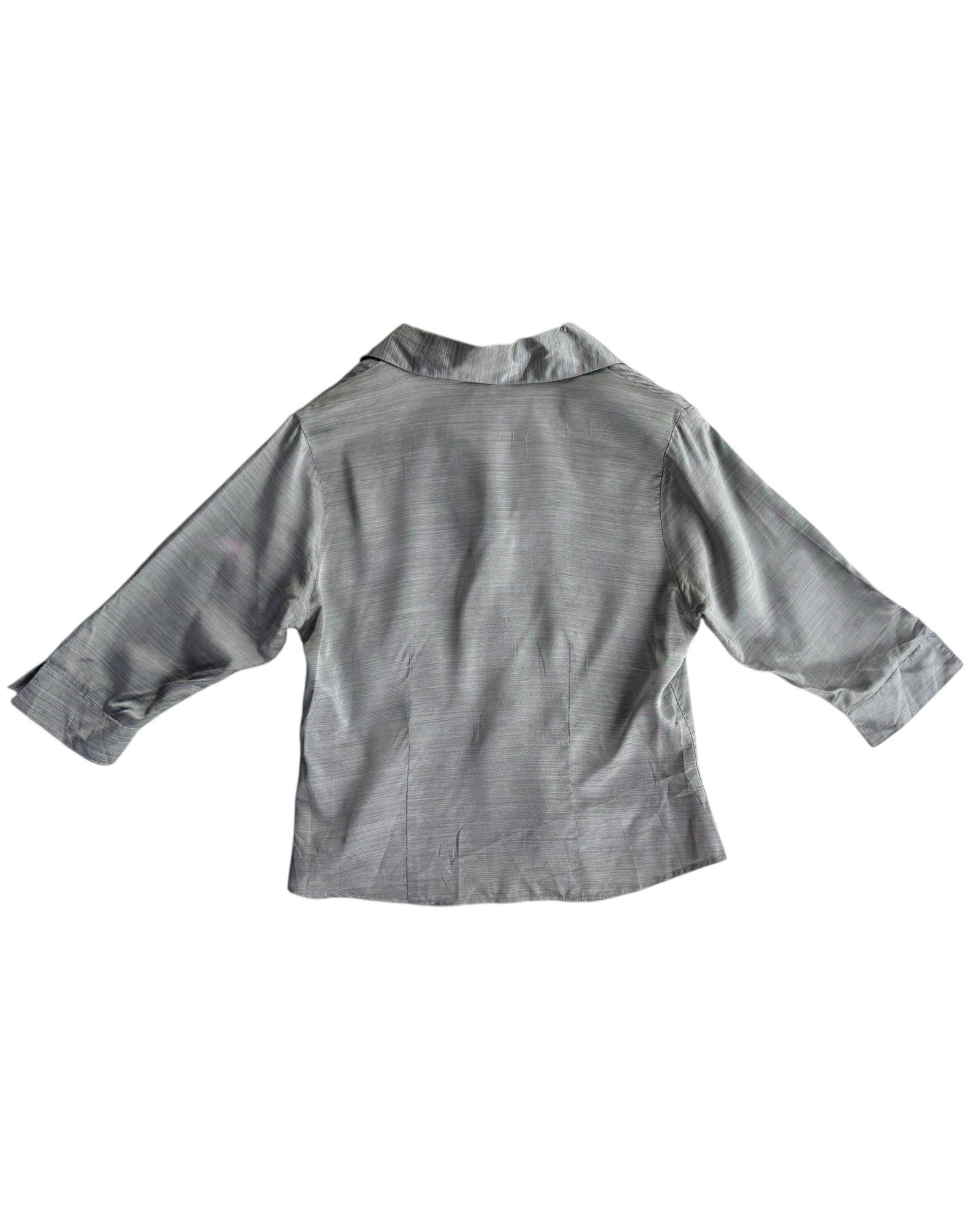 CAMISA COLOR PLATEADA, CON CIERRE DE BOTONES EN PARTE DELANTERA. 100% ACETATO. SIN DETALLES, EN PERFECTAS CONDICIONES.