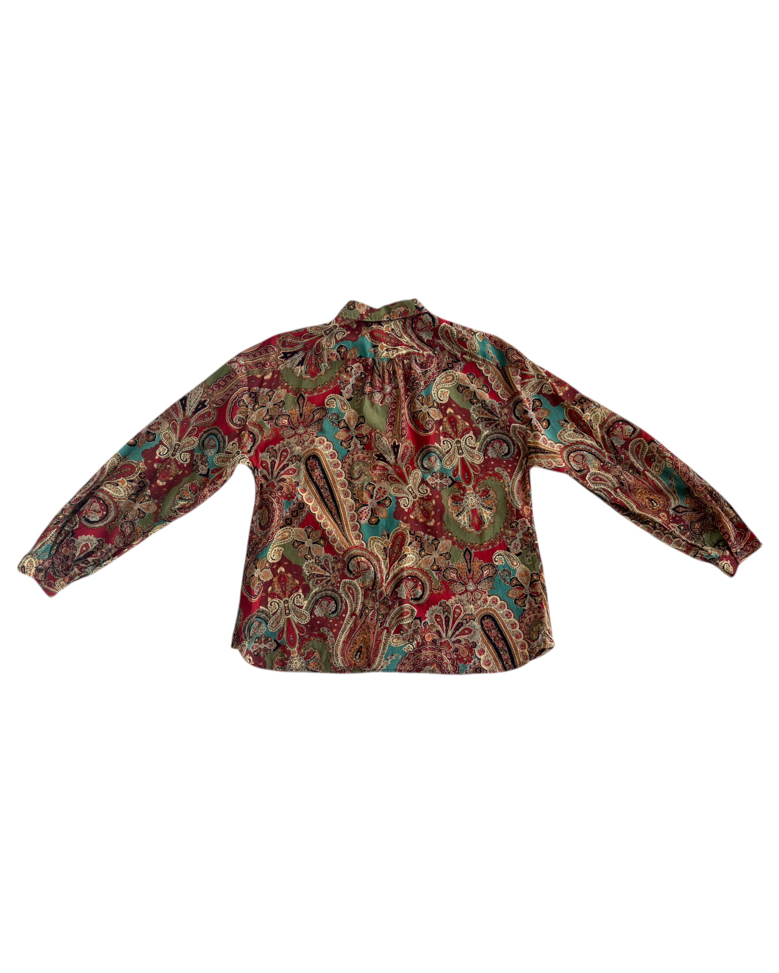 CAMISA CON PRINT DE MANDALA Y FLORES EN TONOS TIERRA, 100% ALGODON. BOTONES CAFES PEQUEÑOS EN EL MEDIO. NO TIENE DETALLES, EN PERFECTO ESTADO.