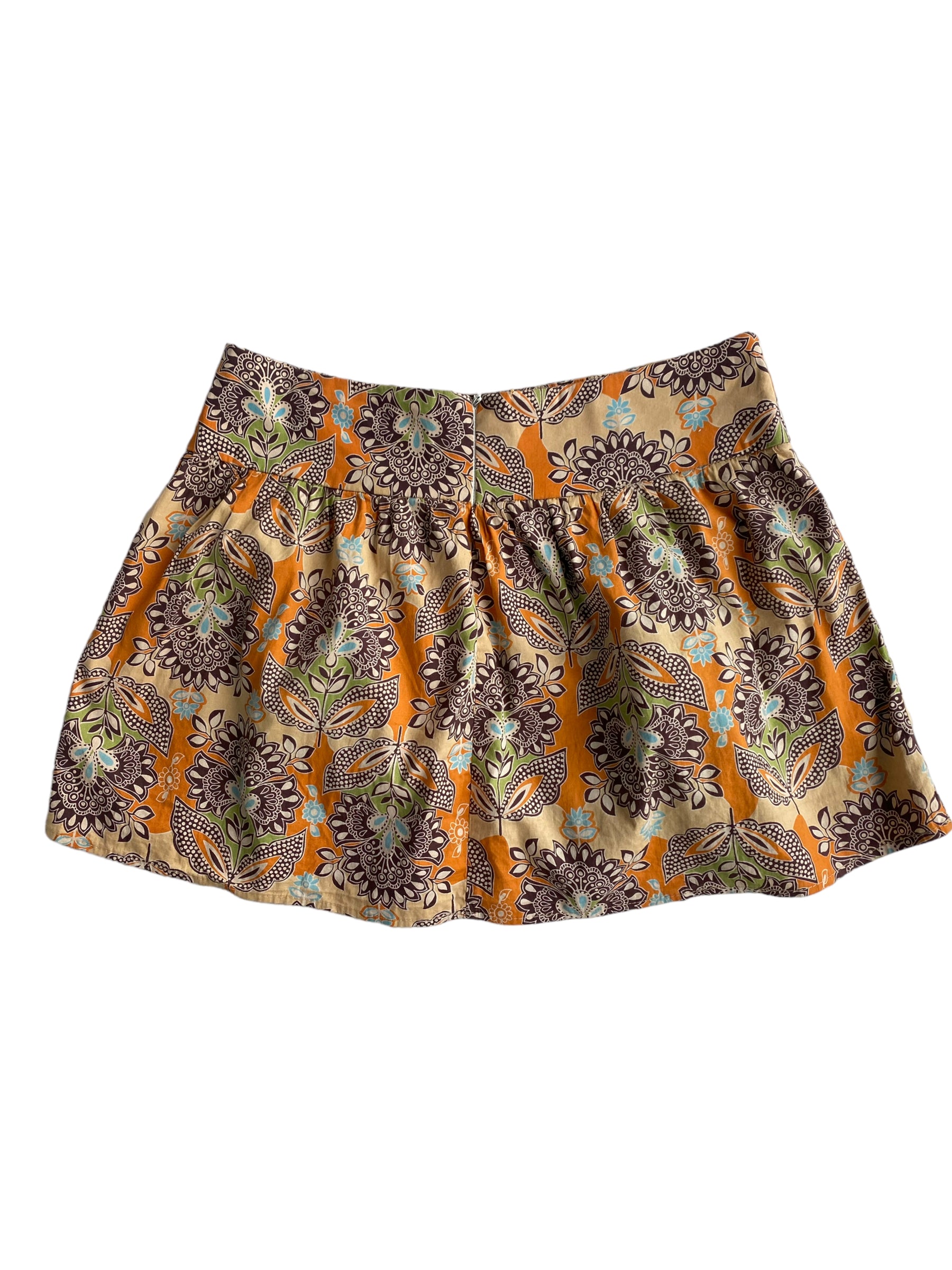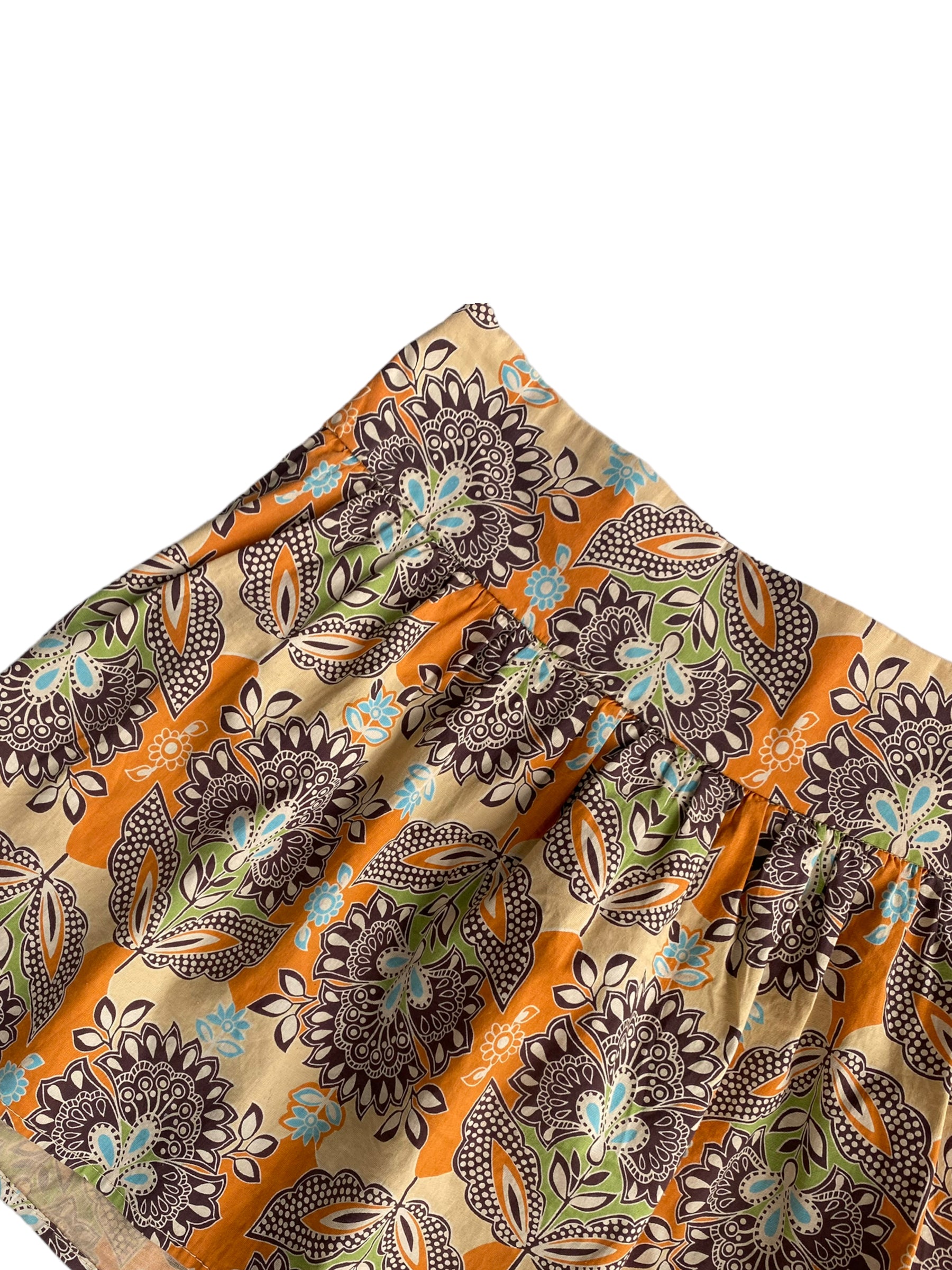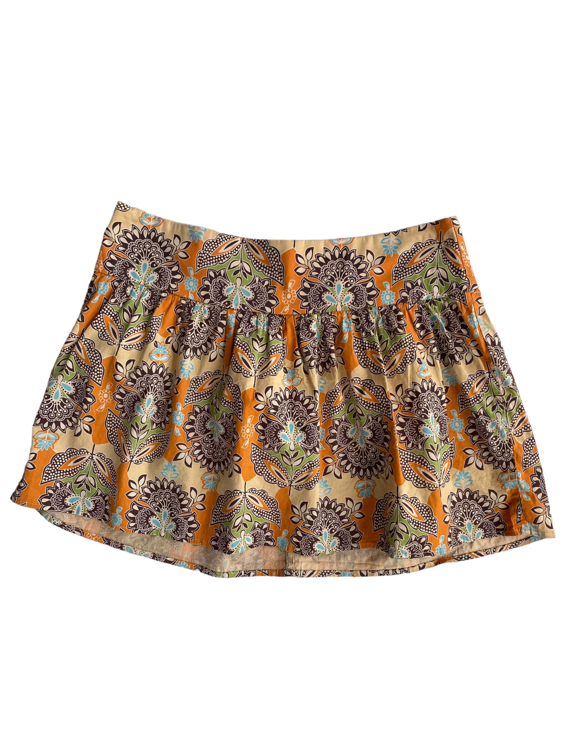 FALDA MINI DE PRINT DE FLORES NARANJA, CAFE, VERDE Y AZUL. CIERRE TRASERO Y BANDA PARA CUBRIR EL ABDOMEN. 97% ALGODON Y 3% SPANDEX. SIN DETALLES DE USO.