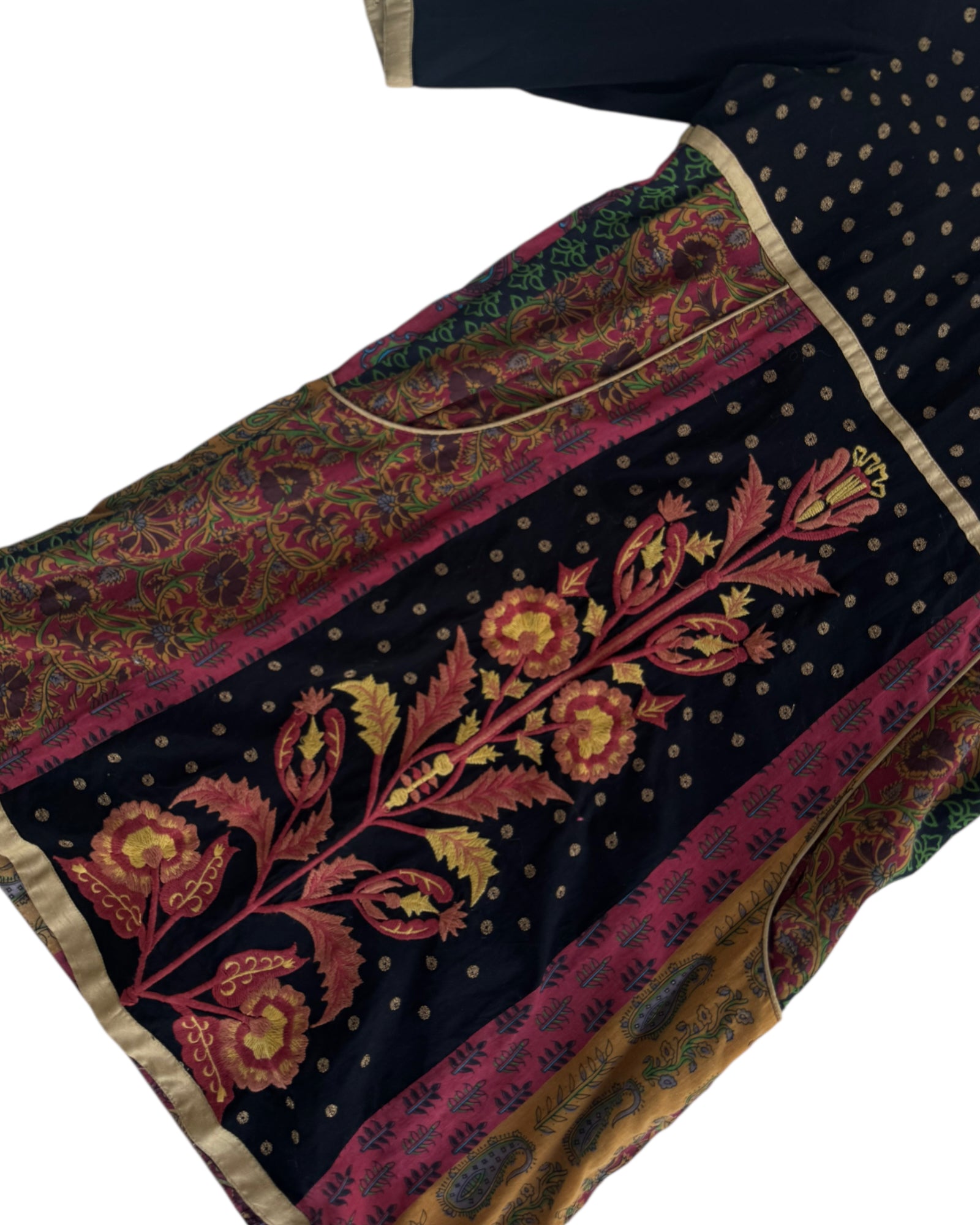 VESTIDO MINI ESTILO LINO EN COLOR NEGRO CON PRINT DE MANDALAS Y BORDADOS DE FLORES Y ESPIRALES EN COLOR DORADO Y CORAL. BOLSILLOS DELANTEROS FUNCIONALES, MANGA TRES CUARTOS. NO TIENE DETALLES, EN PERFECTO ESTADO.
