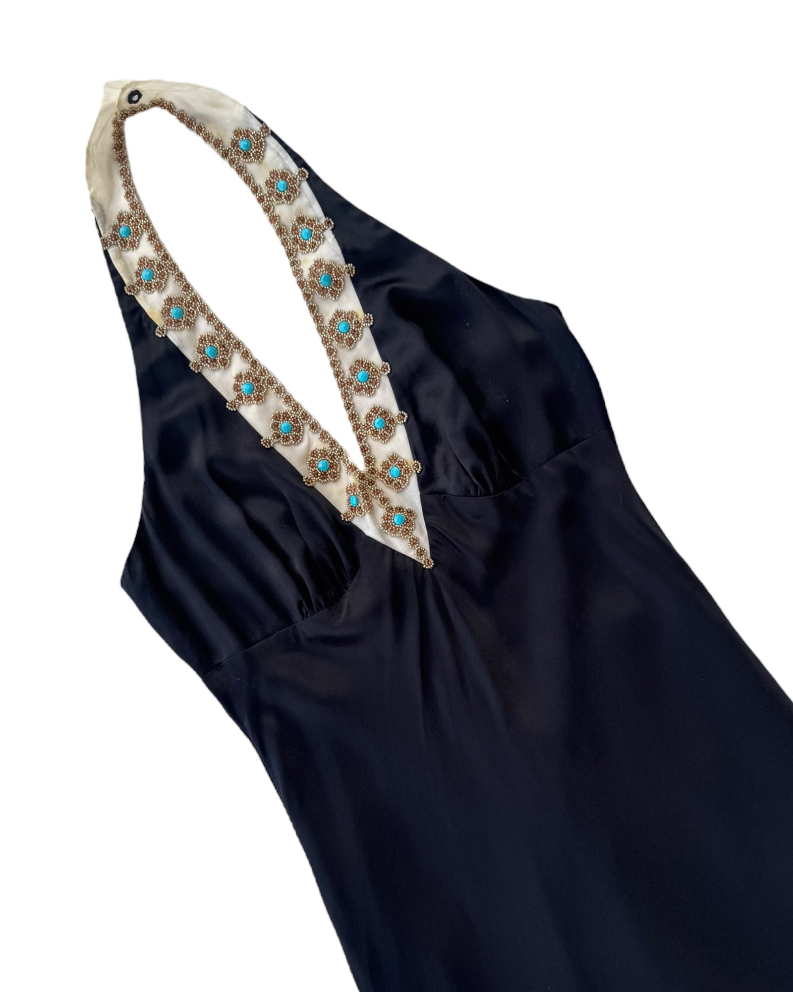 VESTIDO NEGRO ESTILO SEDA CON CUELLO HALTER Y ESPALDA DESCUBIERTA, EN LA PARTE DEL CUELLO PEDRERIA DORADA CON CAFE Y AZUL, NO TIENE DETALLES, EN PERFECTO ESTADO.
