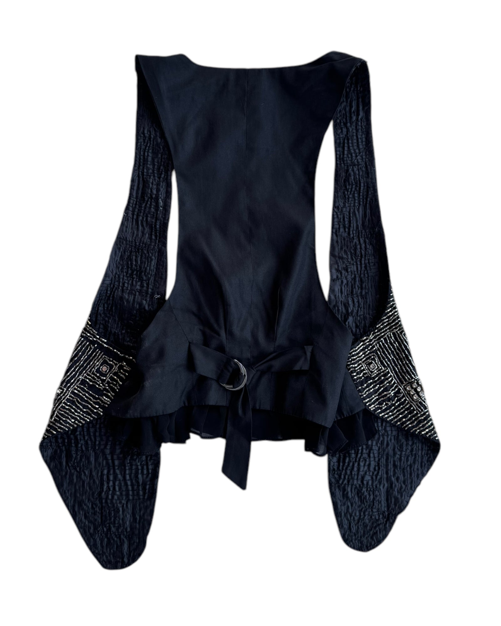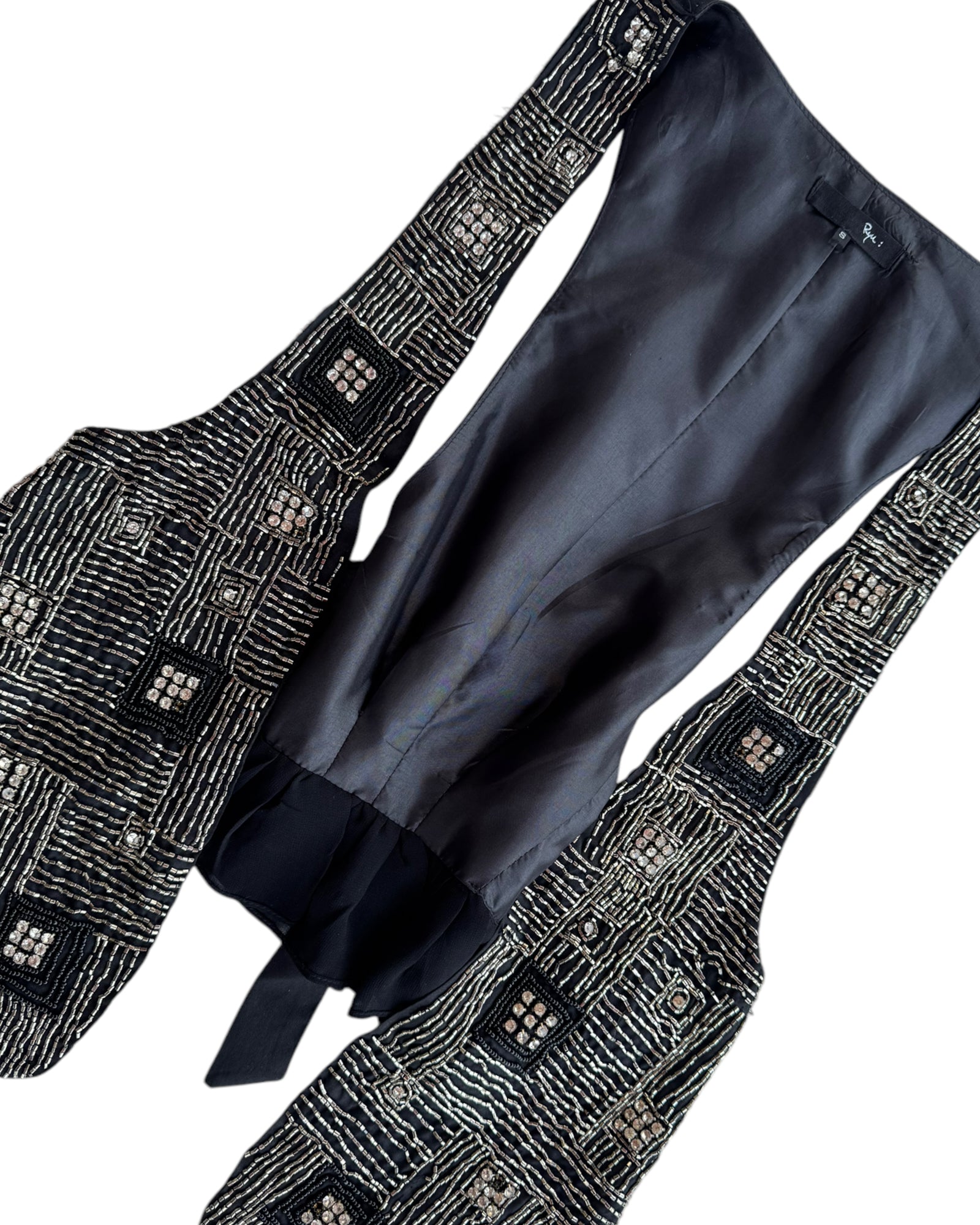 CLAECO SIN BOTONES 100% POLYESTER NEGRO CON CUENTAS DORADAS EN DISEÑO GEOMETRICO, CINTA AJUSTABLE EN LA PARTE DE ATRAS. NO TIENE DETALLES.